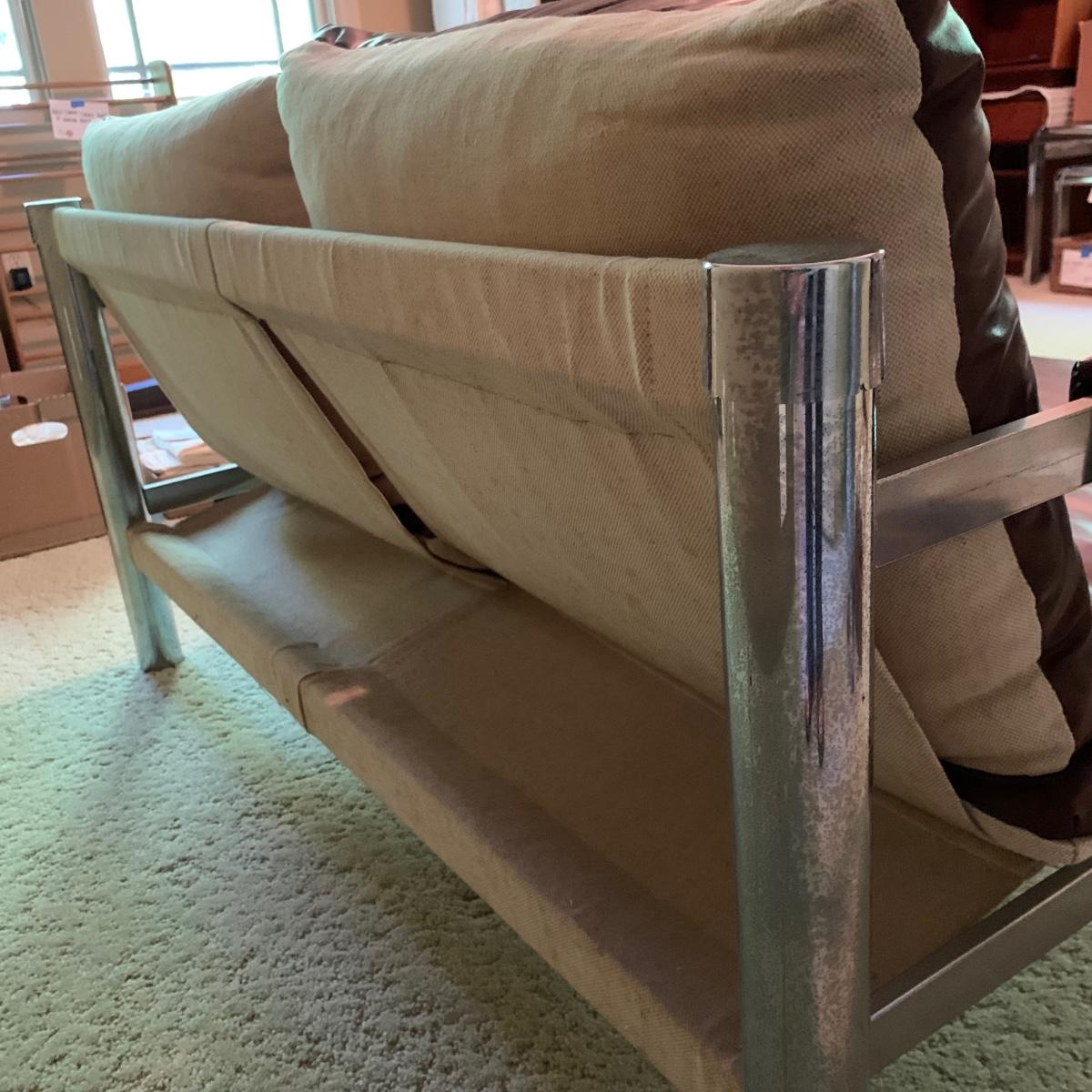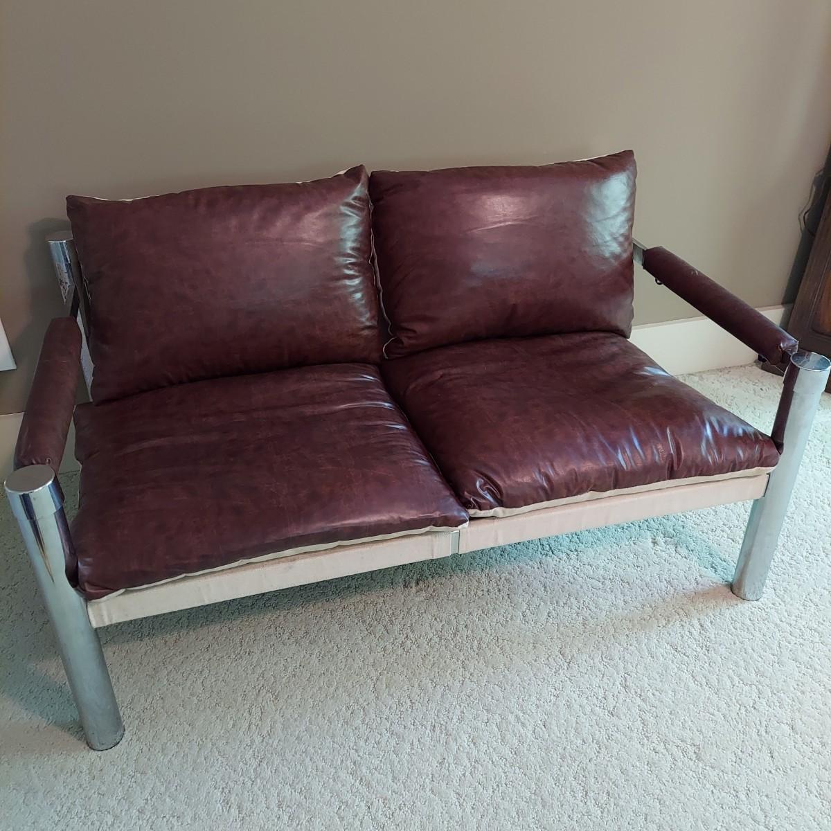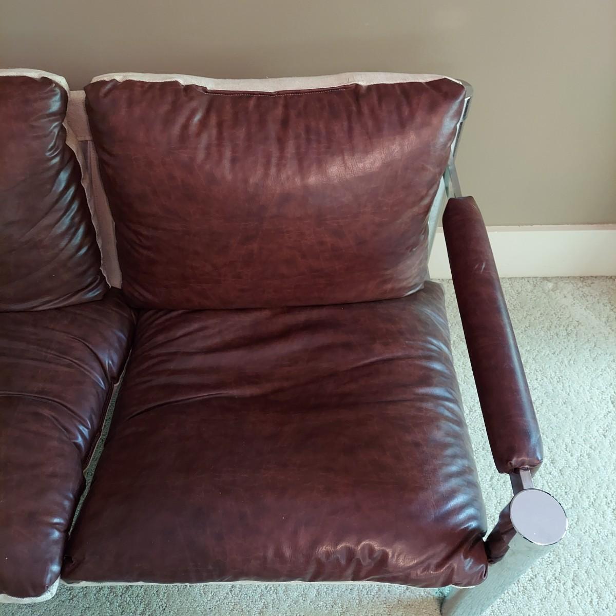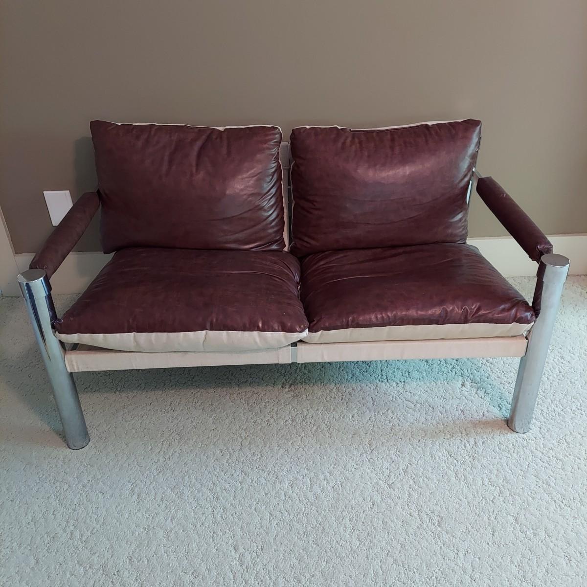 Modern style chrome and leather sling-style loveseat. No visible makers mark. Appears to be vintage based on the build and the wear to the piece. All four cushions are removable. Each has a leather side and a canvas cloth side. There are some spots on the backsides of the cushions. Some of the plastic leg caps are missing. There is some rust speckle on the chrome. Measures approximately 50" x 30" x 24"H with a seat height of 17". Local Pickup Only.