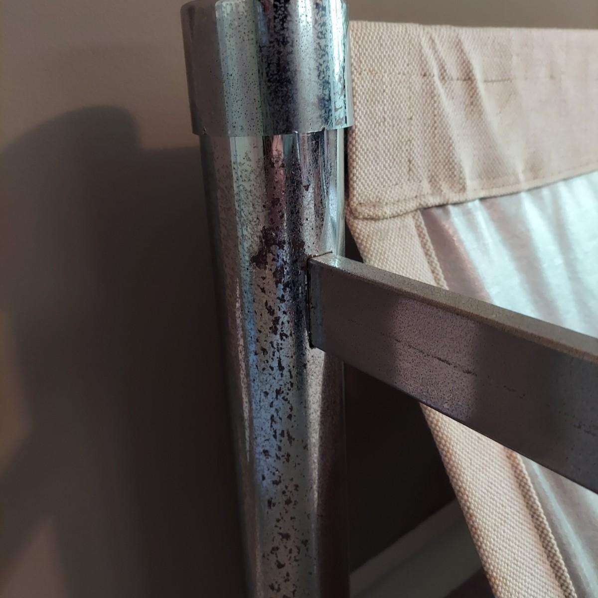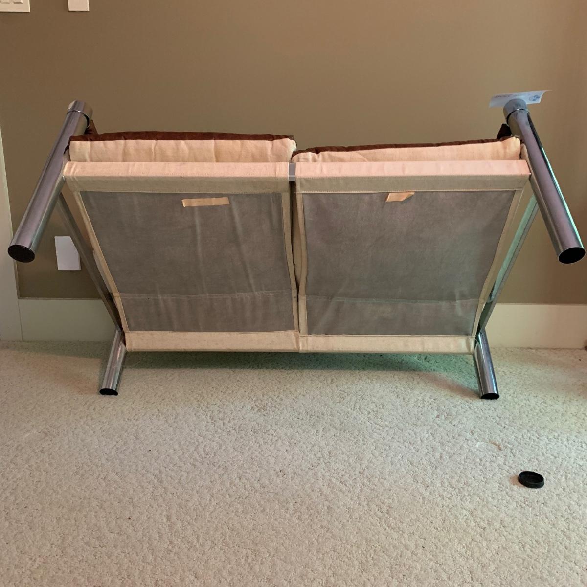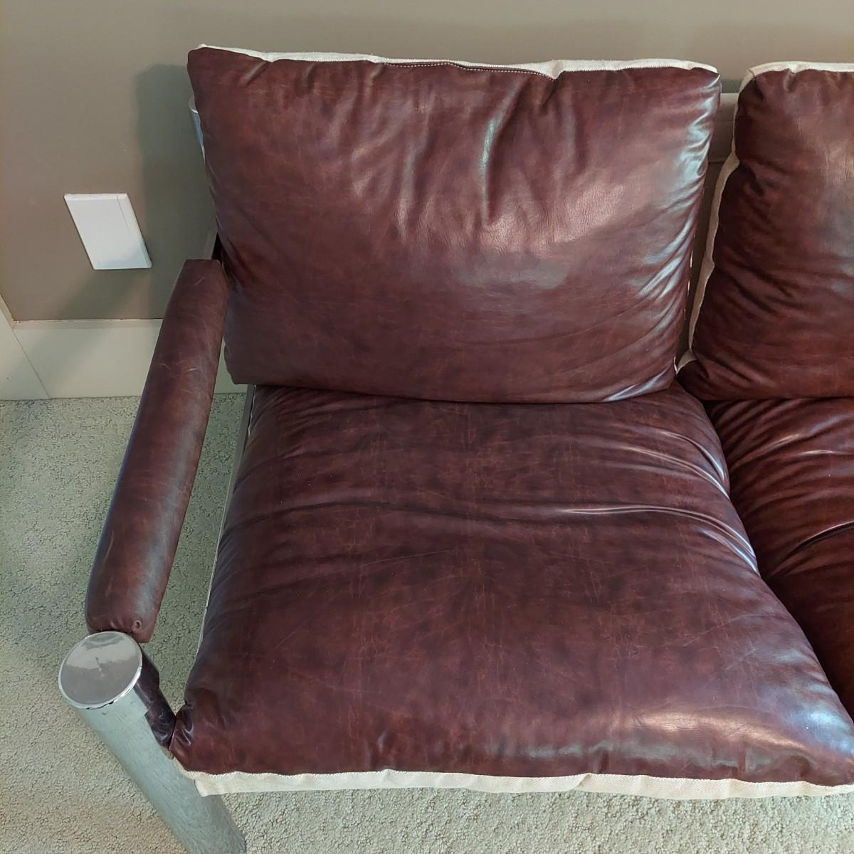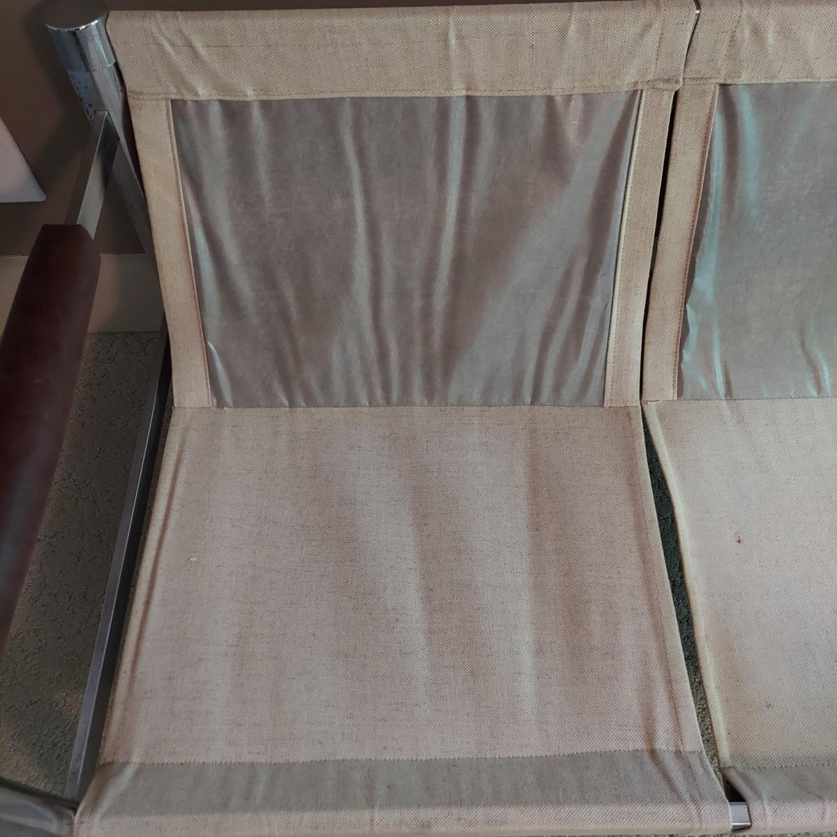 Modern style chrome and leather sling-style loveseat. No visible makers mark. Appears to be vintage based on the build and the wear to the piece. All four cushions are removable. Each has a leather side and a canvas cloth side. There are some spots on the backsides of the cushions. Some of the plastic leg caps are missing. There is some rust speckle on the chrome. Measures approximately 50" x 30" x 24"H with a seat height of 17". Local Pickup Only.