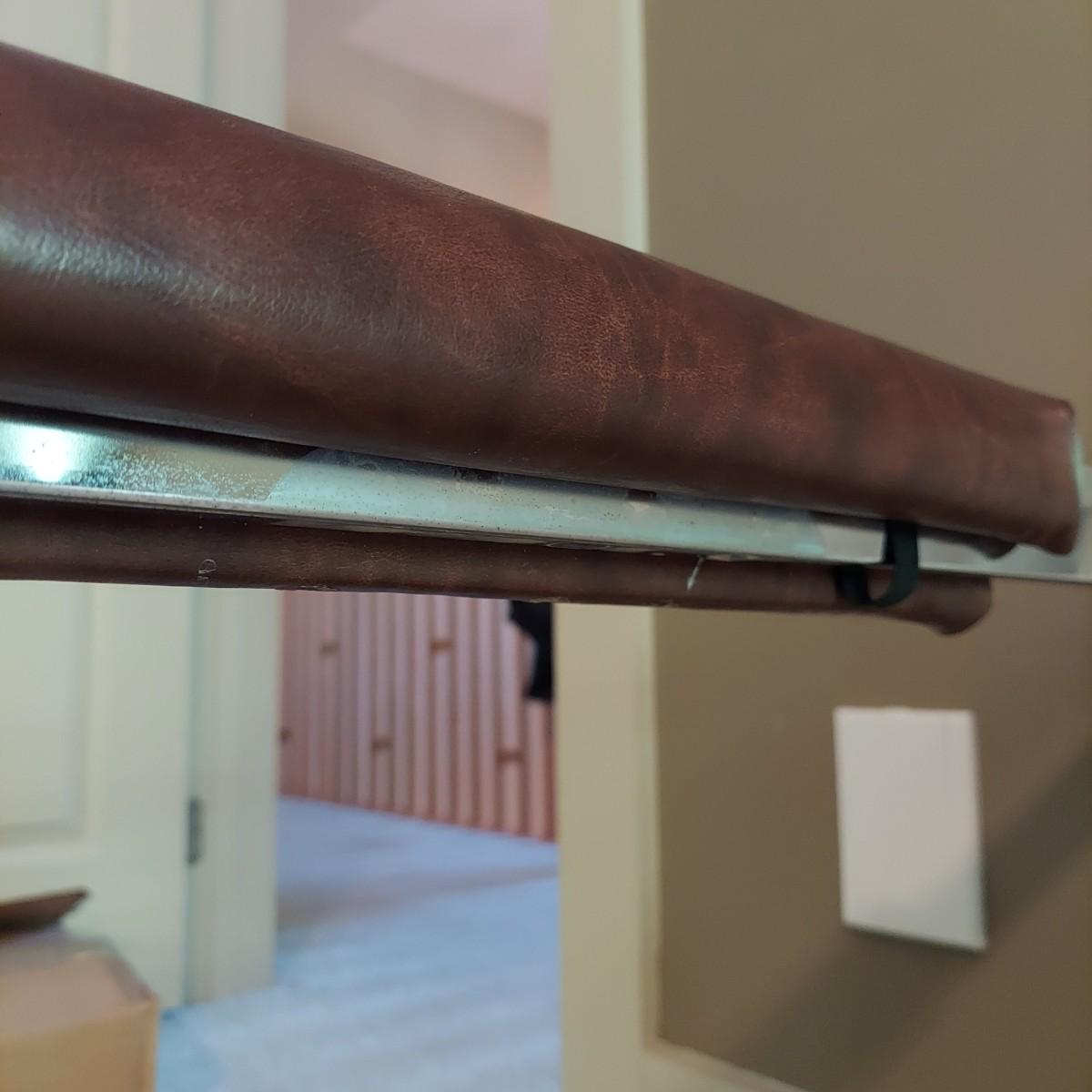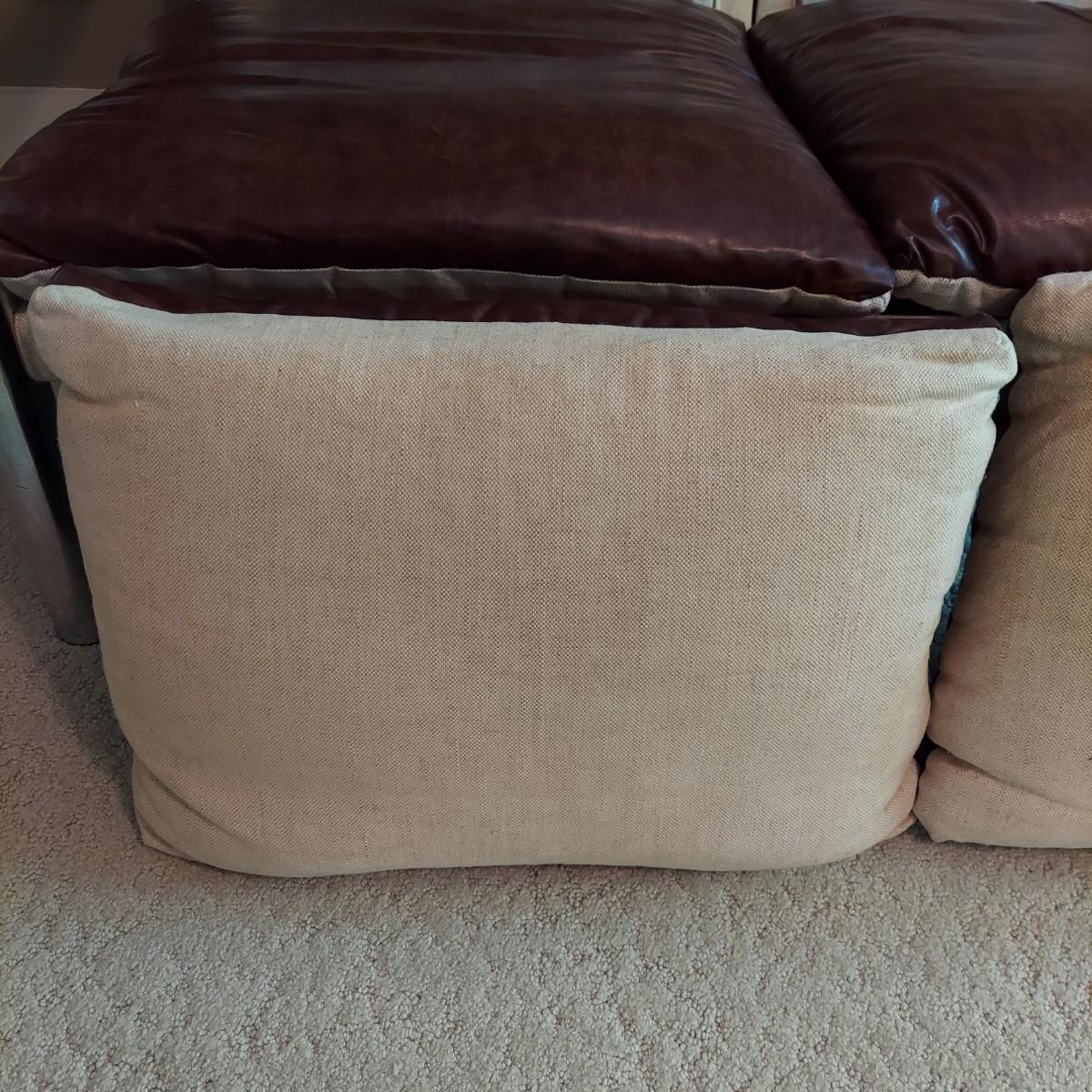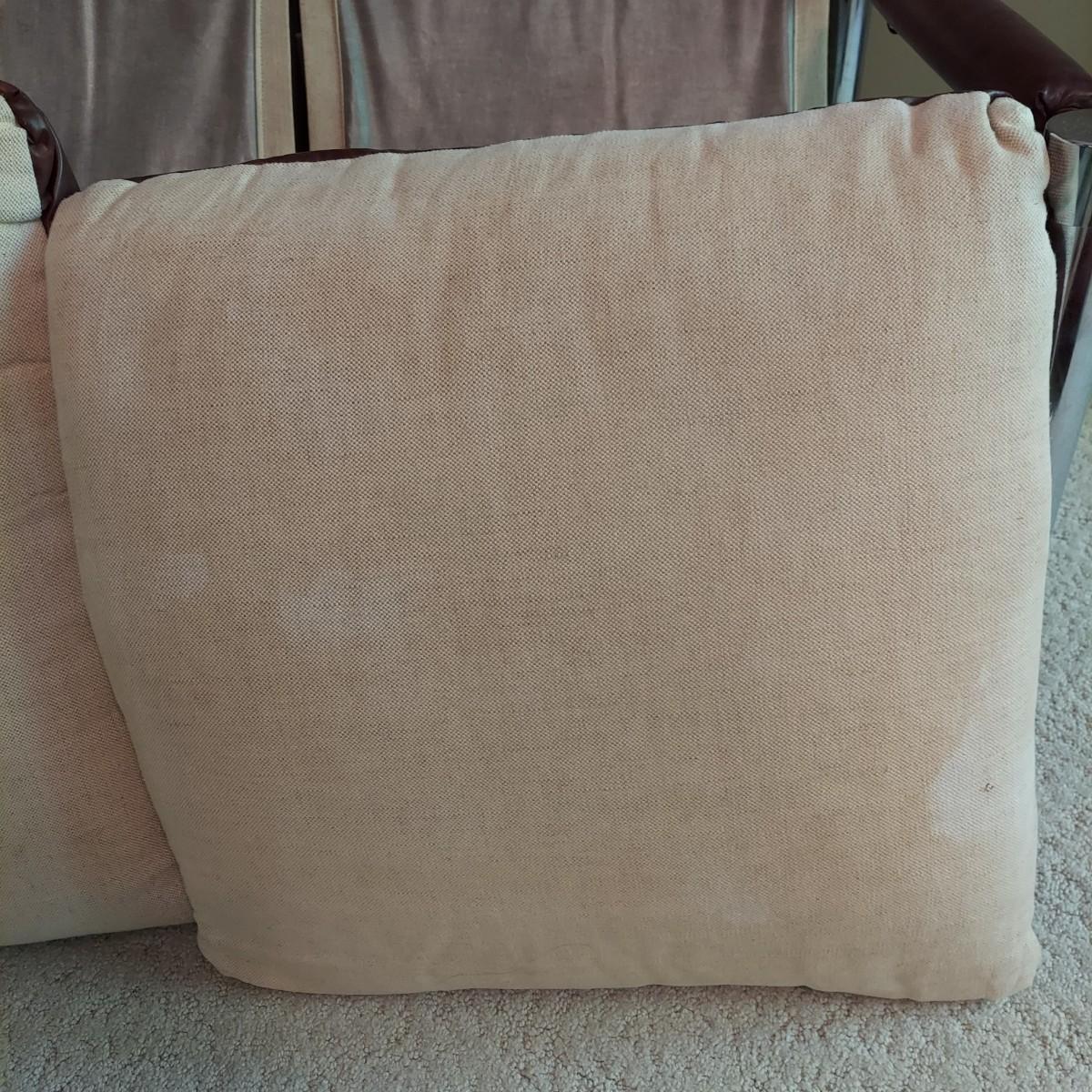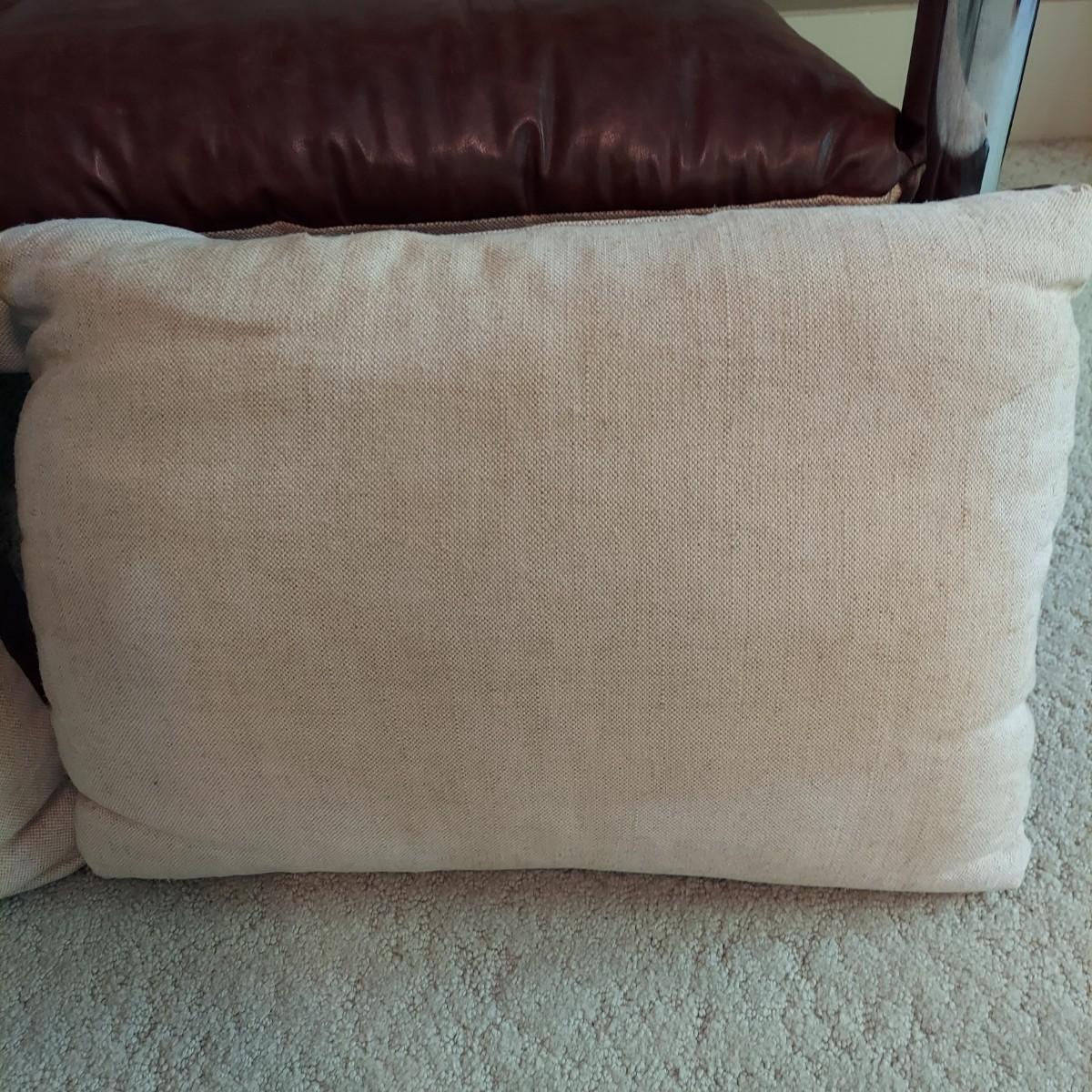 Modern style chrome and leather sling-style loveseat. No visible makers mark. Appears to be vintage based on the build and the wear to the piece. All four cushions are removable. Each has a leather side and a canvas cloth side. There are some spots on the backsides of the cushions. Some of the plastic leg caps are missing. There is some rust speckle on the chrome. Measures approximately 50" x 30" x 24"H with a seat height of 17". Local Pickup Only.