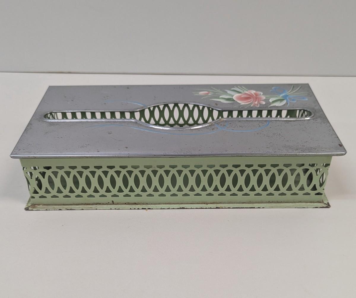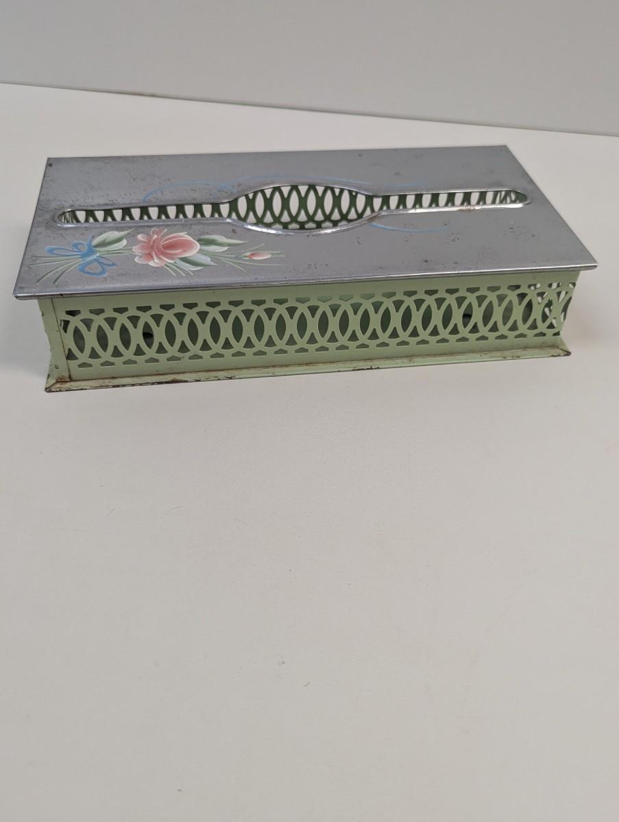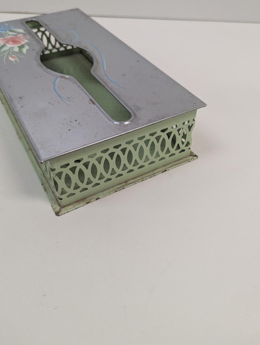 Vintage Chrome & Green Floral Hand Painted Tissue Box Wall Hanging