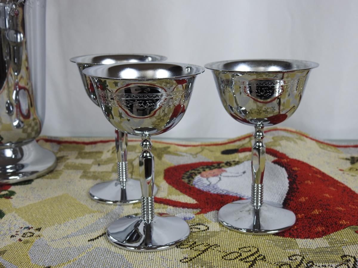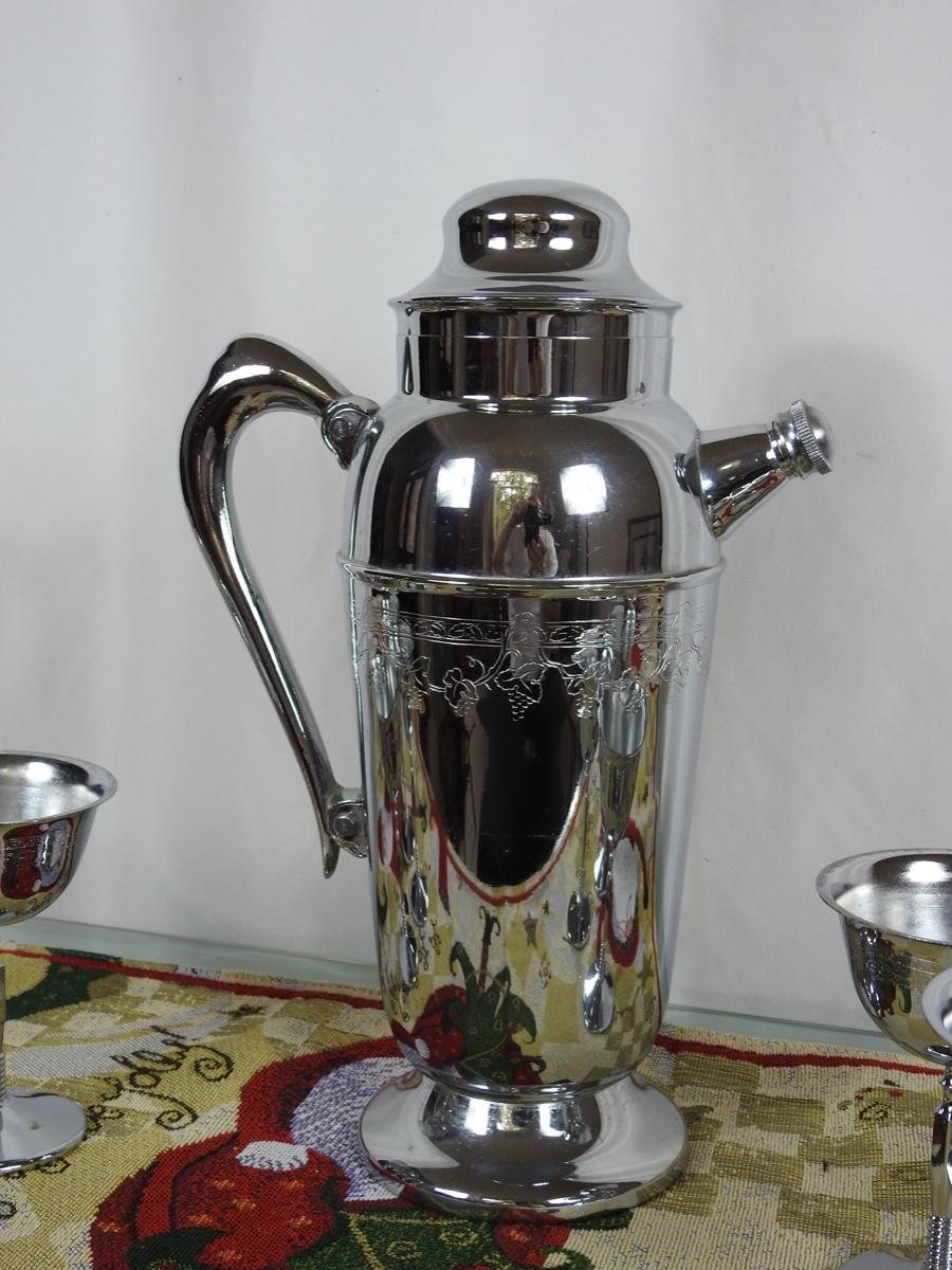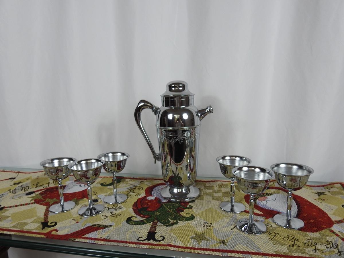 1930's Chrome Tea Pot Style Chrome Cocktail Shaker with 6 glasses. Shaker is 11.5" tall, glasses are 5" tall. Great set