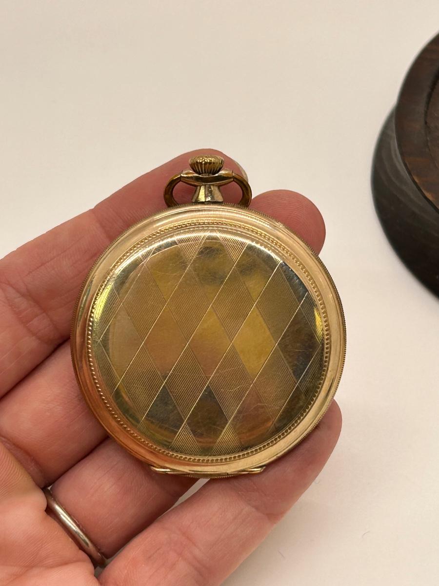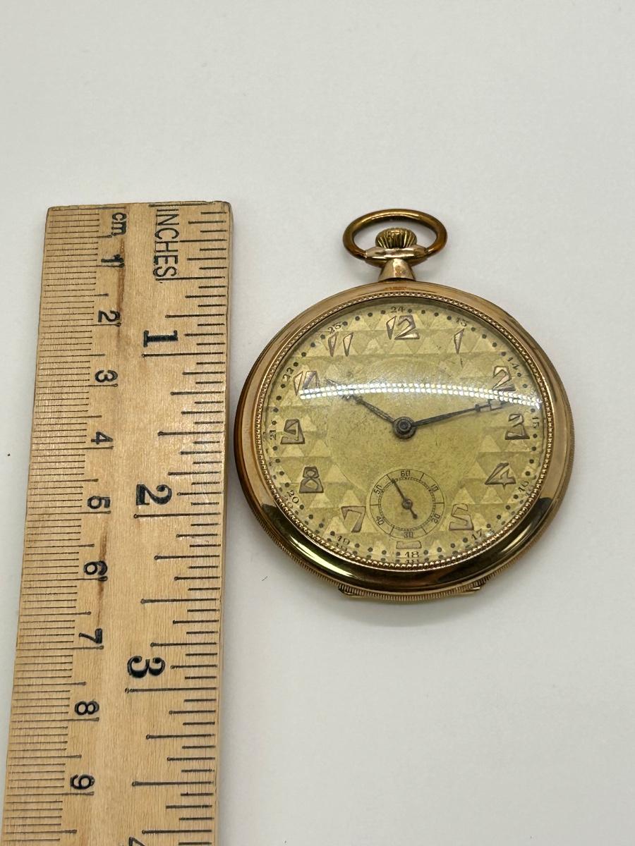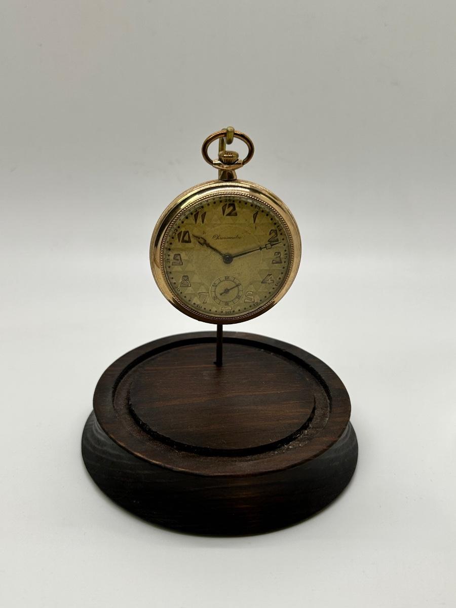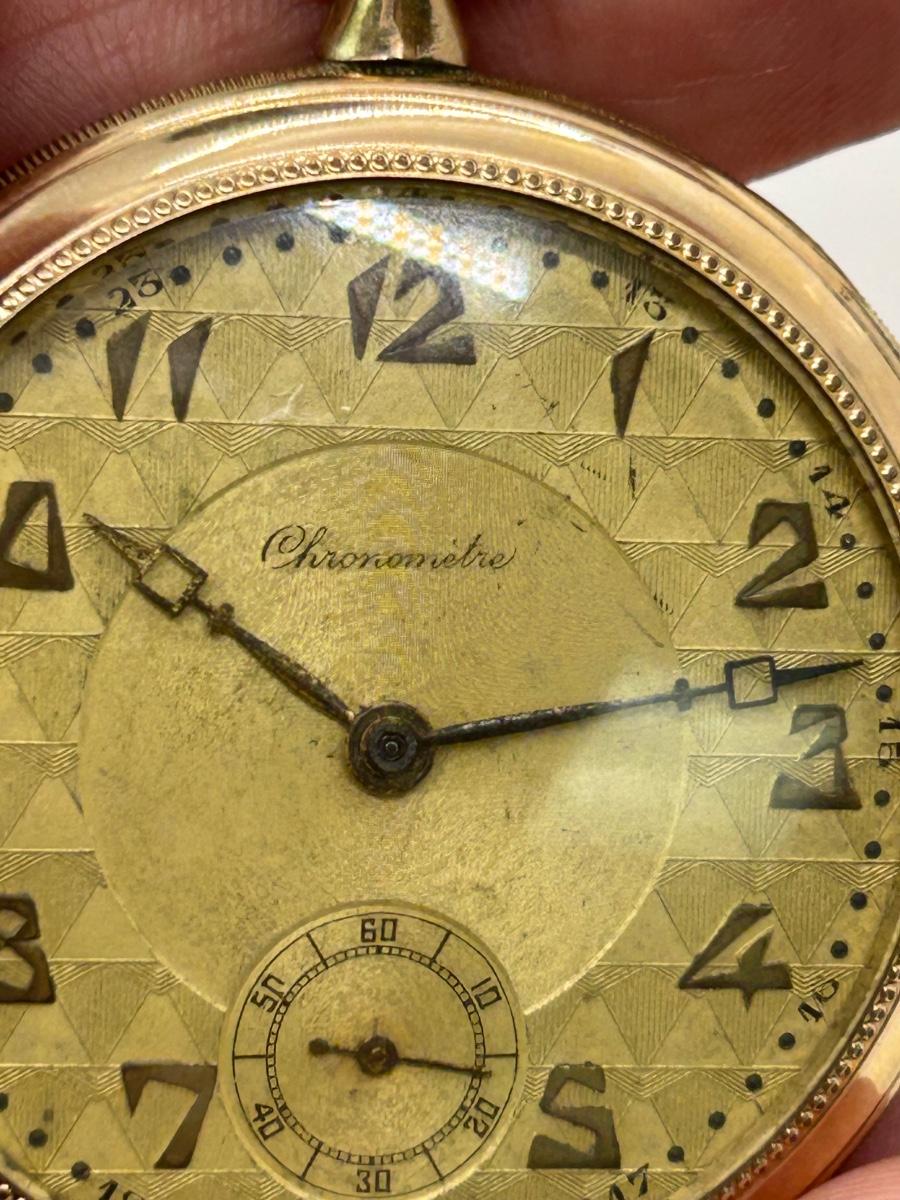 Vintage Chronometre Open Face Pocket Watch Running with Display Case. In good vintage condition. Opened back, it was given as a service gift back in the early 1930s. No gold marks, but other etchings and stamped marks, may be gold fill. Works.