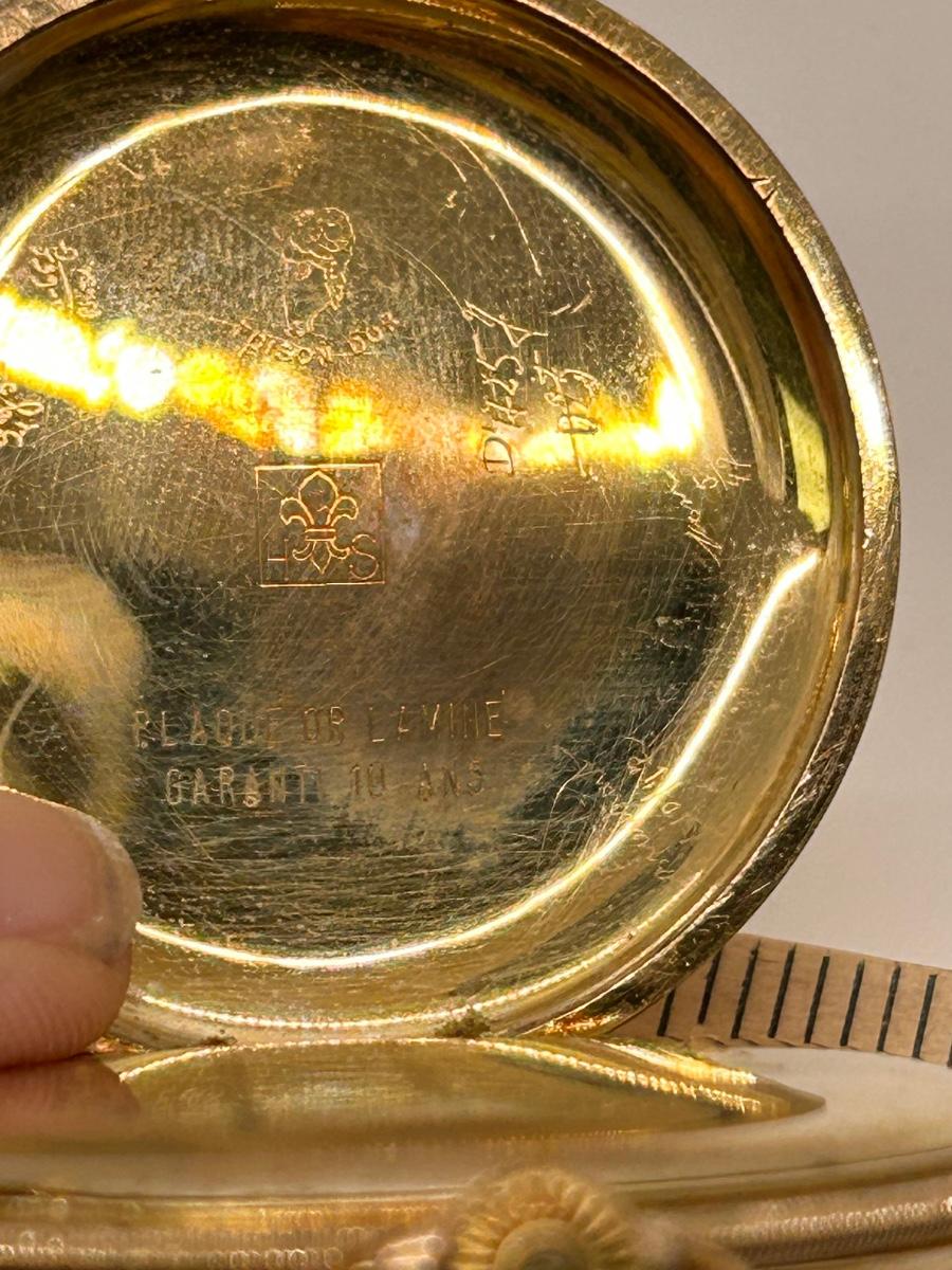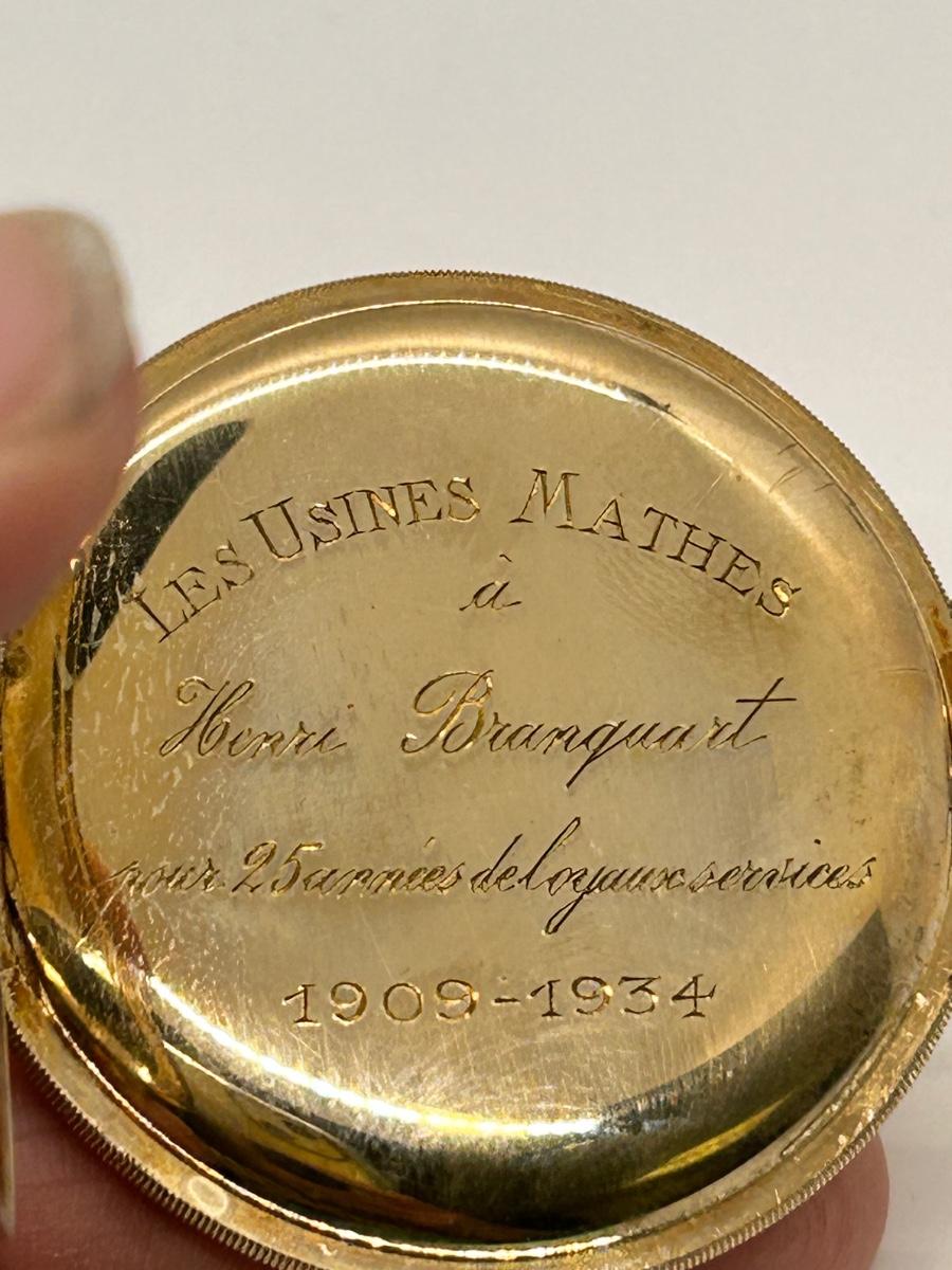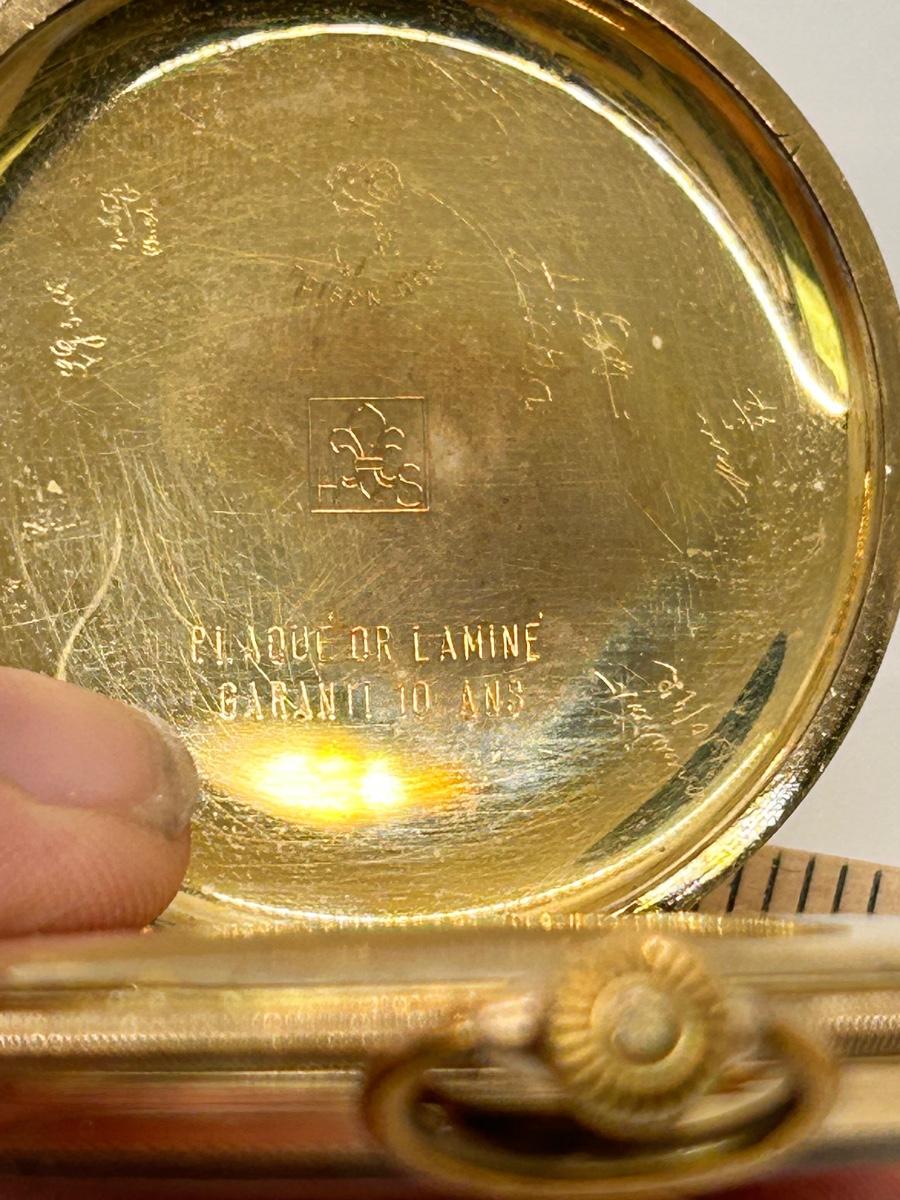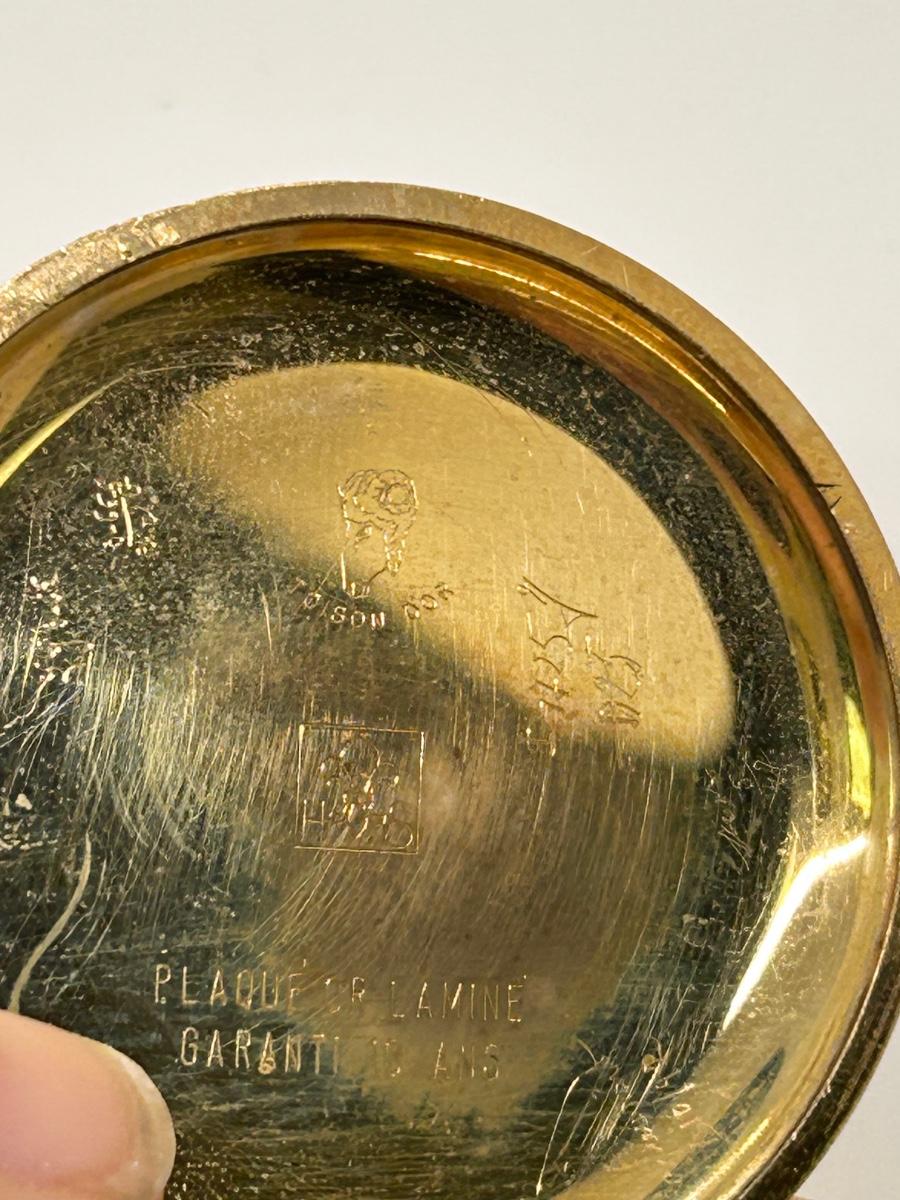 Vintage Chronometre Open Face Pocket Watch Running with Display Case. In good vintage condition. Opened back, it was given as a service gift back in the early 1930s. No gold marks, but other etchings and stamped marks, may be gold fill. Works.