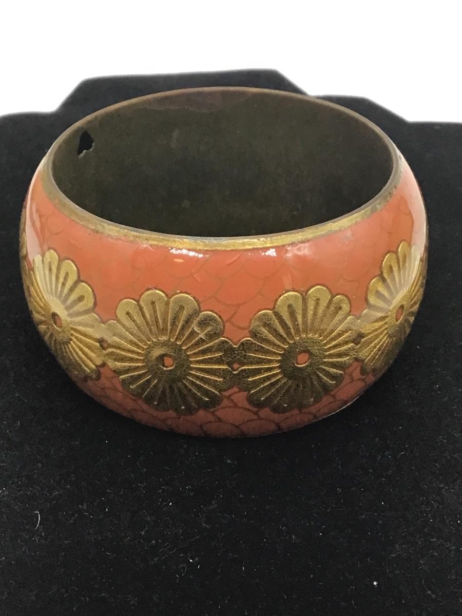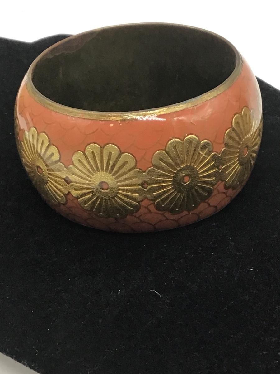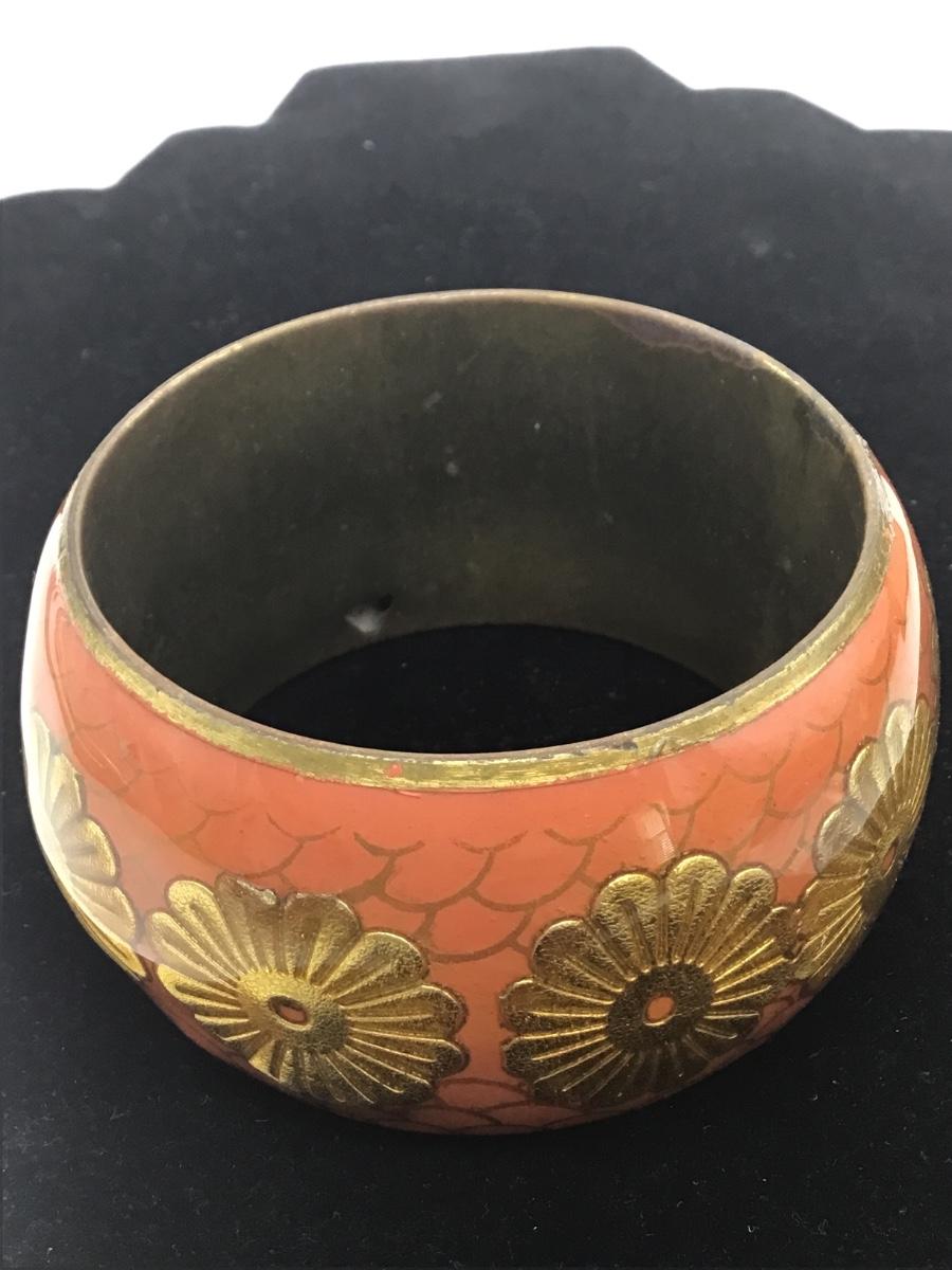 Vintage Chunky Brass Metal Enamel Flower Bangle Bracelet Signed Cut Out Heart