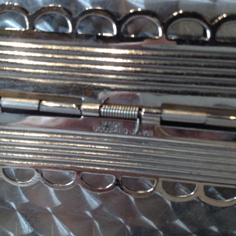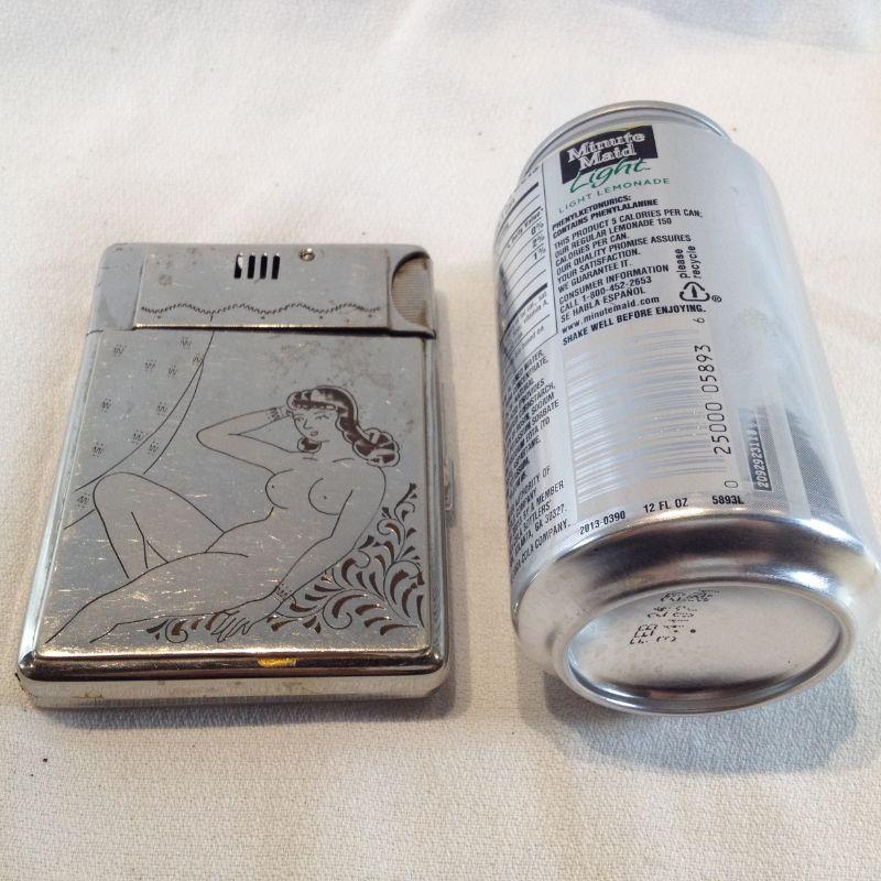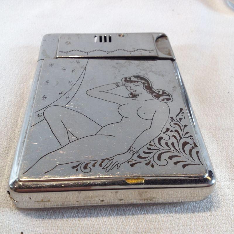This very unique, stainless steel, "Naughty" cigarette case was made in Occupied Japan. It also has it's own built in lighter. It has some scratches and wear consistent with age and use. Lighter appears unused and it is untested by us. This is very cool. The starting bid is $10.00.