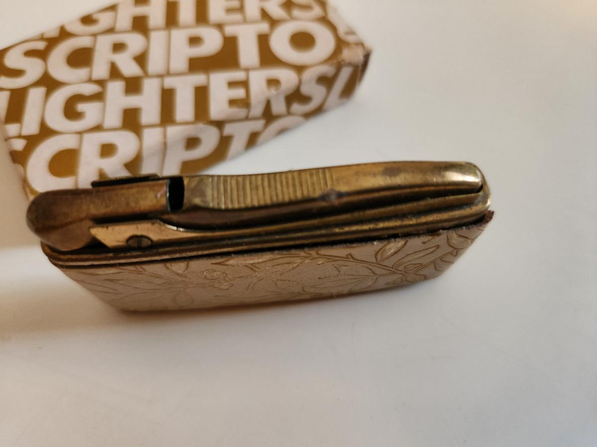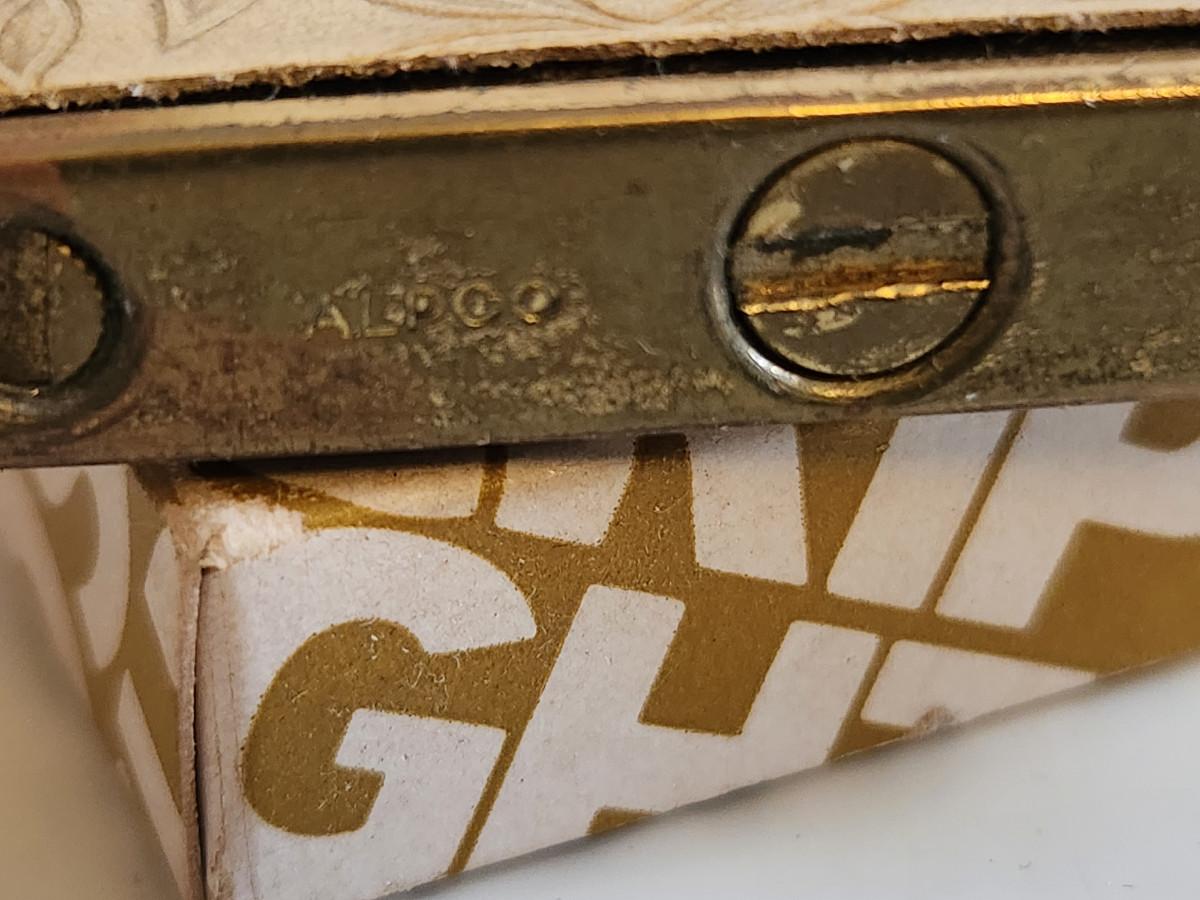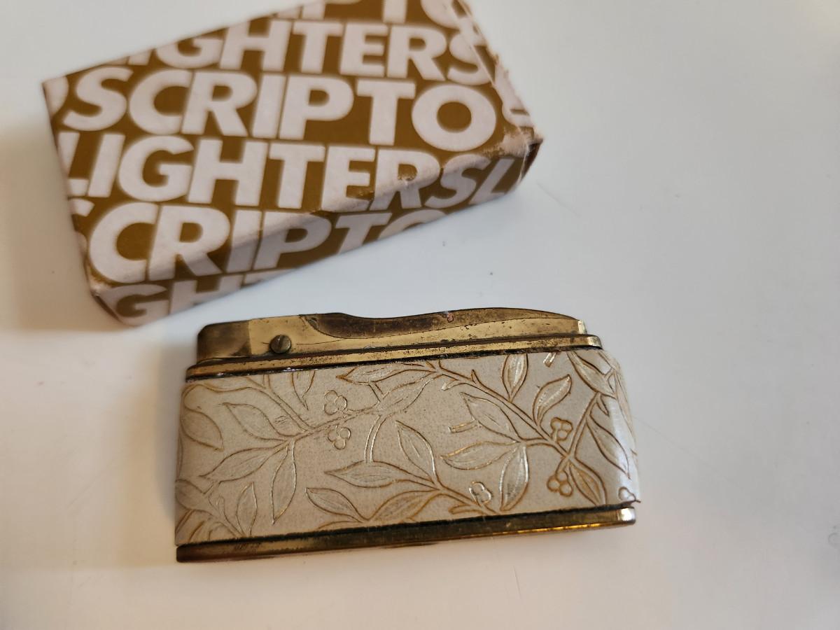 This auction lot is for a Vintage Cigarette Lighter. The lighter is marked Alpco on the bottom. We found it in the Scripto box, but it is not made by that company. Interesting look, could work but seems to be slightly gummed up and needs a cleaning. Very 50's.