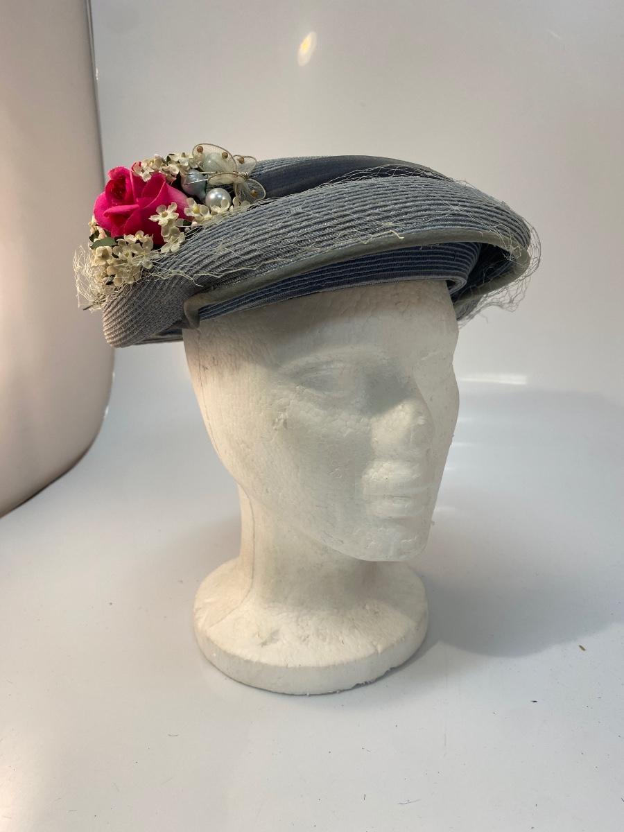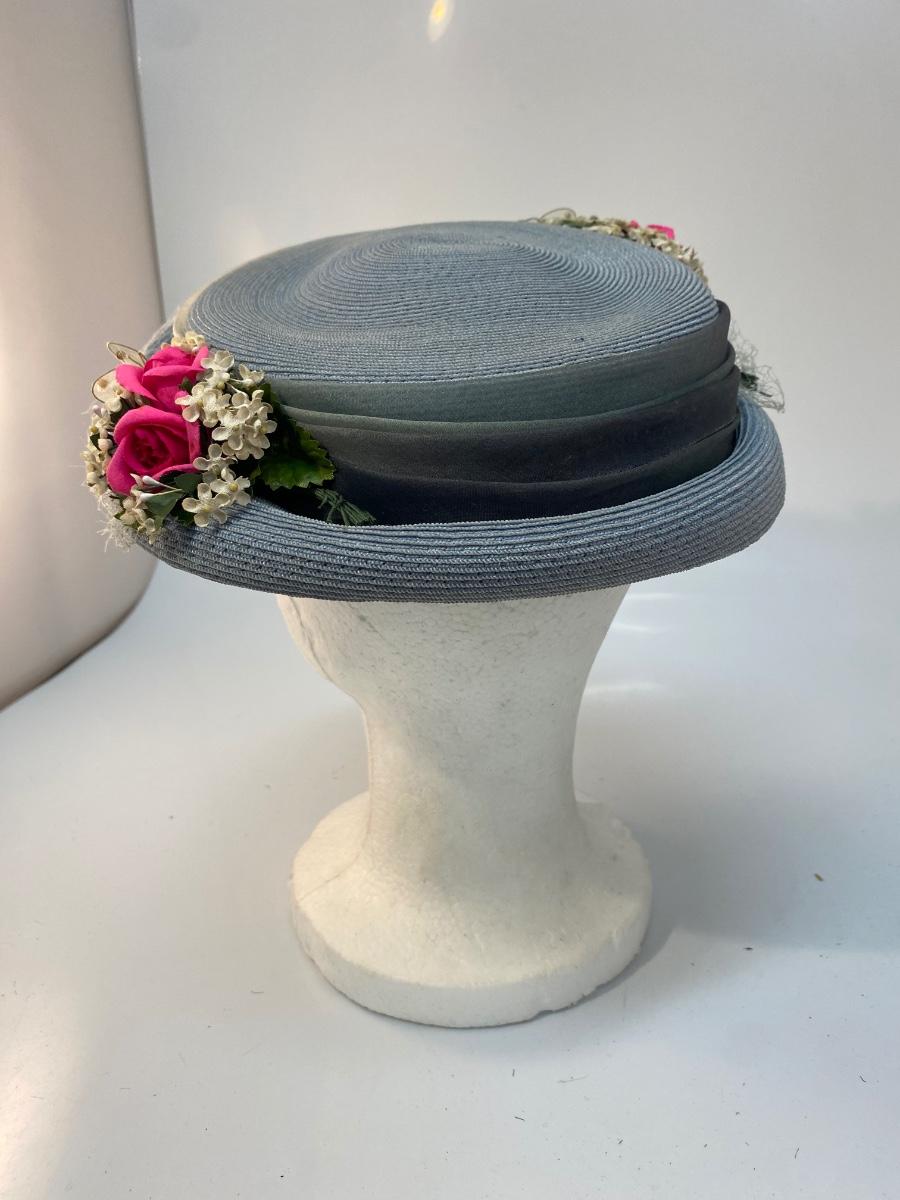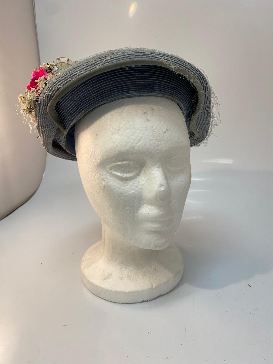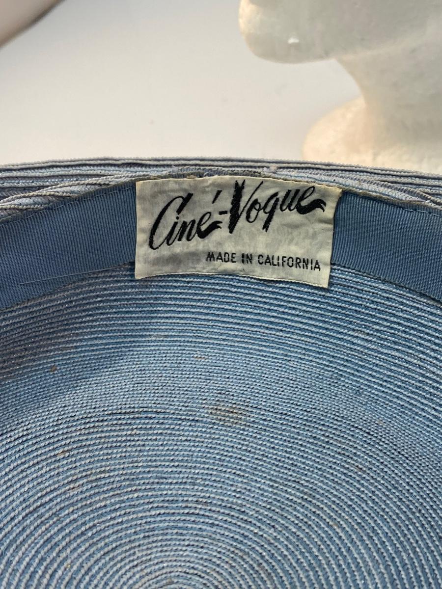 Vintage Cine-Vogue California Light Blue Woven Straw Tilt Pancake Hat. Some discolor from age but in overall good condition. The netting may be falling apart from age as well.