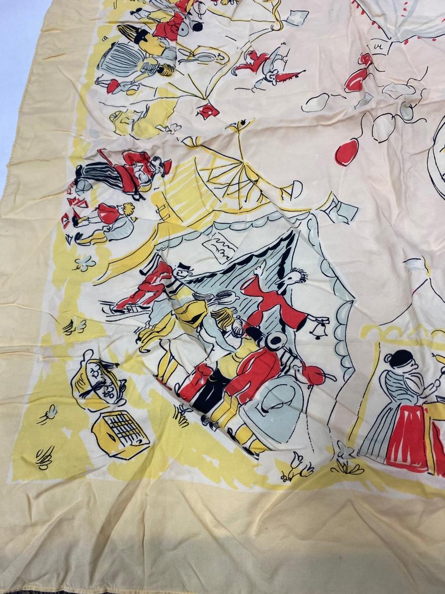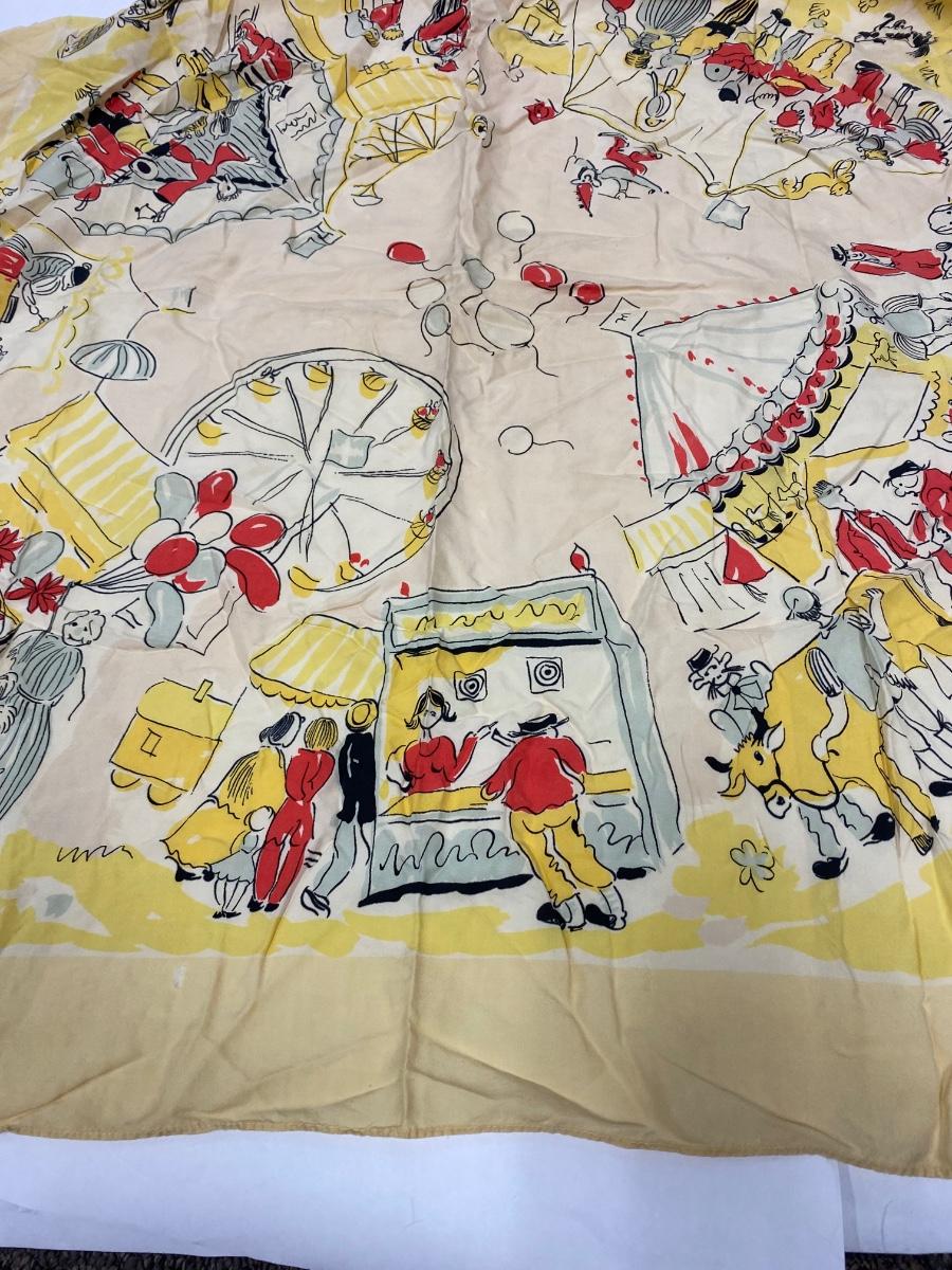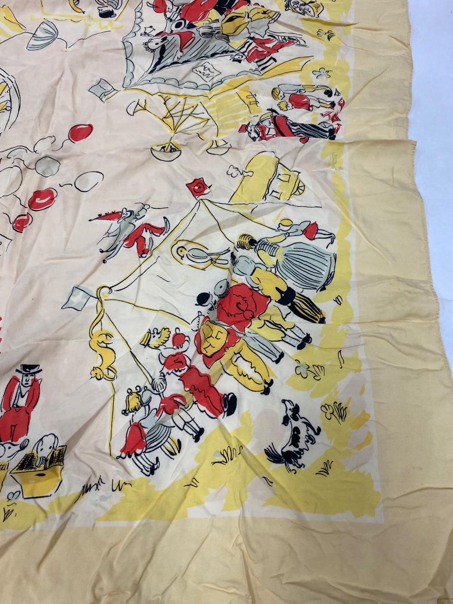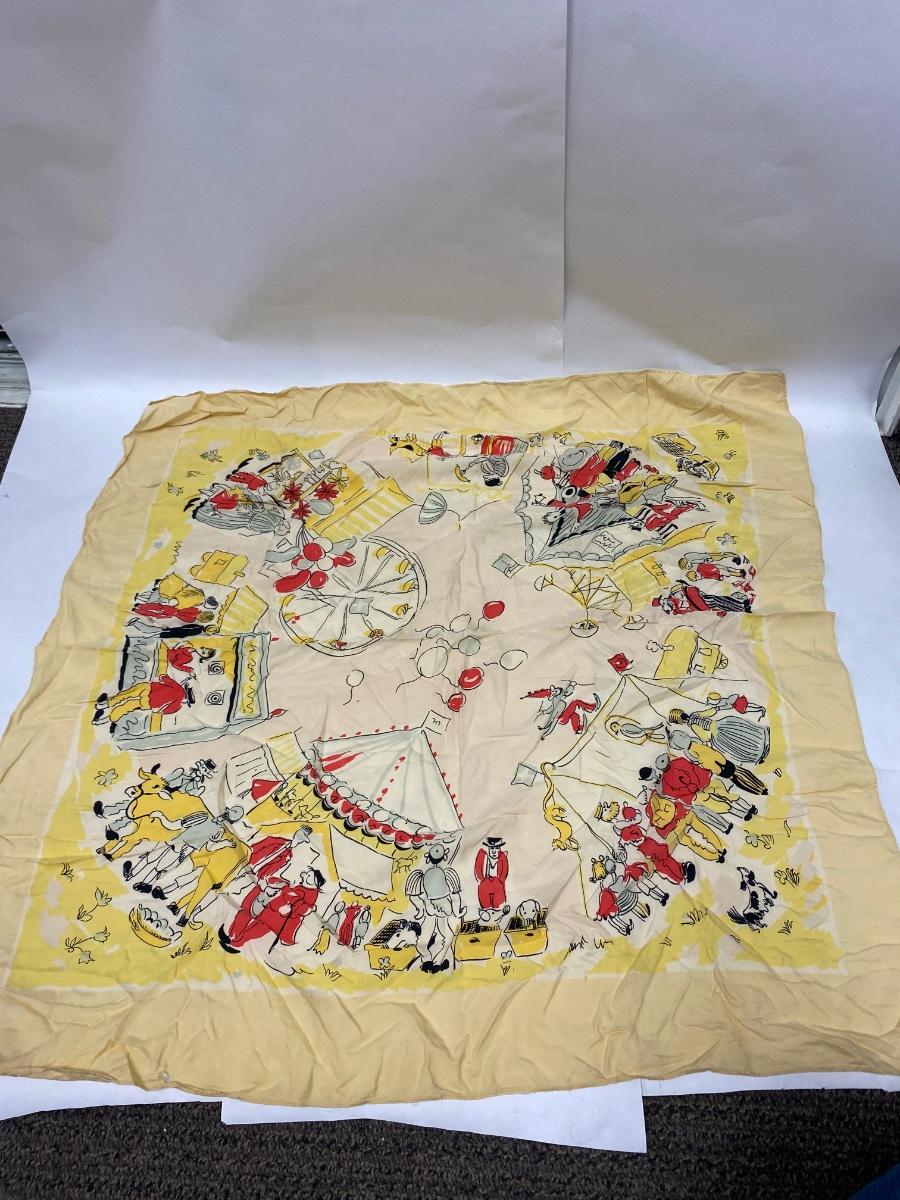 Vintage Circus Carnival Pattern Silk Scarf. Slight fade from age and a couple small holes. No brand name or signature found.