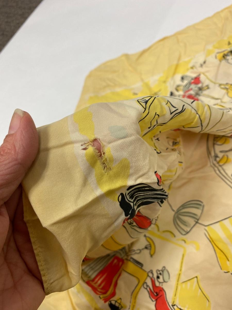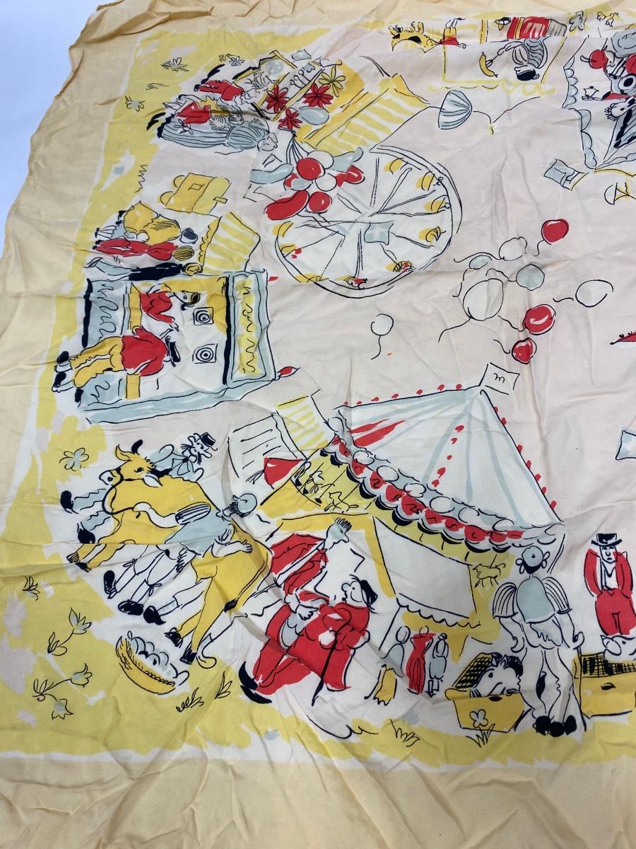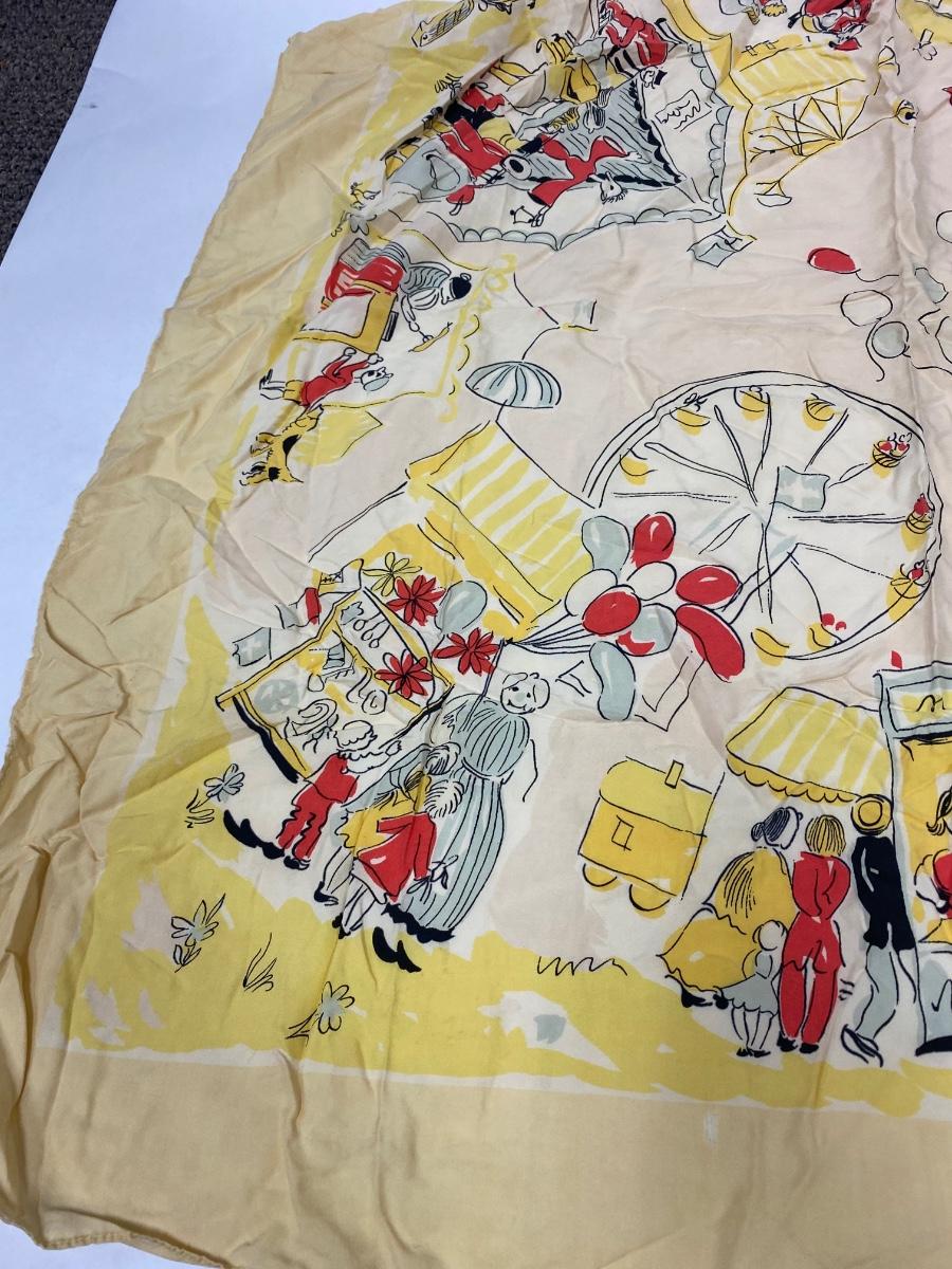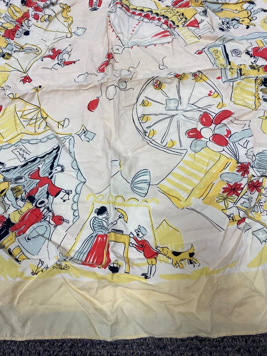 Vintage Circus Carnival Pattern Silk Scarf. Slight fade from age and a couple small holes. No brand name or signature found.