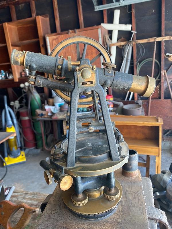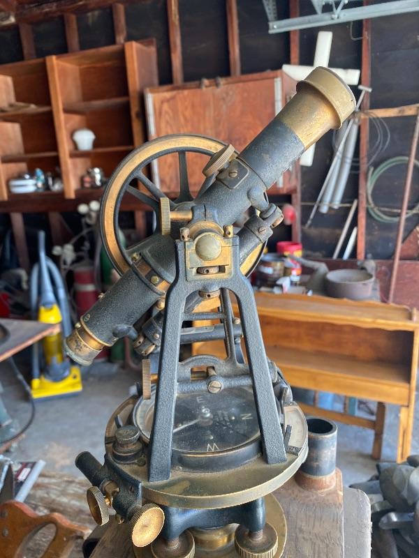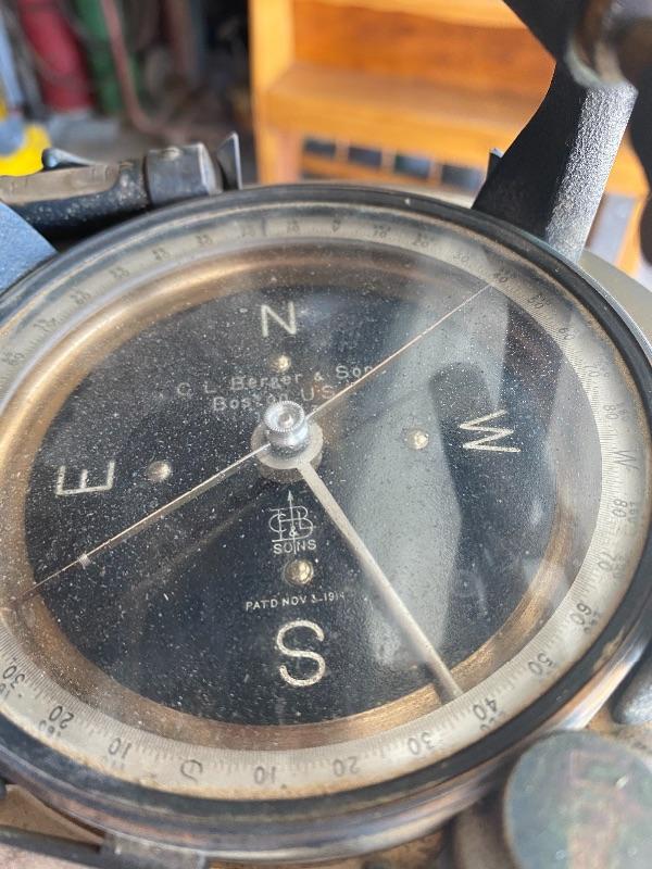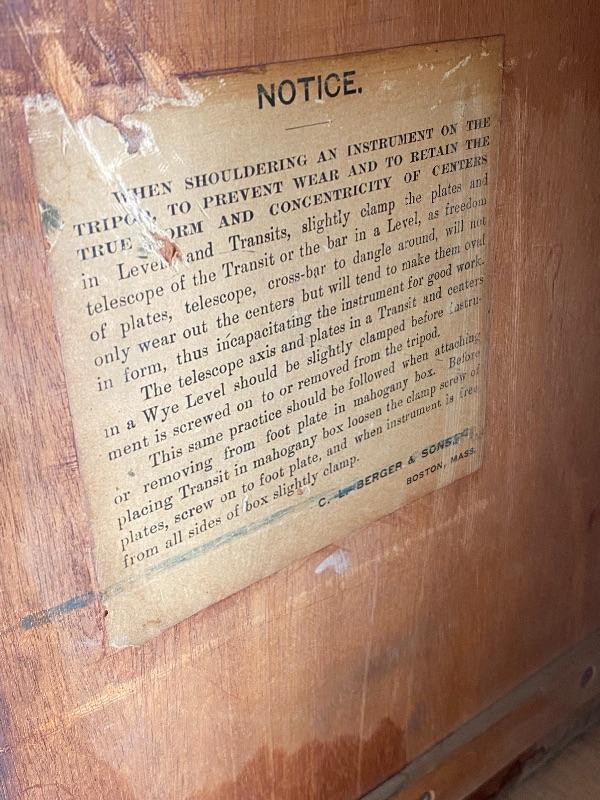 Vintage C.L. Berger & Sons surveying transit with wood storage case and tri-pod stand. Early 1900s. Looks to be in great condition. Displays wonderfully. All the levels still have fluid in them, no cracked glass. Wood case has leather carry strap and taped info on the inside. Company logo on the tri pod. Some signs of age as expected. True collector piece. **Shipping would require two boxes.**