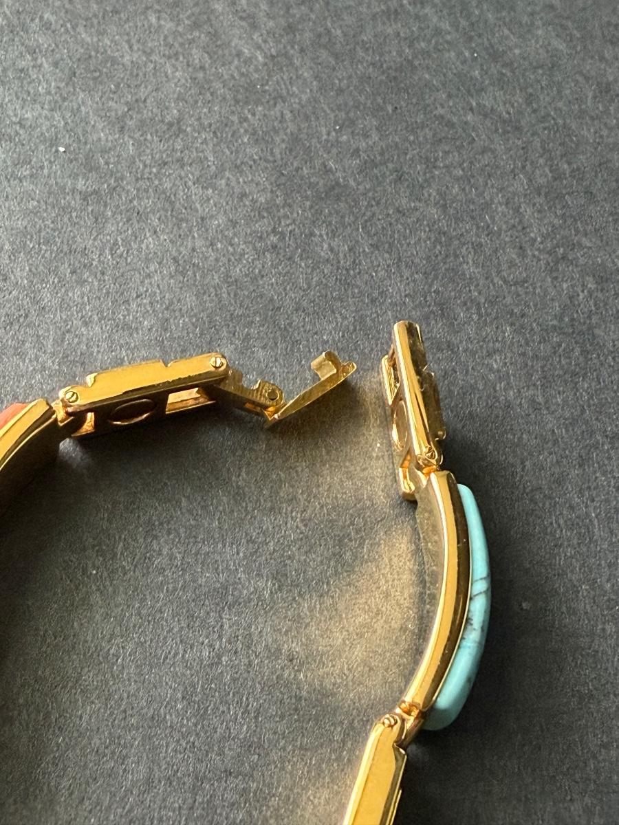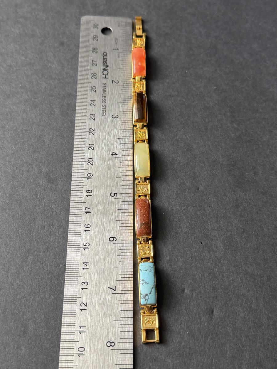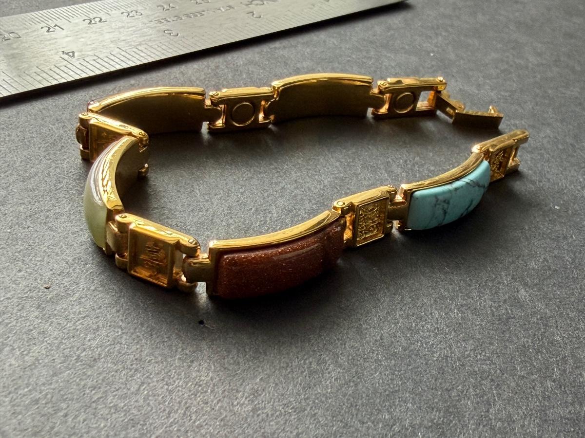 Vintage clasp gold-tone chain bracelet featuring rectangular multi-colored stones