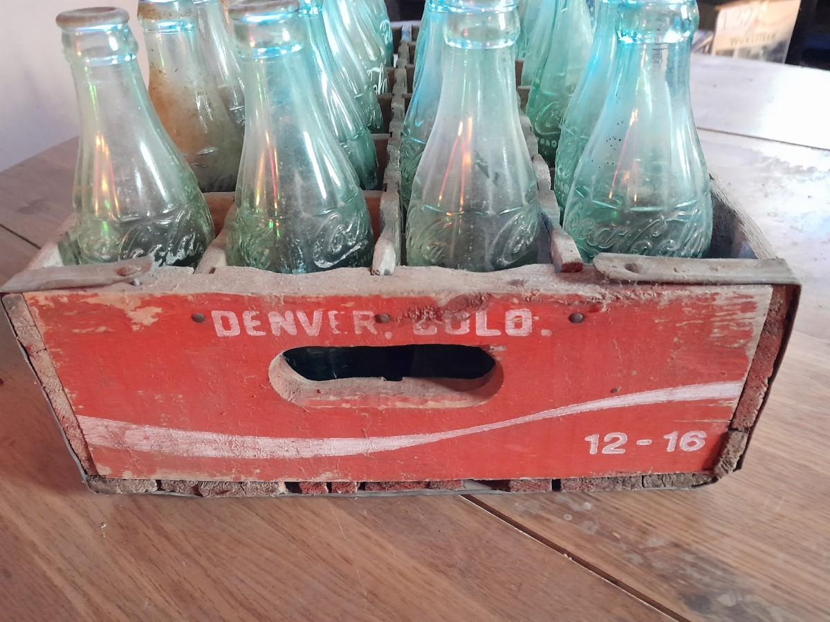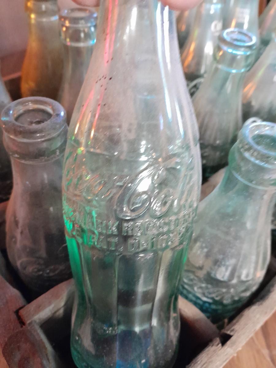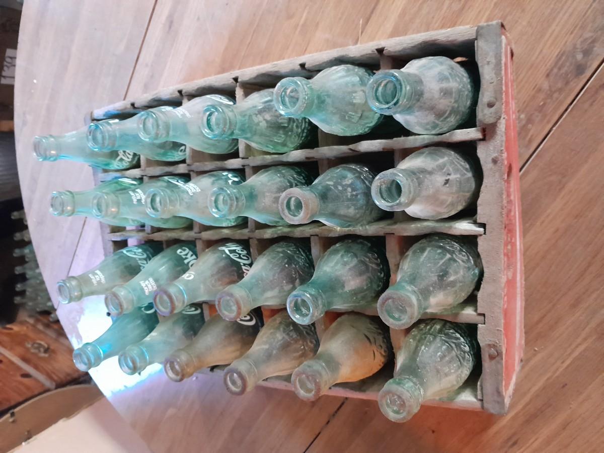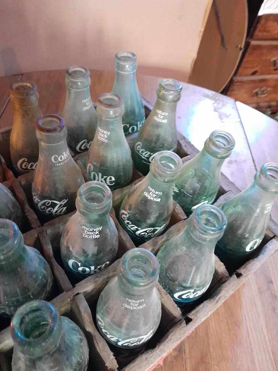 VINTAGE GLASS COKE BOTTLES IN WOODEN COCA-COLA CRATE, THE COKE BOTTLES ARE FROM DIFFERENT FACTORIES AROUND THE STATES