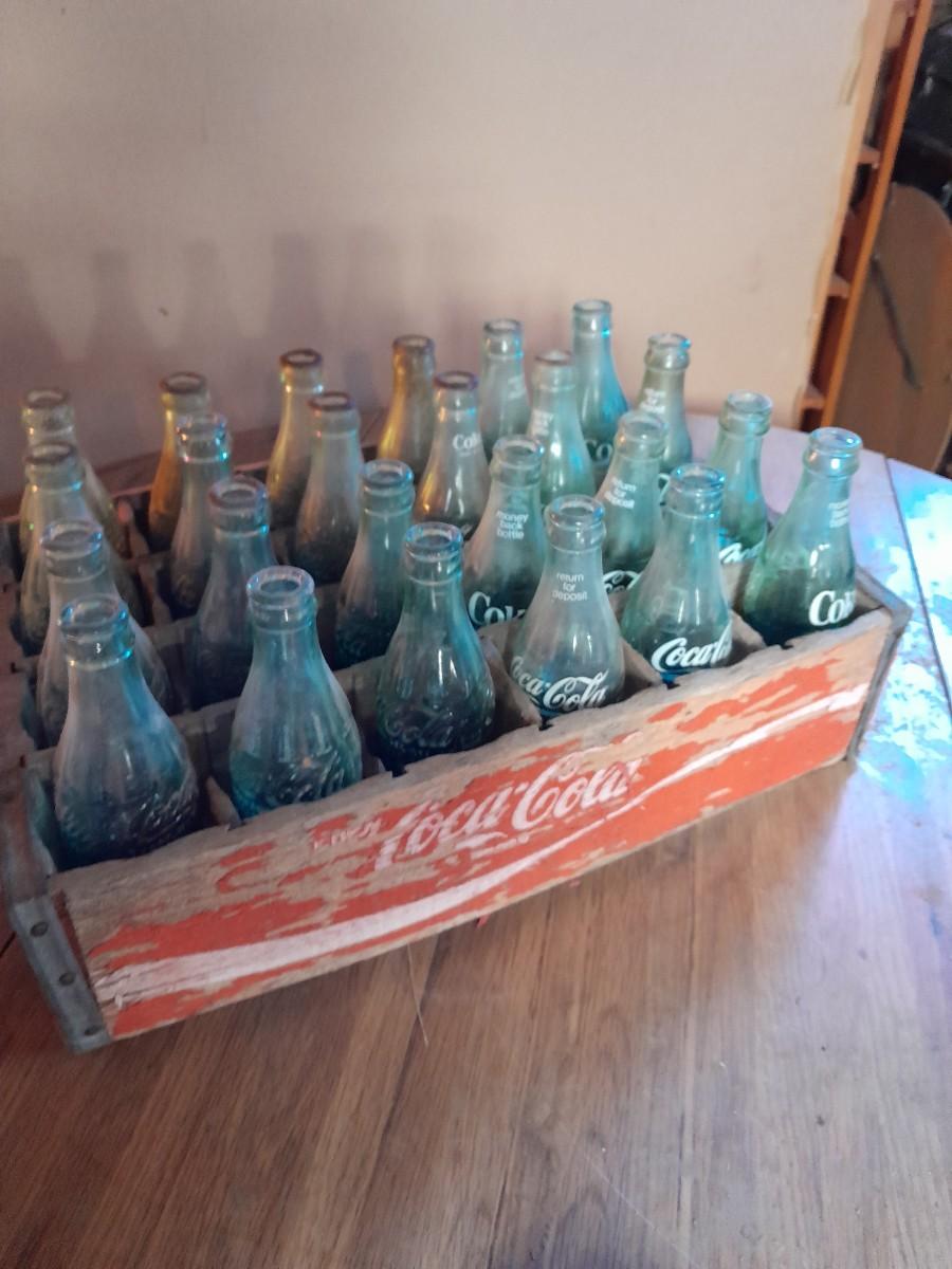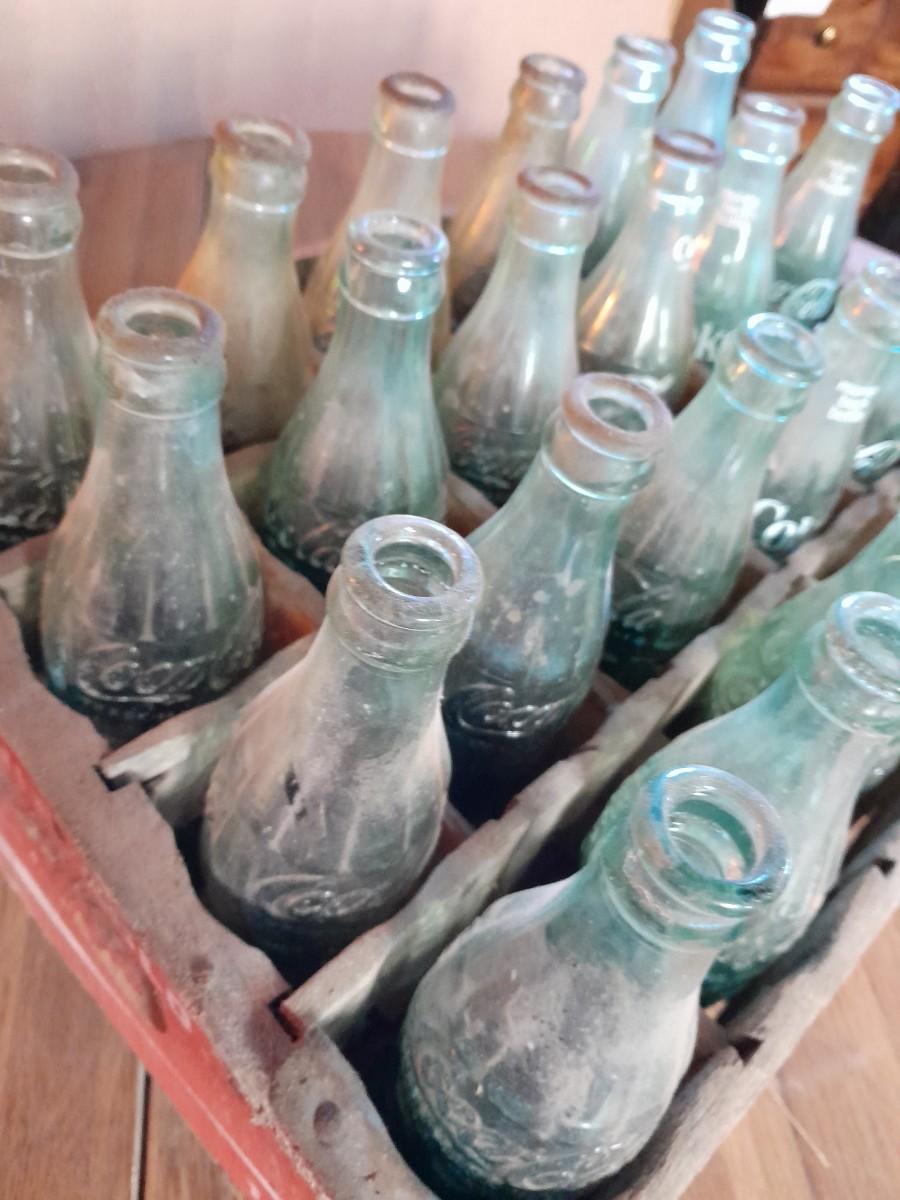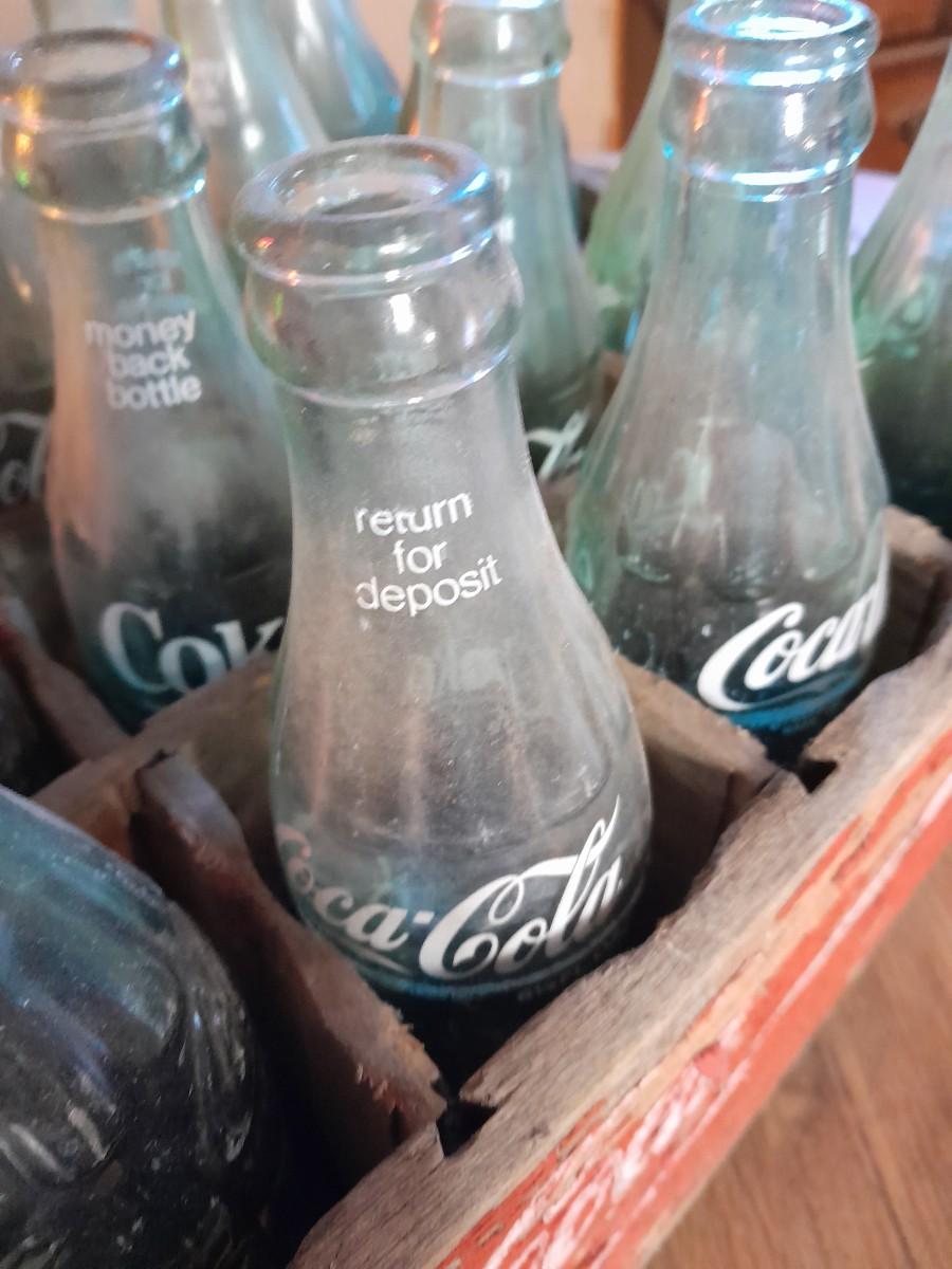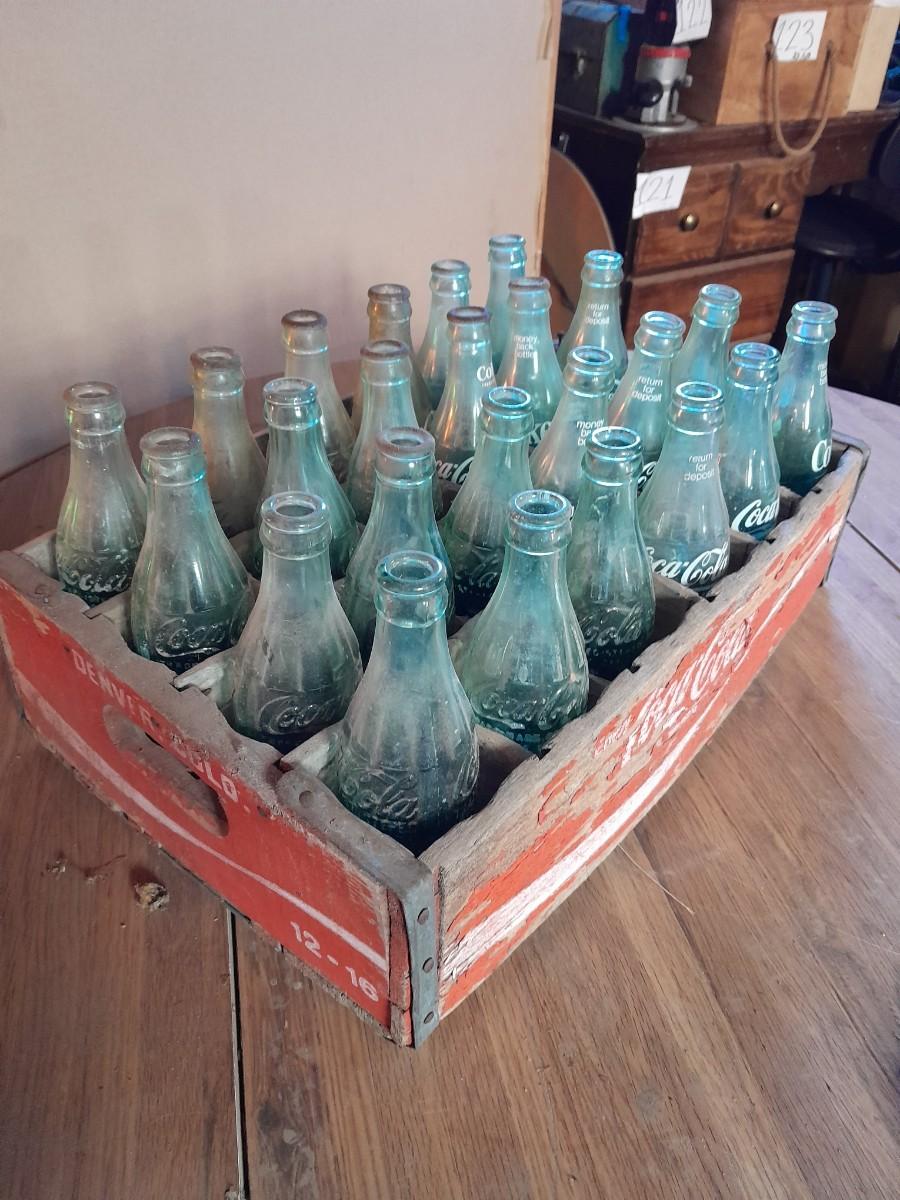 VINTAGE GLASS COKE BOTTLES IN WOODEN COCA-COLA CRATE, THE COKE BOTTLES ARE FROM DIFFERENT FACTORIES AROUND THE STATES
