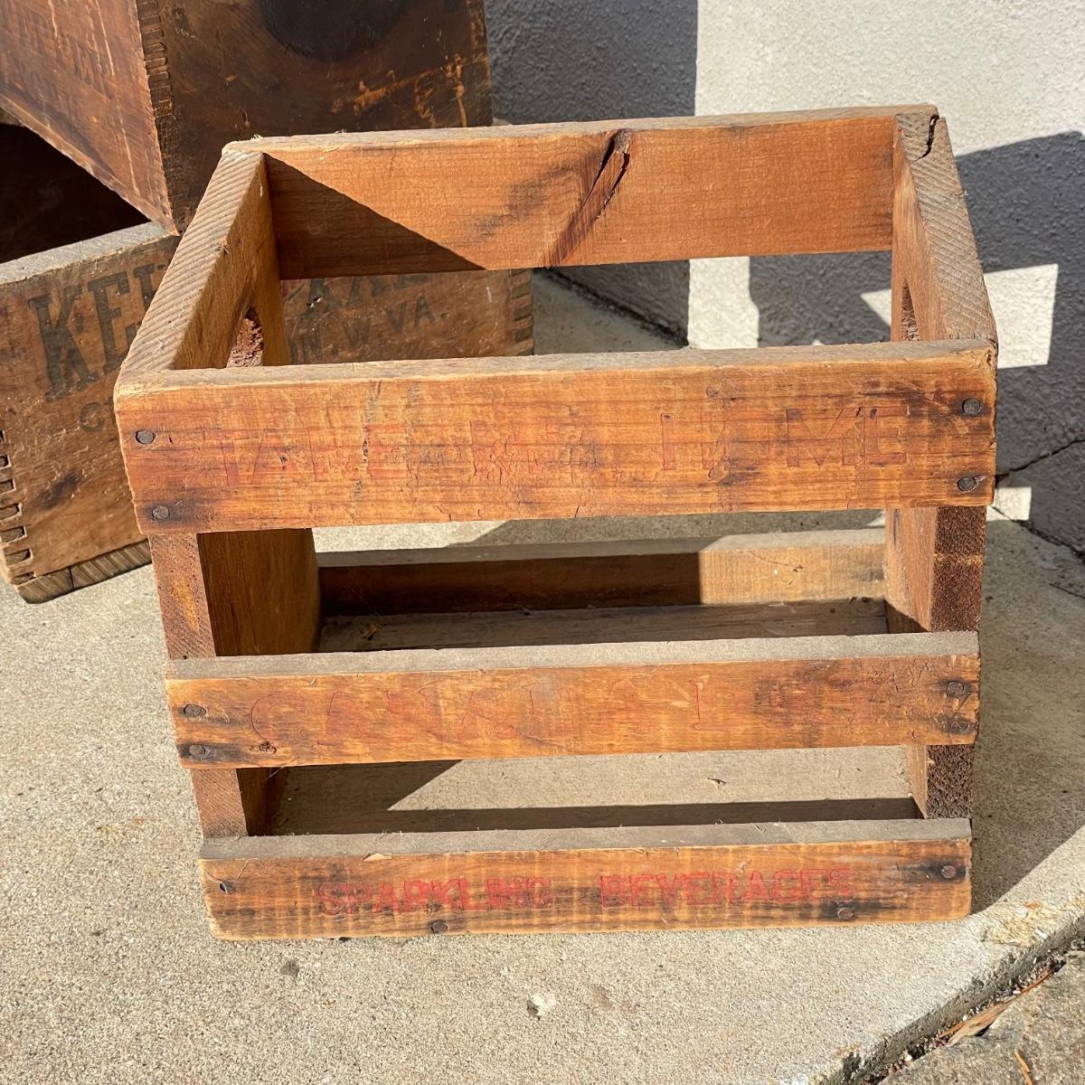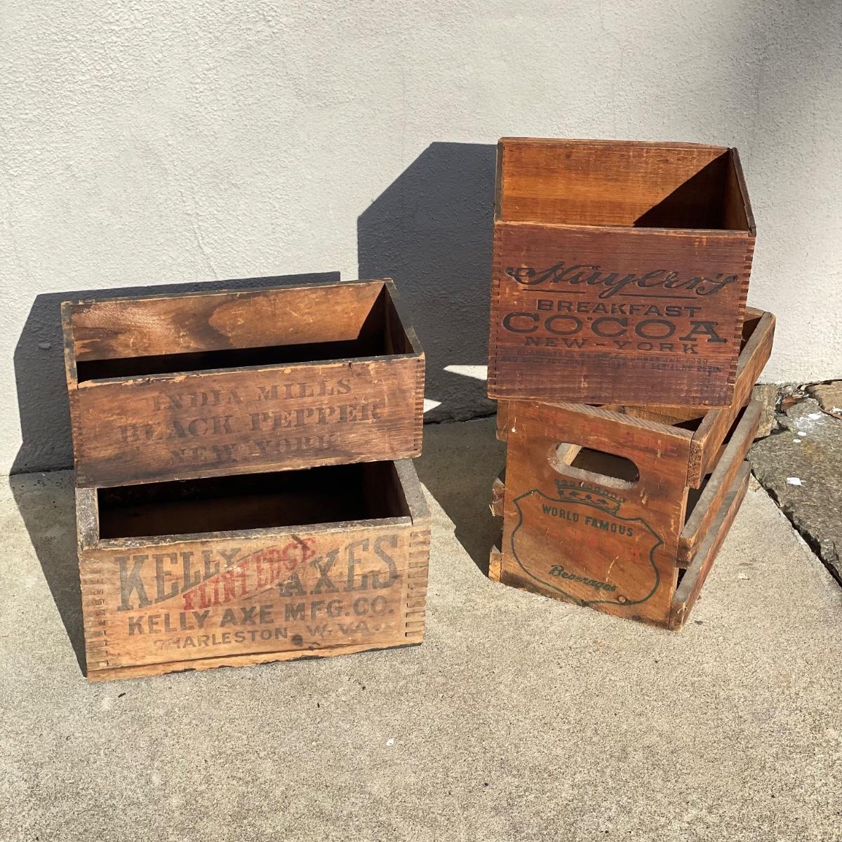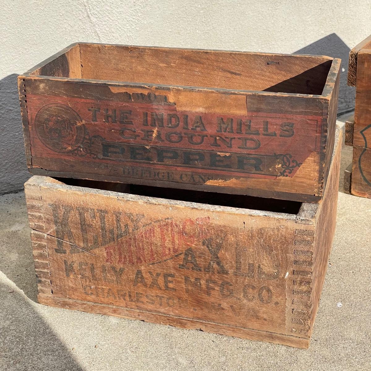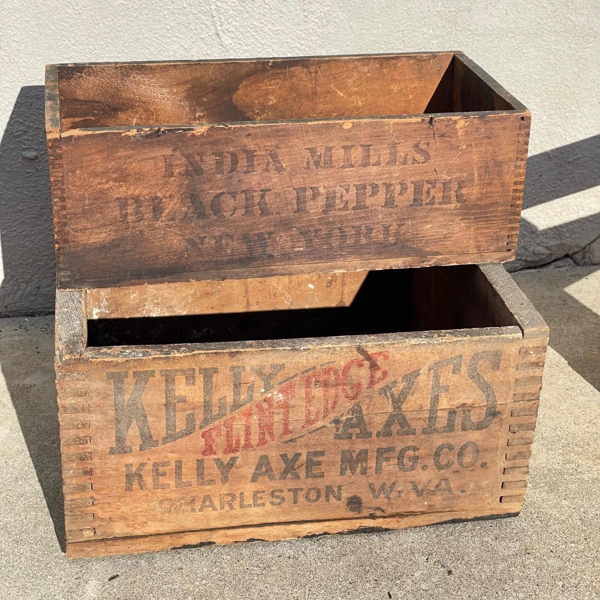 Three Dovetail wooden crates featuring Huyler’s Breakfast Cocoa, Kelly Flint Edge Axes, and India Mills Black Pepper. Lot also features the World Famous Canada Dry crate with handles. The largest crate is the Kelly Axe Mfg, measuring 12.5” x 11” x 6”. See images. Shipping available.