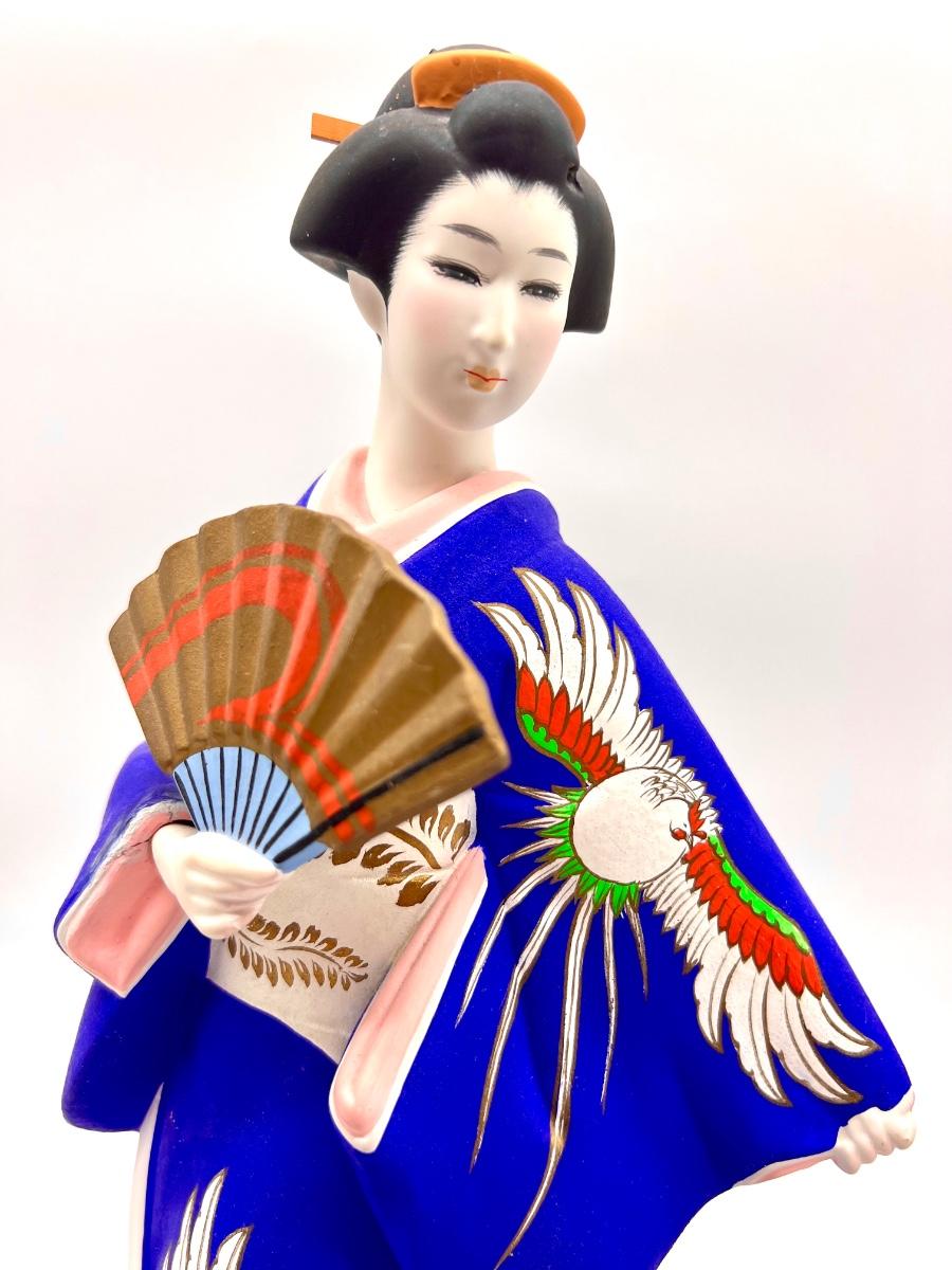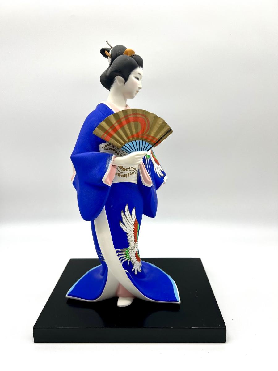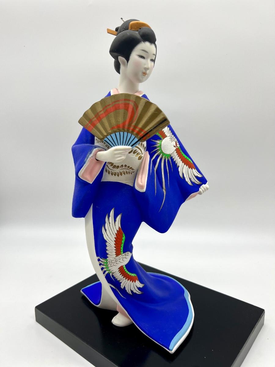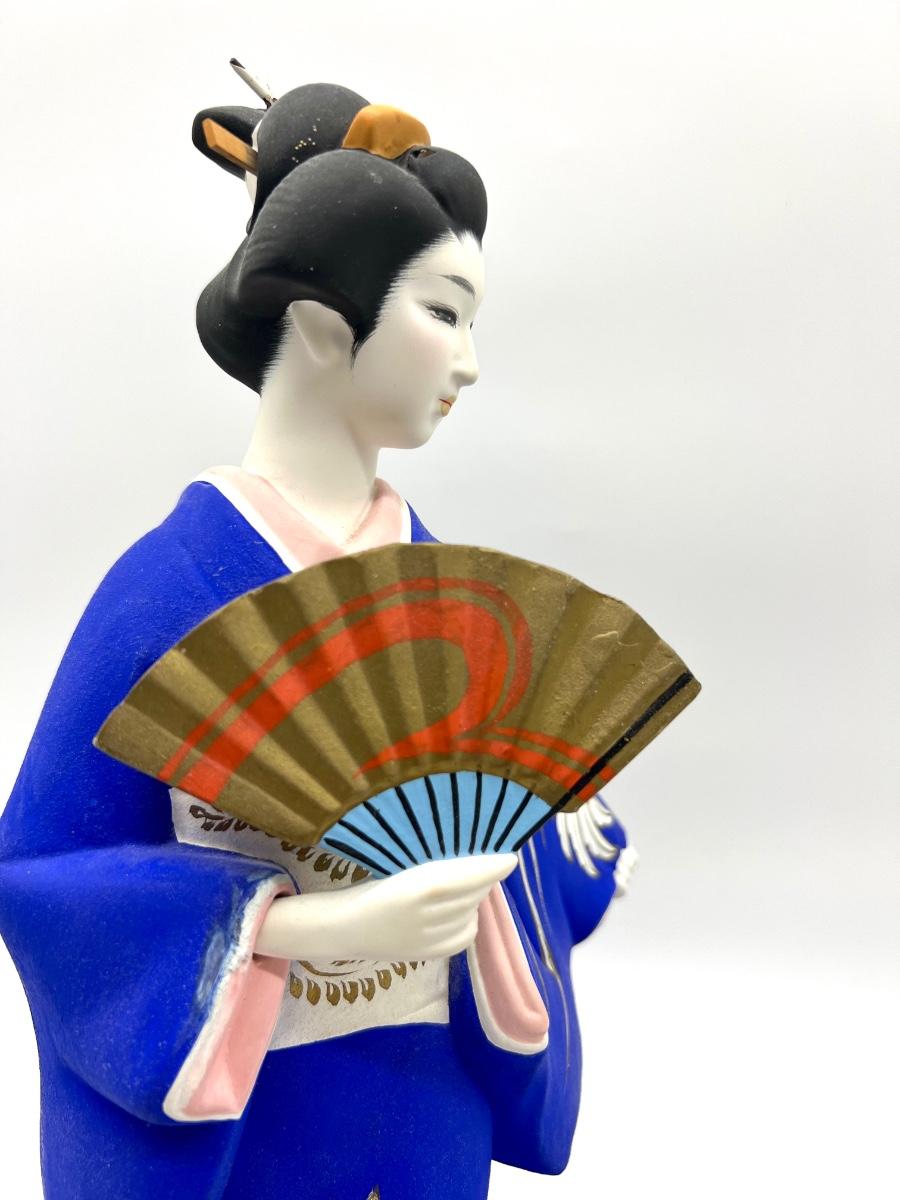 VINTAGE CLAY JAPANESE WOMAN GEISHA KIMONO HOLDING A FAN STATUE Measures 15 1/2 inches tall base measures 10 inches long and 7 1/2 deep. Small chip on the backside at the bottom of her kimono, see picture.