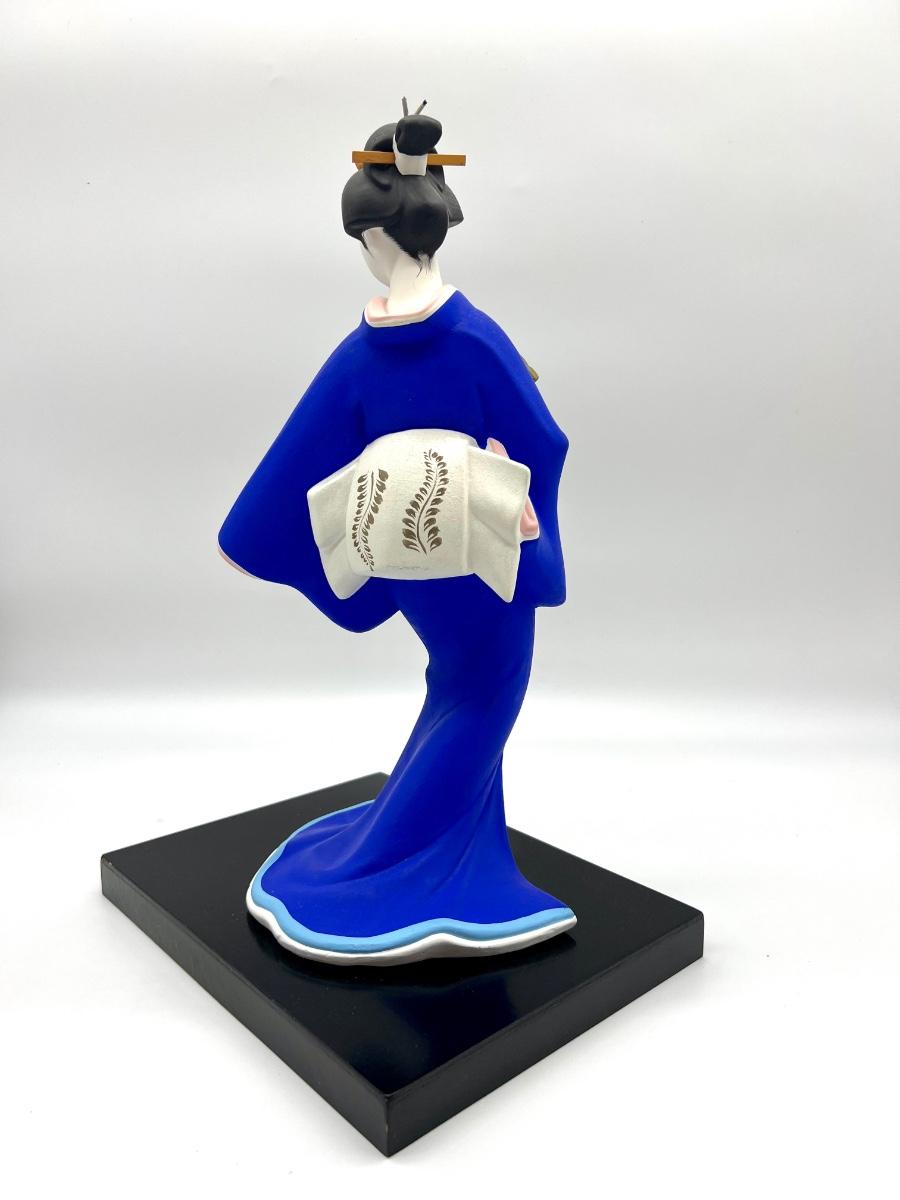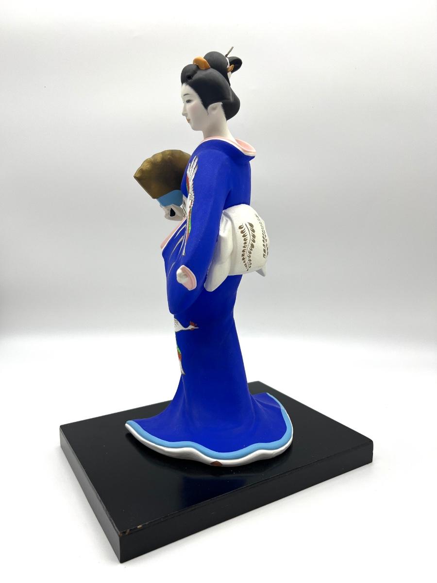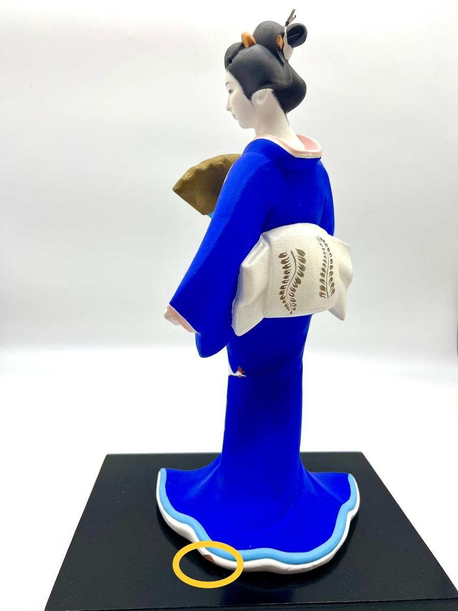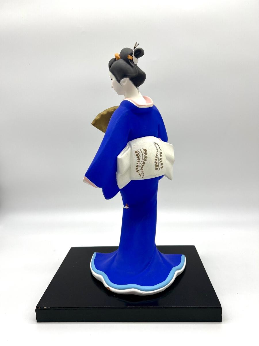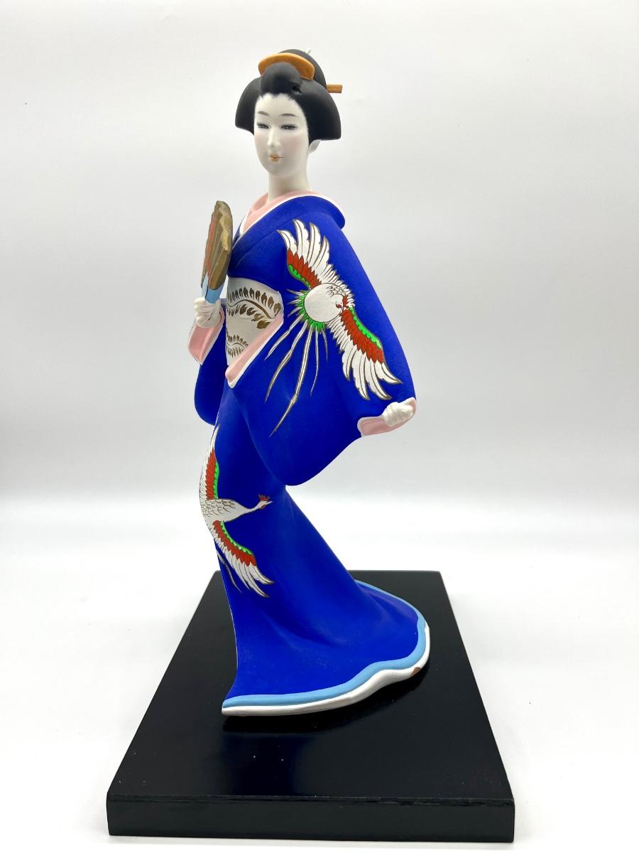 VINTAGE CLAY JAPANESE WOMAN GEISHA KIMONO HOLDING A FAN STATUE Measures 15 1/2 inches tall base measures 10 inches long and 7 1/2 deep. Small chip on the backside at the bottom of her kimono, see picture.