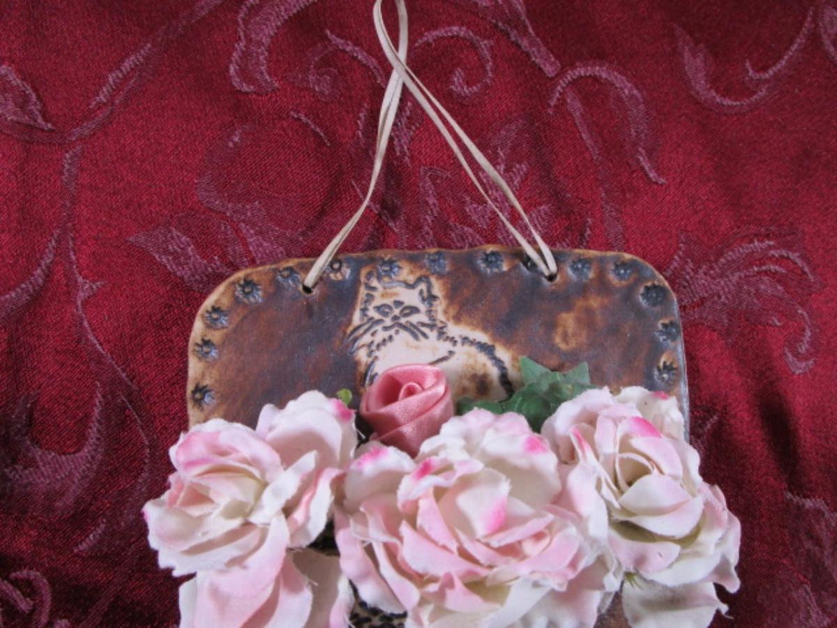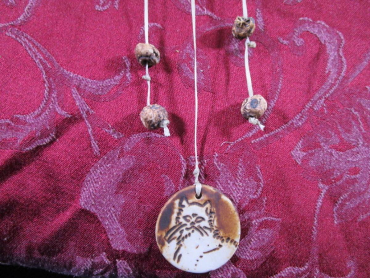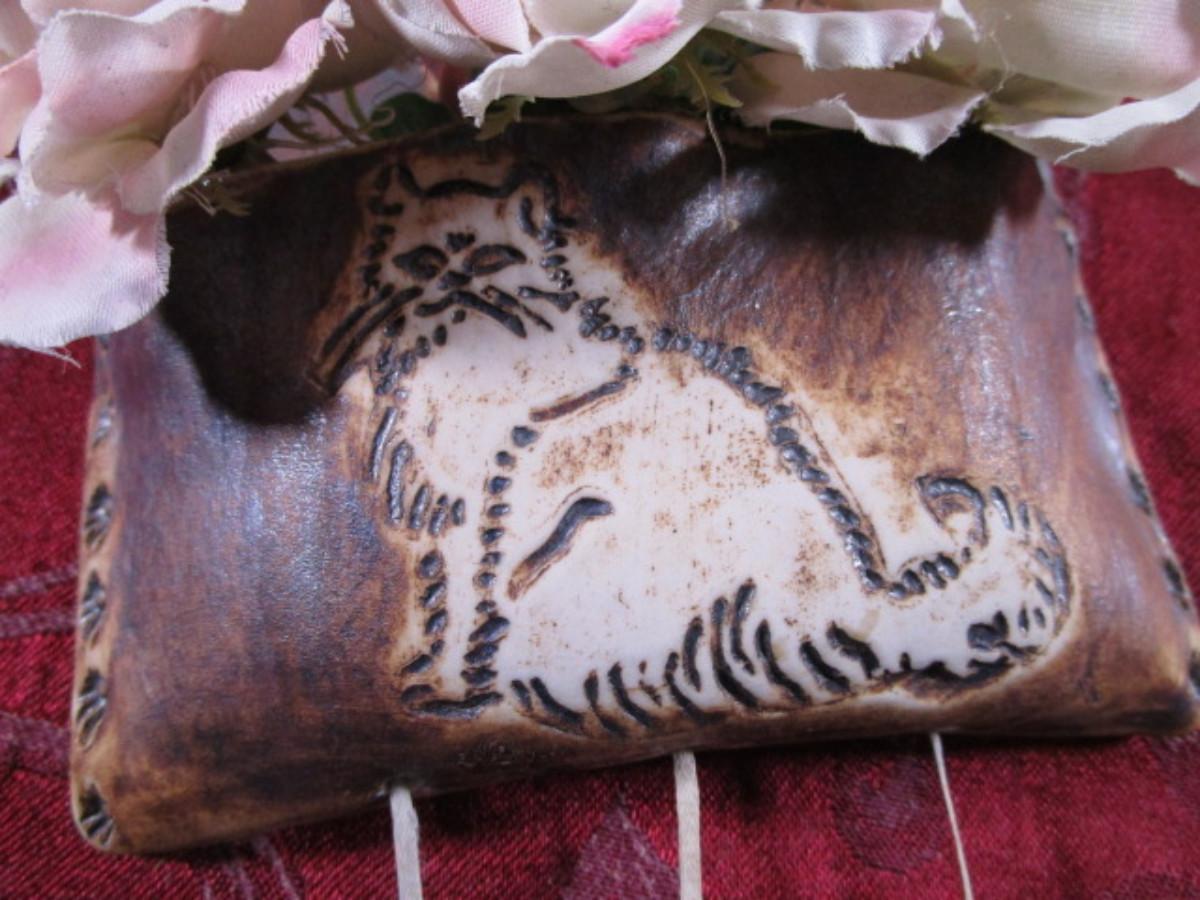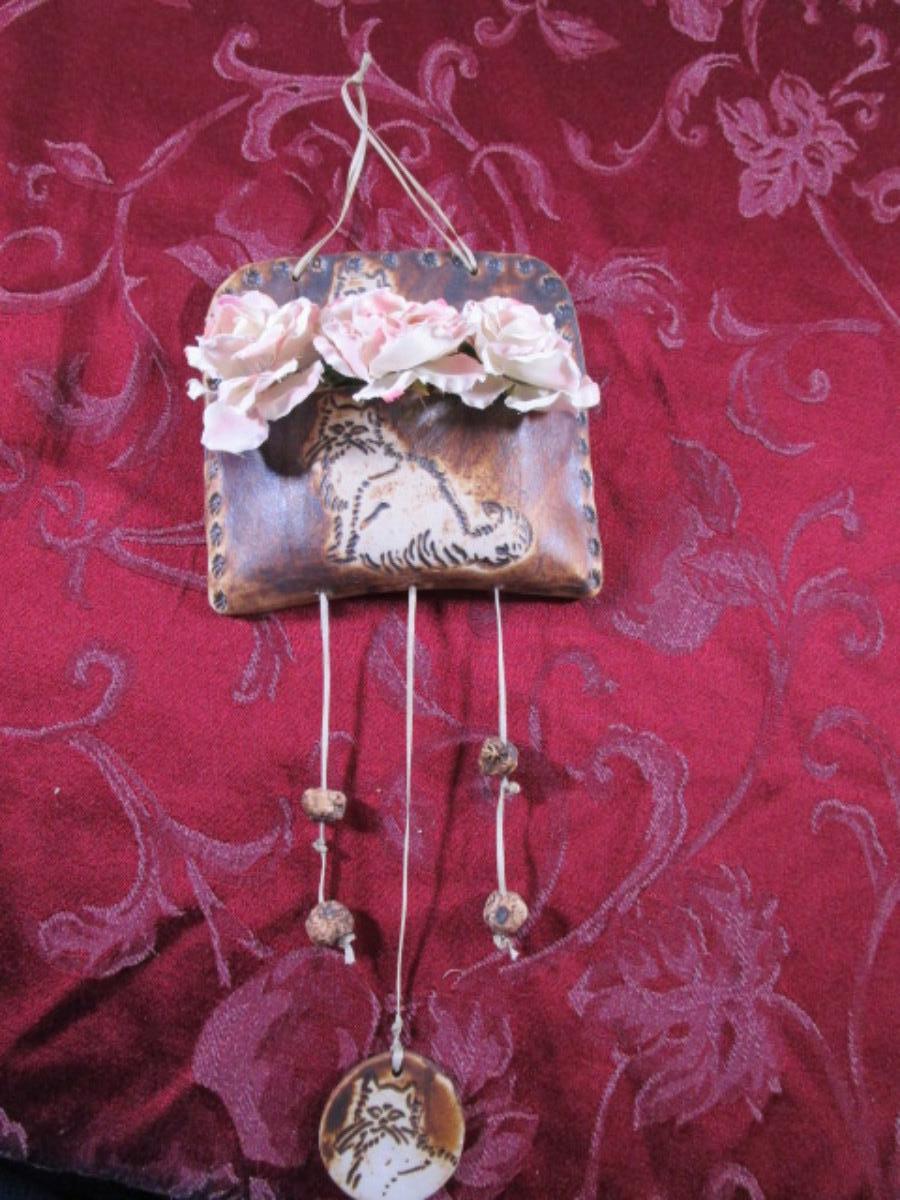 Made by LEI 1983, etched cats on pouch, top and middle wind chime, 5-1/4" tall x 5-1/4" wide