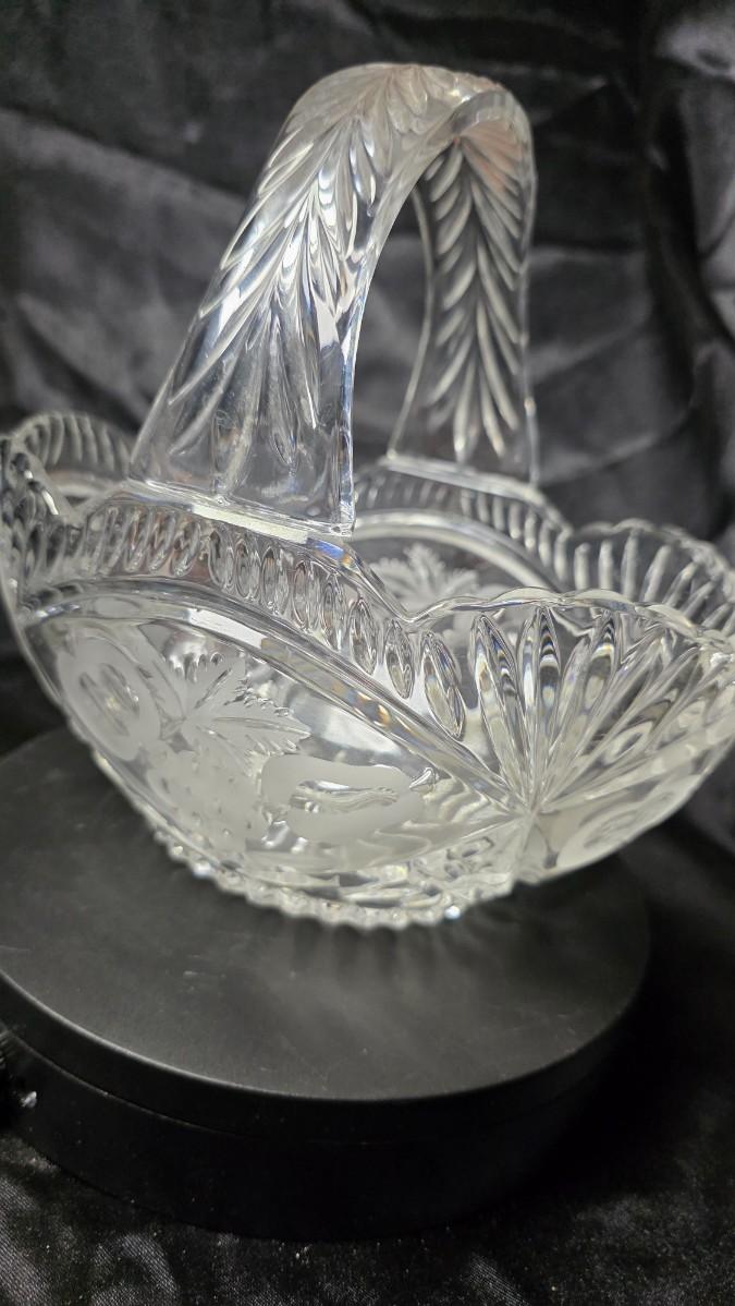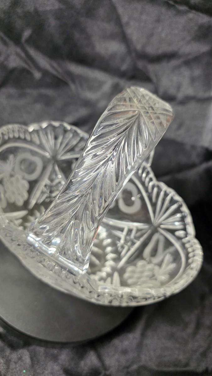 Vintage Clear Cut Glass Handled Basket with Etched Fruit & Leaf Motif – Scalloped Rim Brides Basket