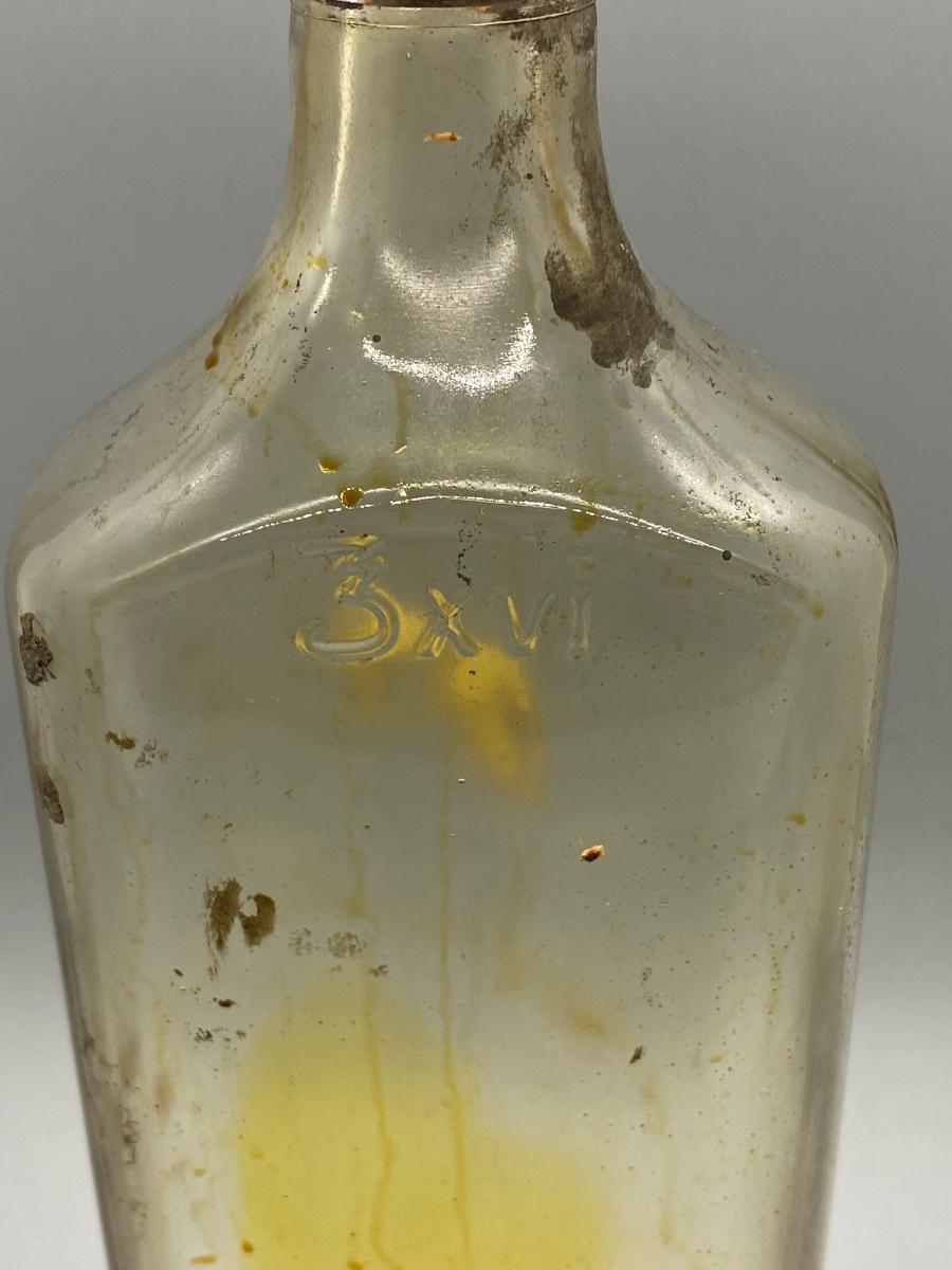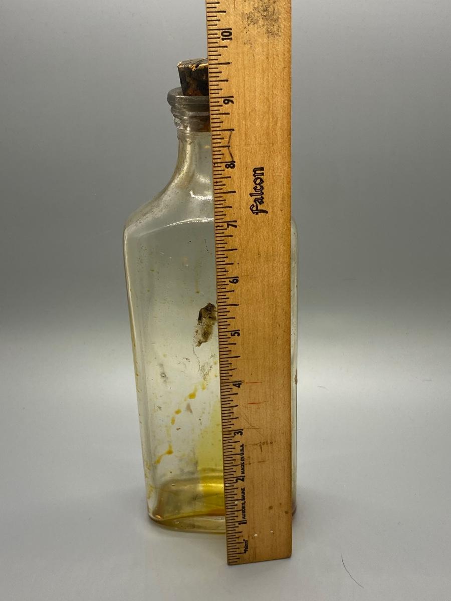 Vintage cork top clear glass bottle. No label or imprint of what it was used for. Great as an old poison bottle display piece. About 9" size.