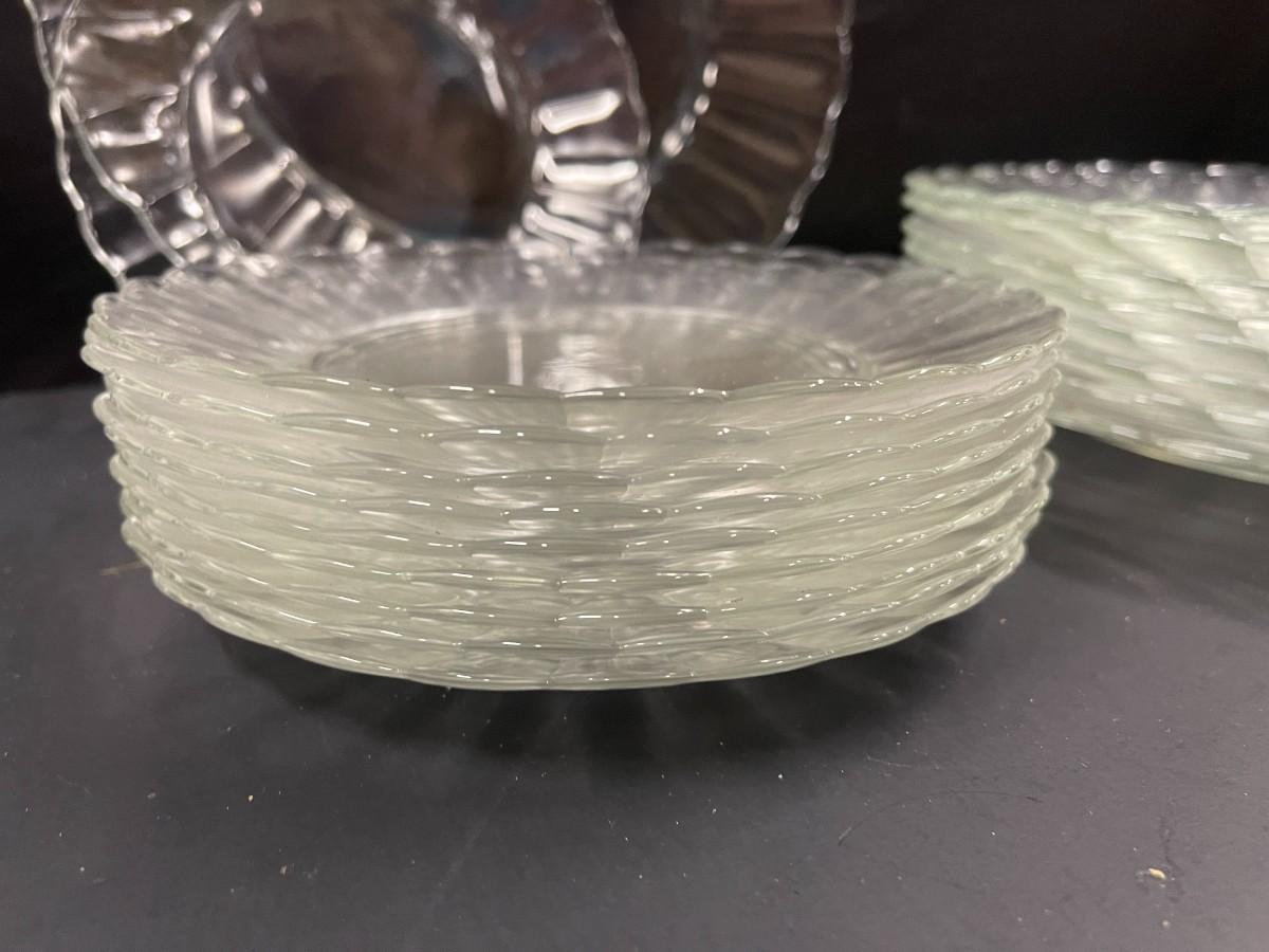 Set of 18 clear glass dinner and salad plates. There are 9 dinner plates, 11" each and 9 salad plates, 7" each.