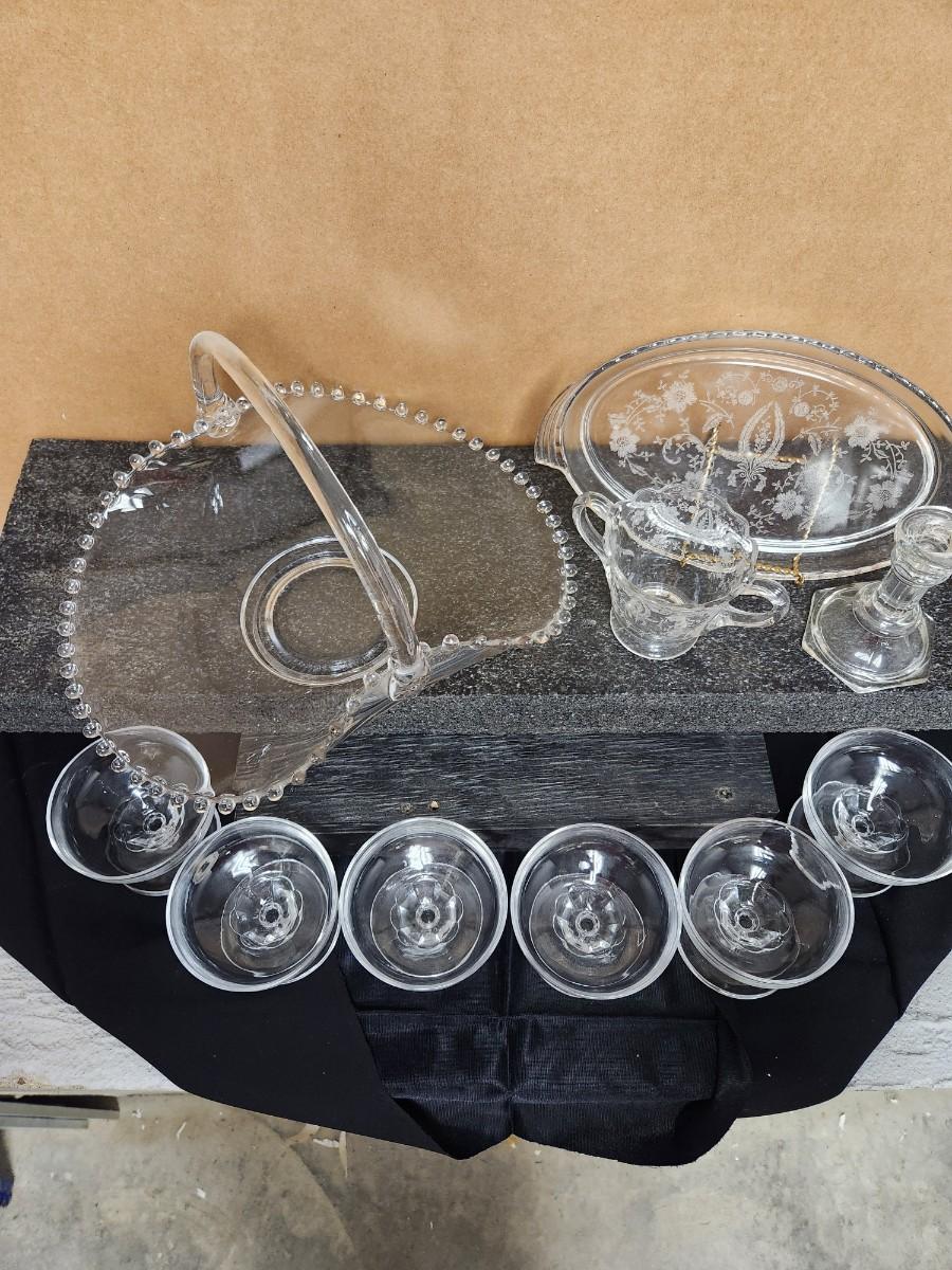 6 awesome vintage sherbets, 2 pieces of "Prelude" etched class and a fantastic large Candlewick basket