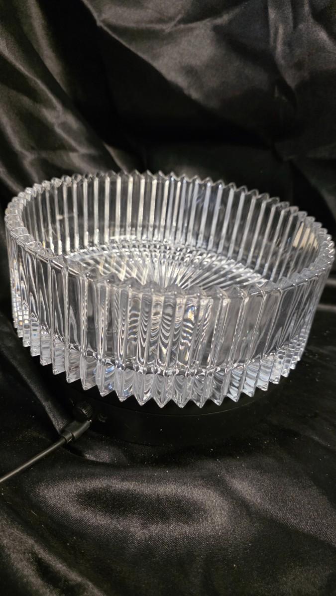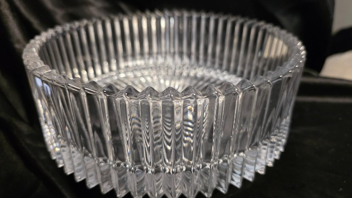 In the soft hush of a forgotten parlor, where light filters through lace curtains, a glass bowl gleams like a captured star—its rim a symphony of faceted ribs, rising in pointed waves that catch the sun's rays, refracting them into prisms of brilliance. At its core, a starburst pattern blooms from the base, rays extending like celestial arms, surrounded by the smooth expanse that invites touch, all rendered in crystal-clear glass that echoes the purity of a mountain stream.  9in x 3in
