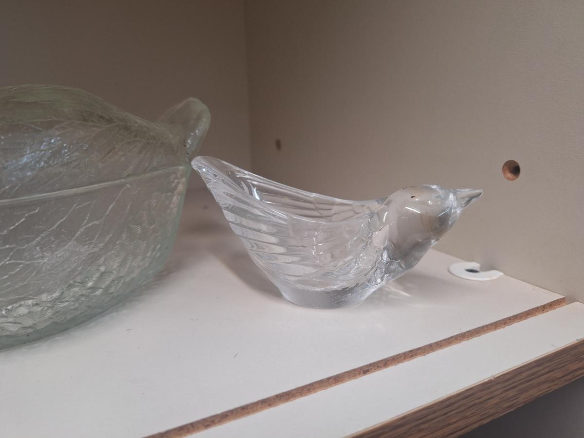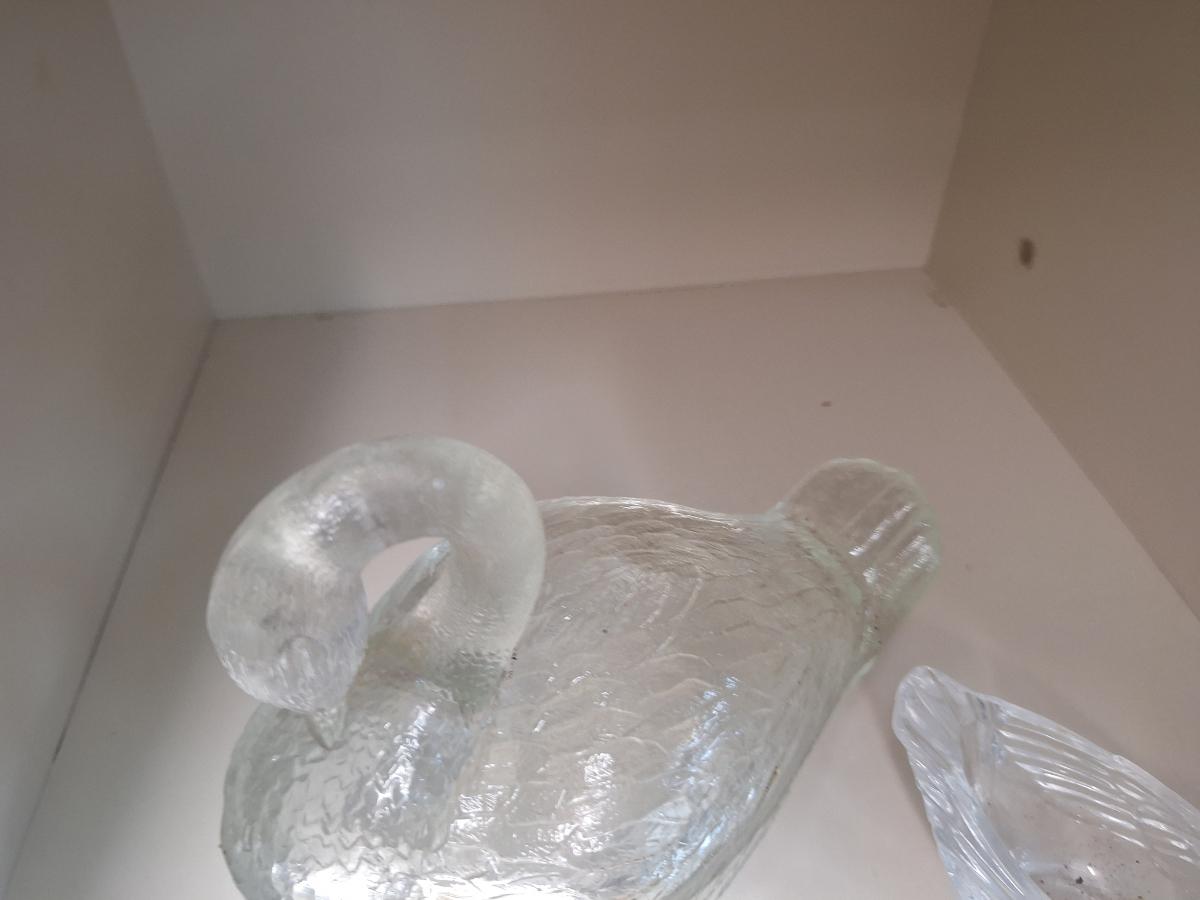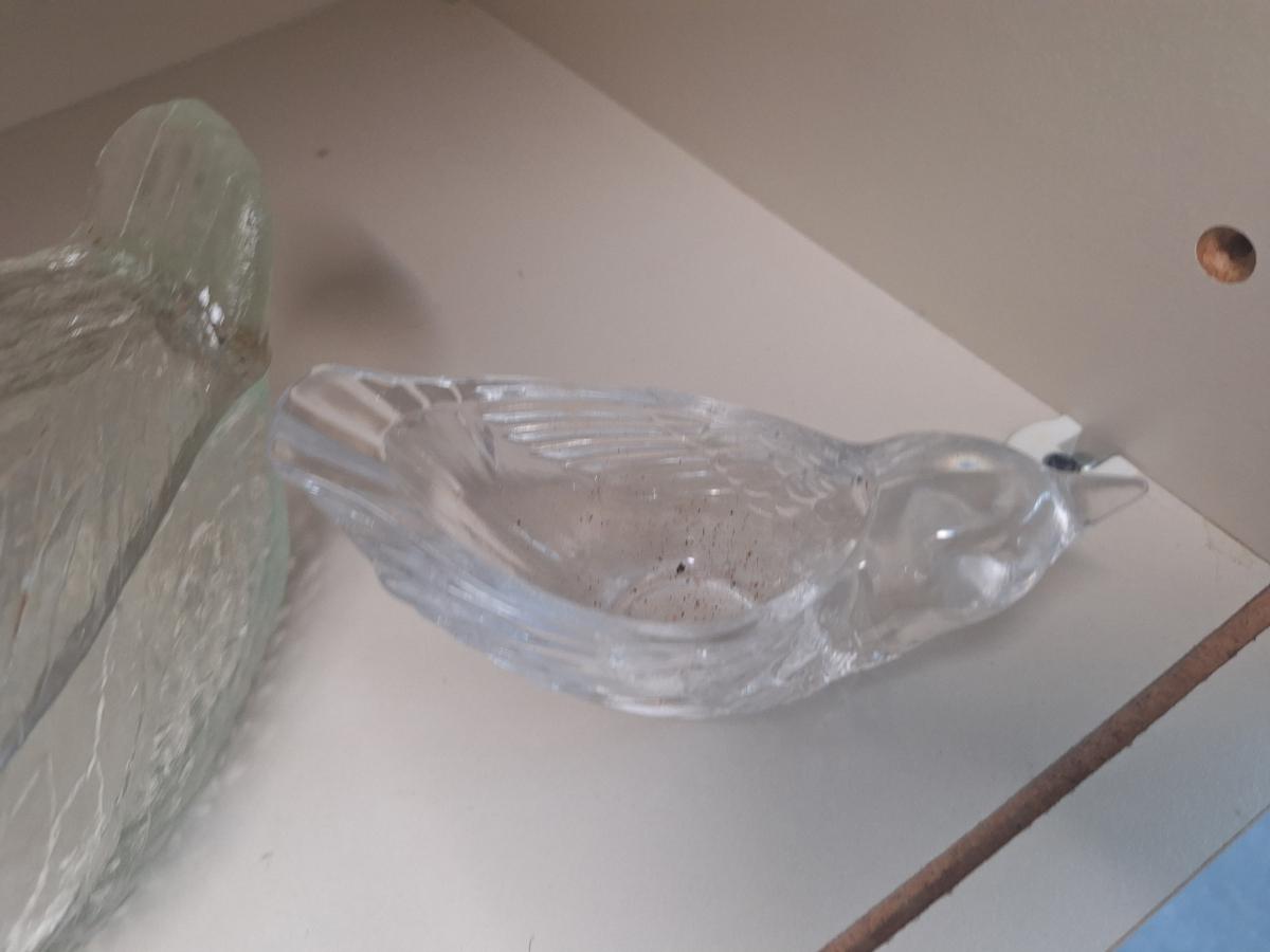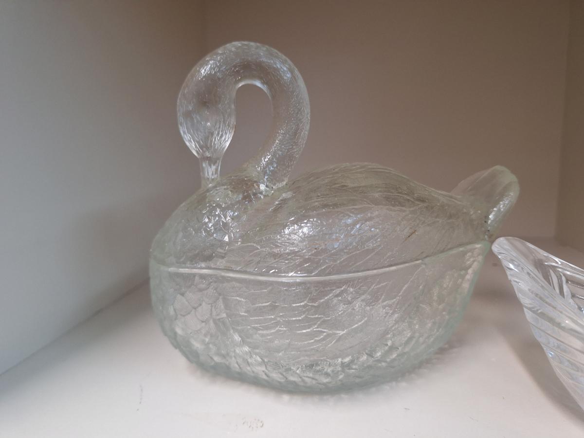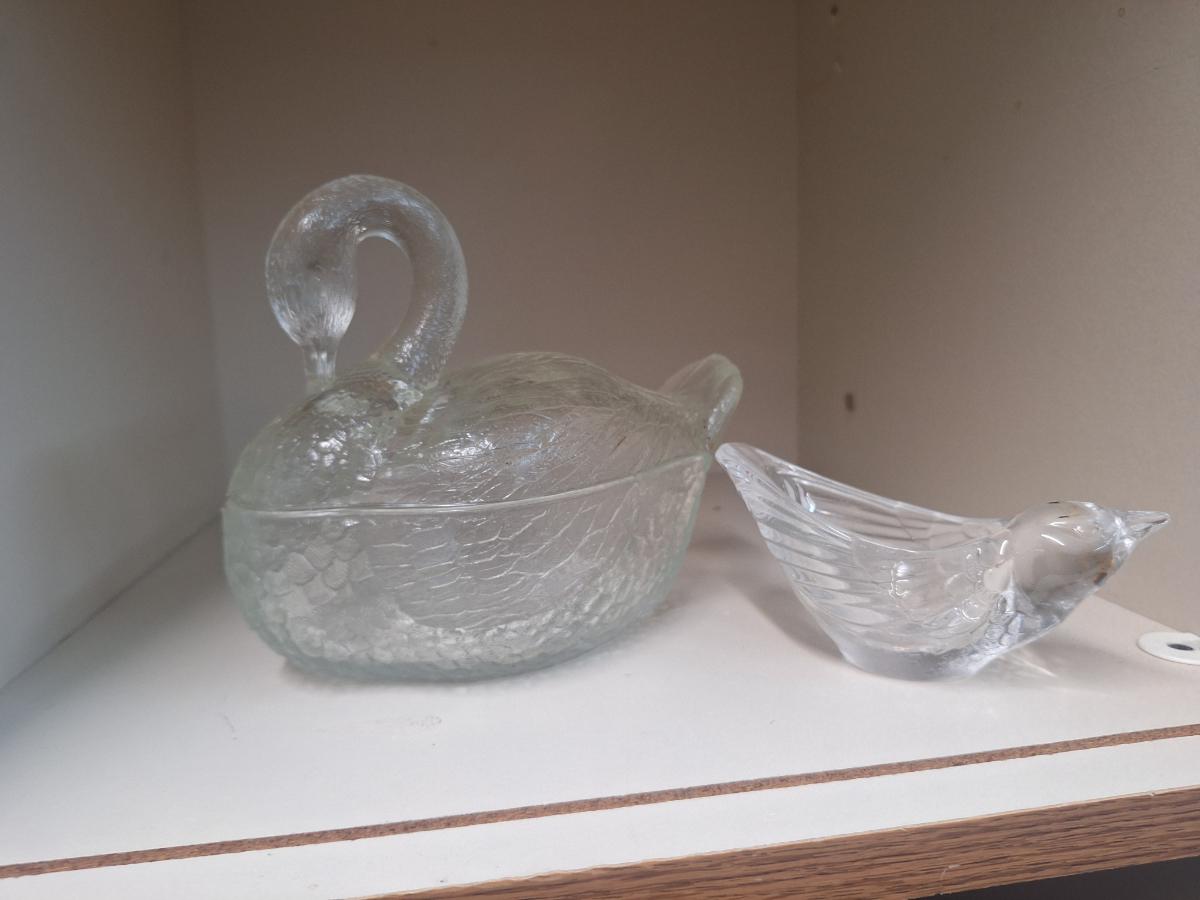 vintage, clear, pressed glass covered swan dish and a small glass bird trinket dish