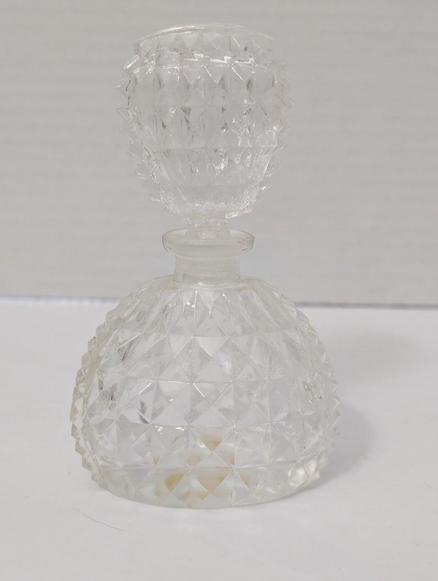 Vintage Clear Pressed Glass Diamond Cut Perfume Bottle with Matching Stopper Vanity Display
