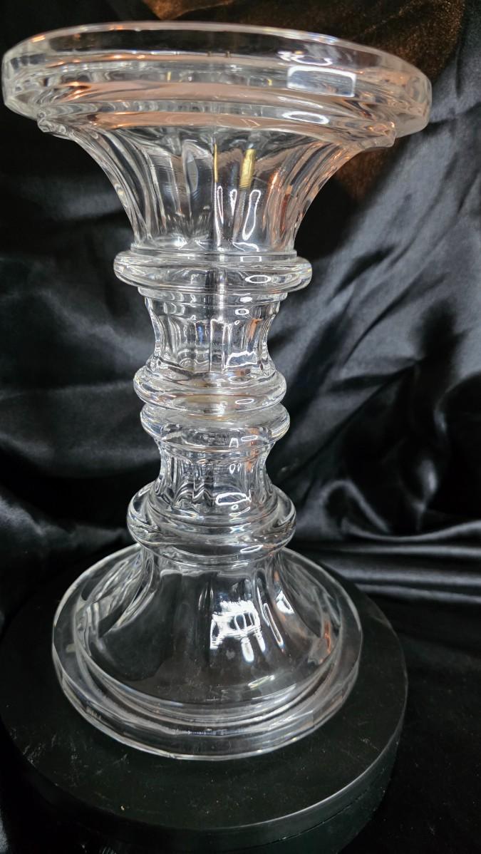 In candlelight, the pedestal glows from within, catching flame reflections across its polished surface and creating a shimmer that feels warm, elegant, and timeless. When daylight hits the glass instead, the structure becomes sculptural — a piece of transparent architecture that elevates any mantel, dining table, or entryway with quiet sophistication. Vintage glassware of this weight and clarity has become increasingly sought-after as collectors turn toward substantial decor that feels both modern and old-world at once.