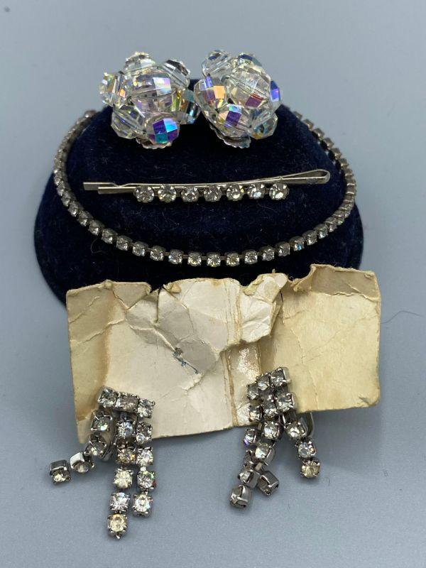 Lot of vintage clear rhinestone & bead jewelry. 6 pieces include 2 pairs of clip earrings, a hair pin, a bracelet, and 2 necklaces. All in good condition.