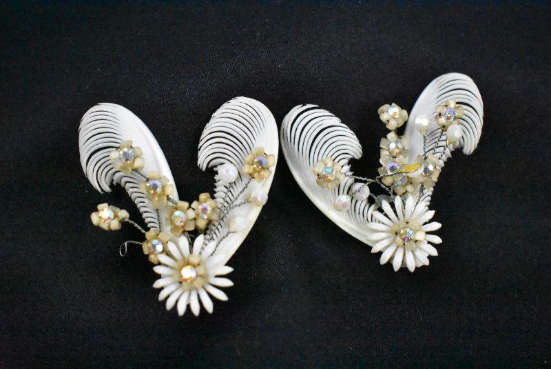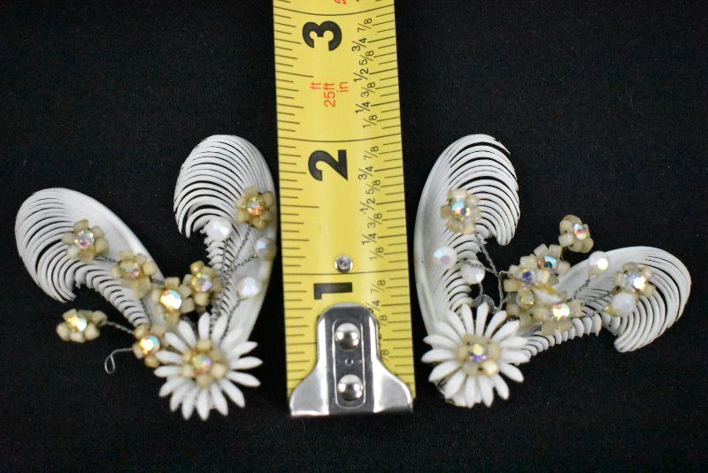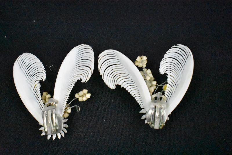 Vintage Clip On Earrings: Soft Plastic White Feather With Rhinestones. Germany
