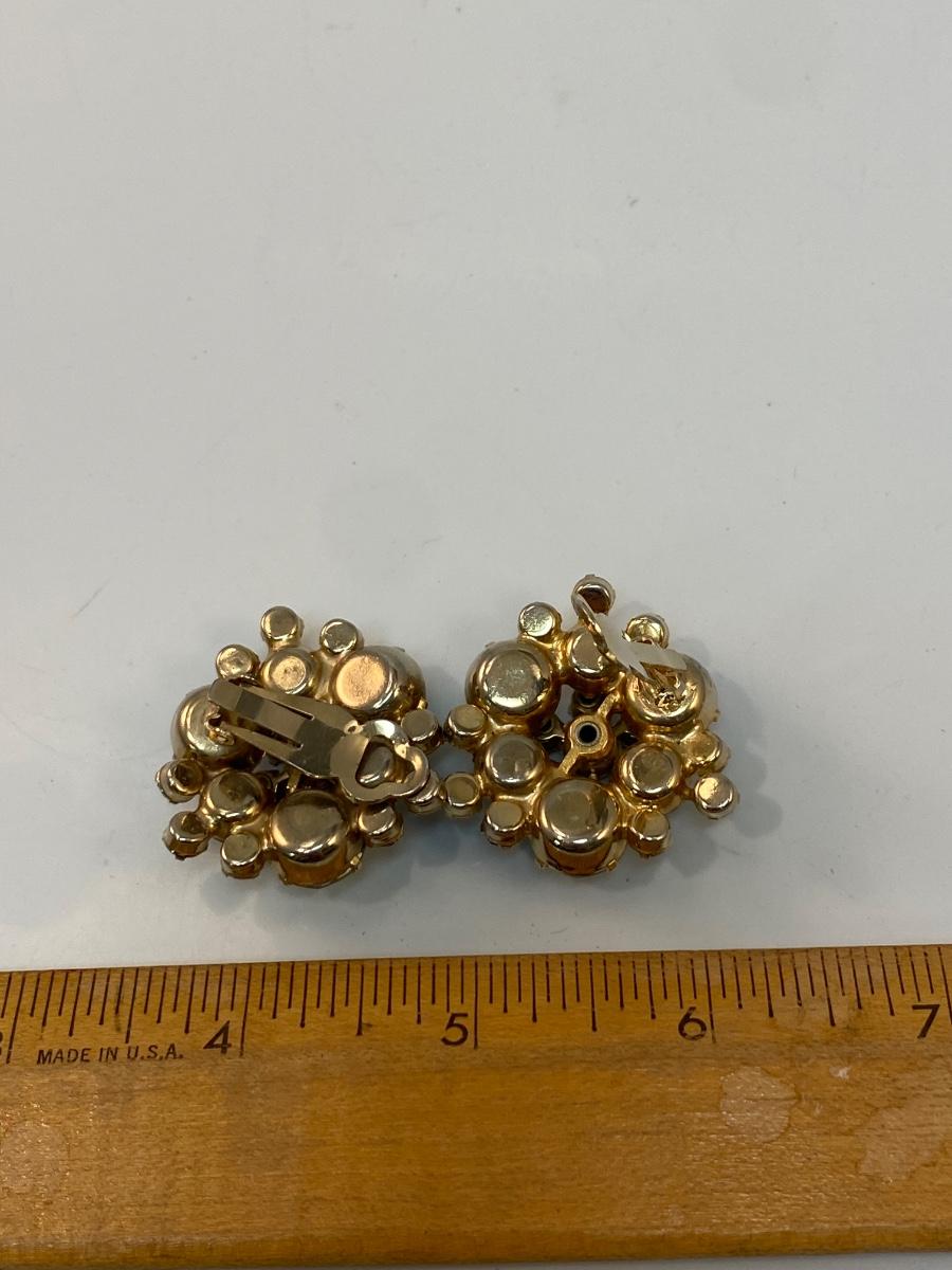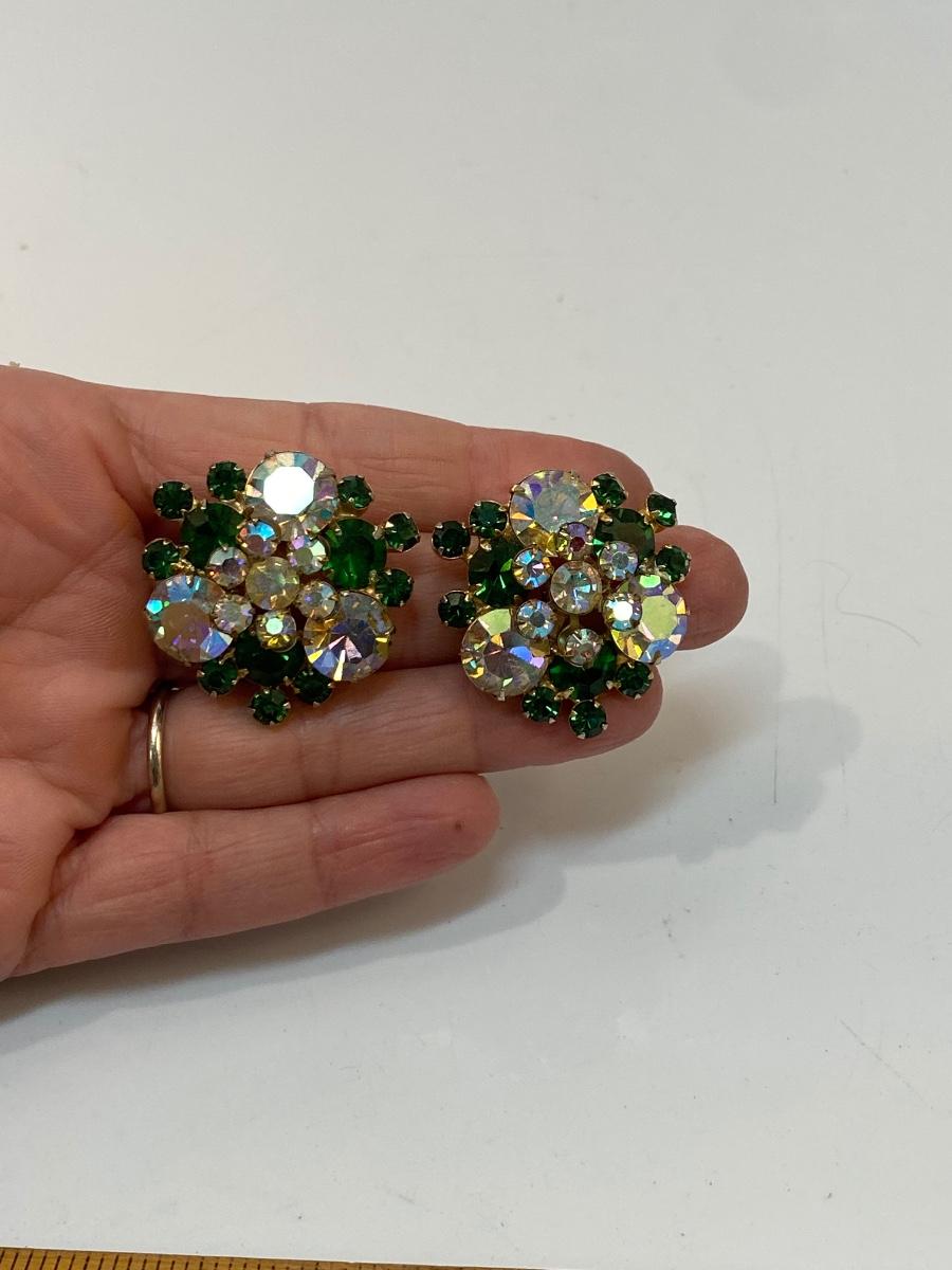 Vintage Clip Style AB Iridescent & Green Rhinestone Cluster Button Earrings. In good condition. Unbranded.