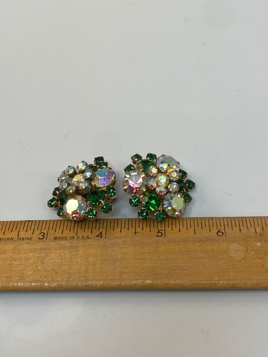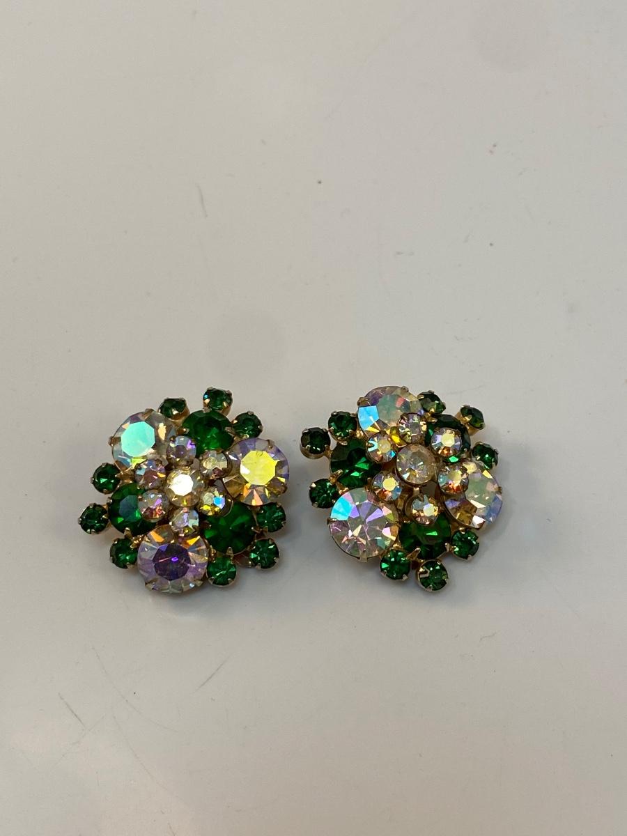 Vintage Clip Style AB Iridescent & Green Rhinestone Cluster Button Earrings