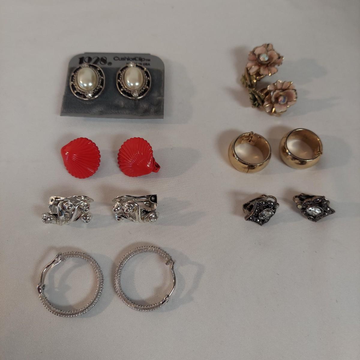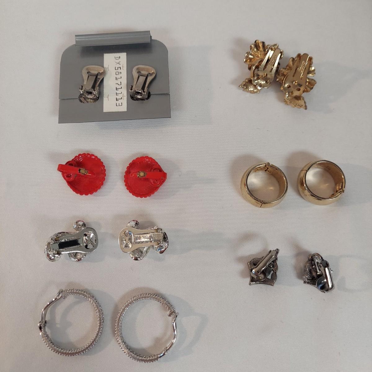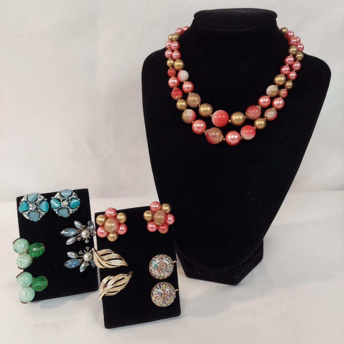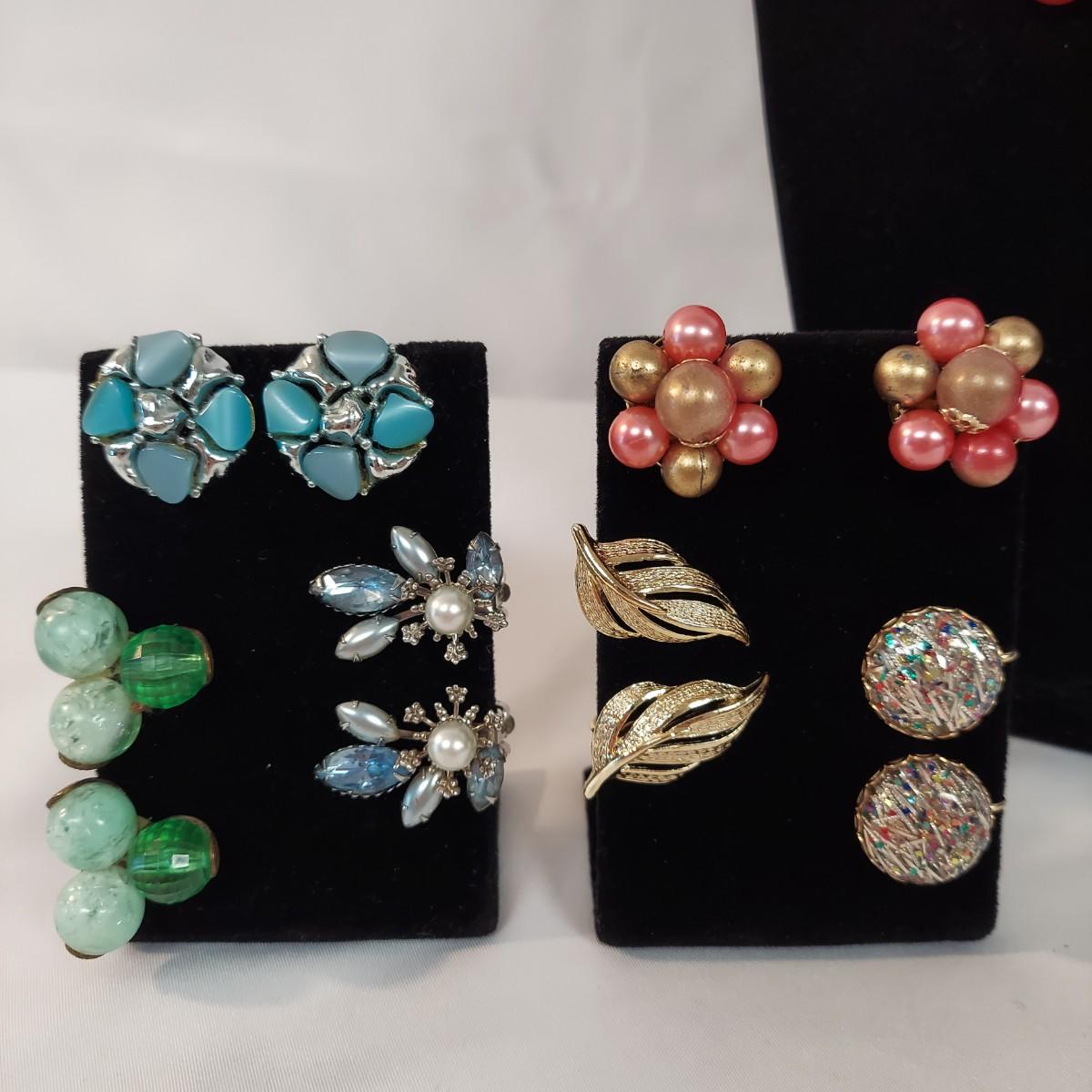 Several pairs of vintage clip-on on earrings and a two tier beaded necklace that matches one of the earring pairs. Lot includes 14 pairs of earrings and one necklace. Necklace is 14" long. Some earrings are traditional clips while others are the screw back style. All sales are final. No returns or refunds. Please bid accordingly.