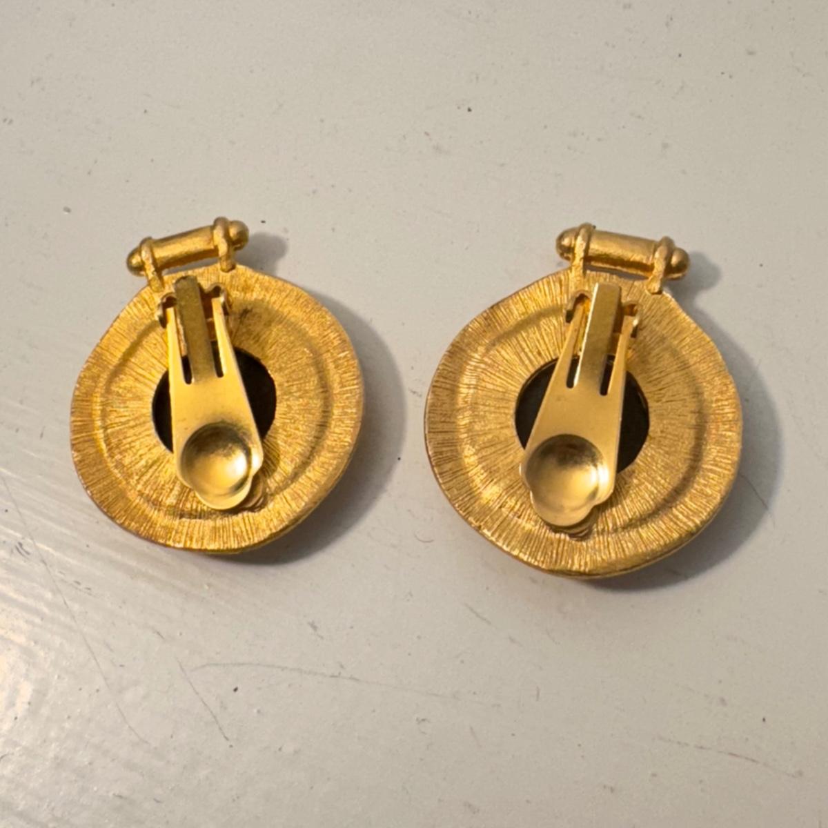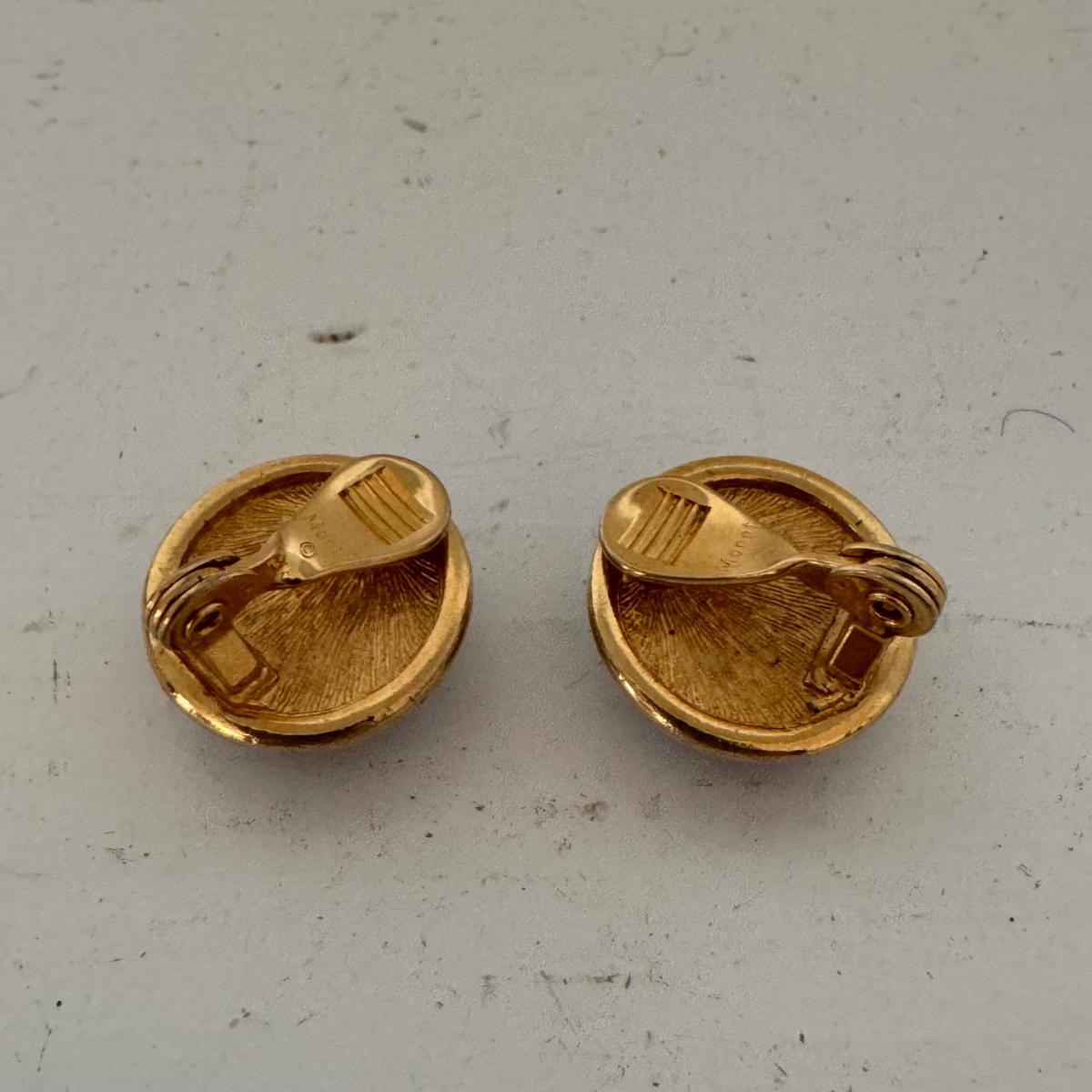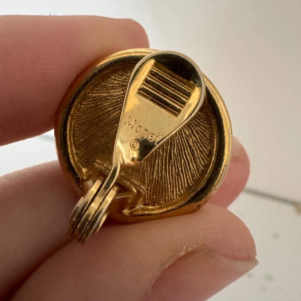 This lot includes two small jewelry boxes, one larger jewelry box with two rows, one pair of Monet clip on earrings with blue plastic beads, three pairs of miscellaneous clip-on costume earrings, and two golden colored larger clip-on earrings with a matching pendant. The largest jewelry box measures 7.5” x 5.5” x 2.5”H. All sales are final. No returns or refunds. Please bid accordingly. Shipping available.
