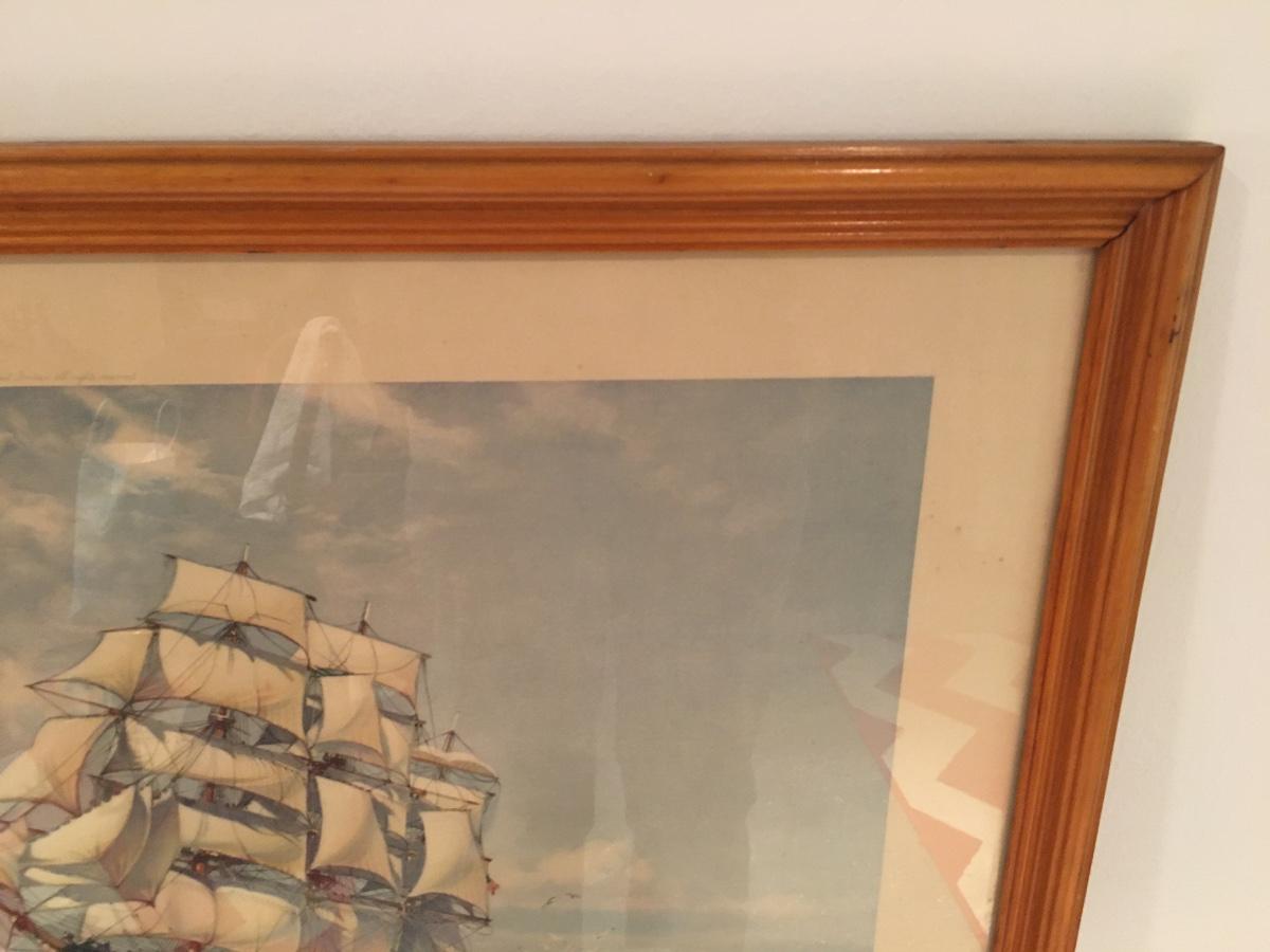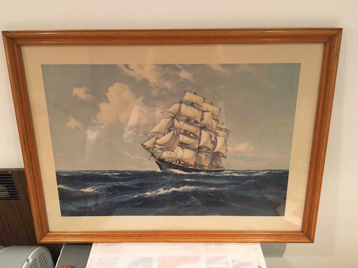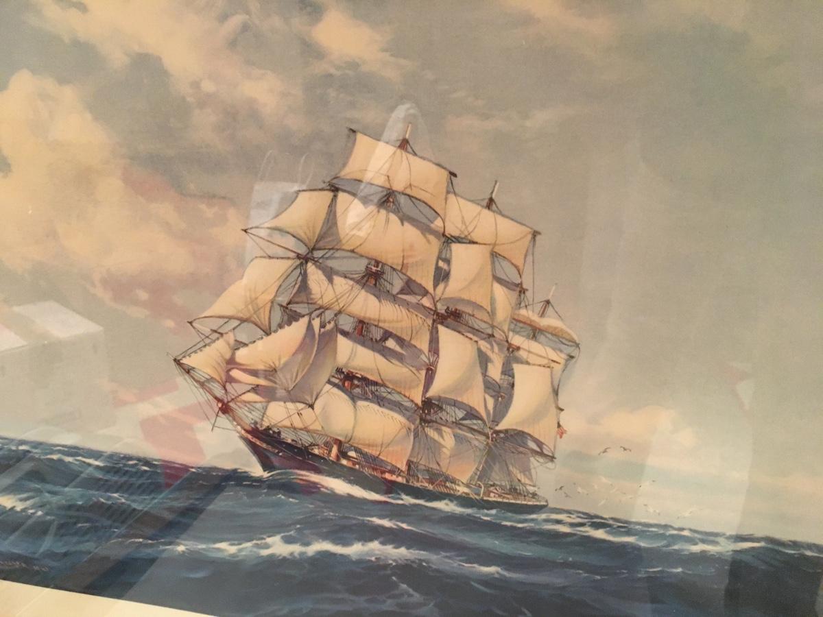 Framed vintage lithograph on heavy cardboard of a painting by Scottish artist, Robert MacGregor depicting a clipper at sea with sails billowing.