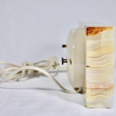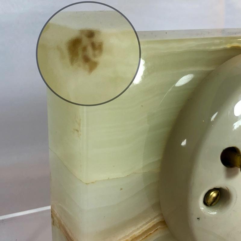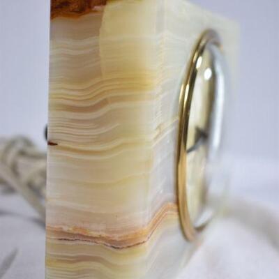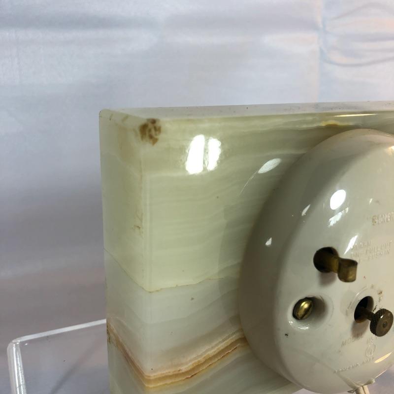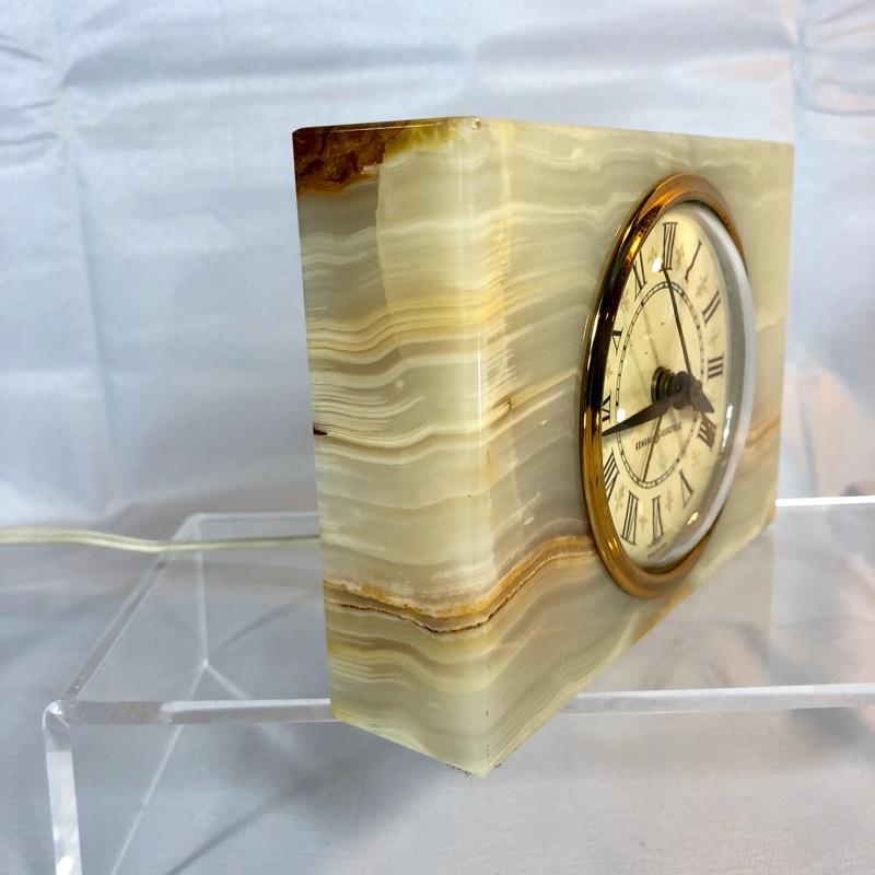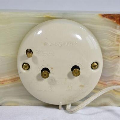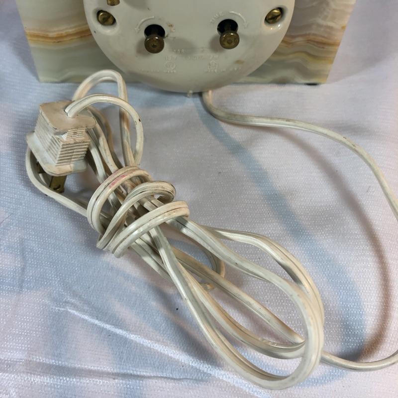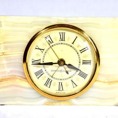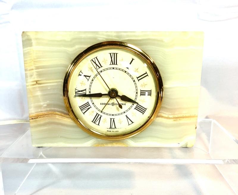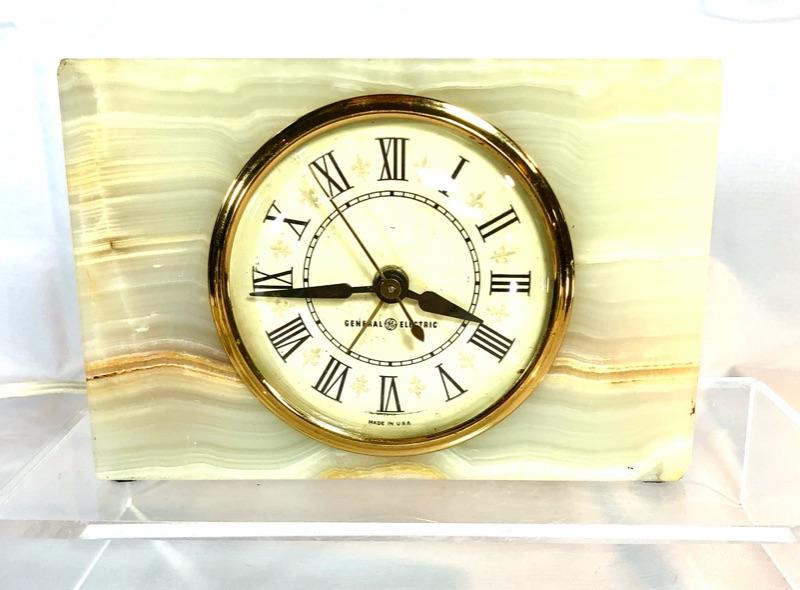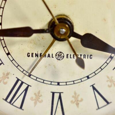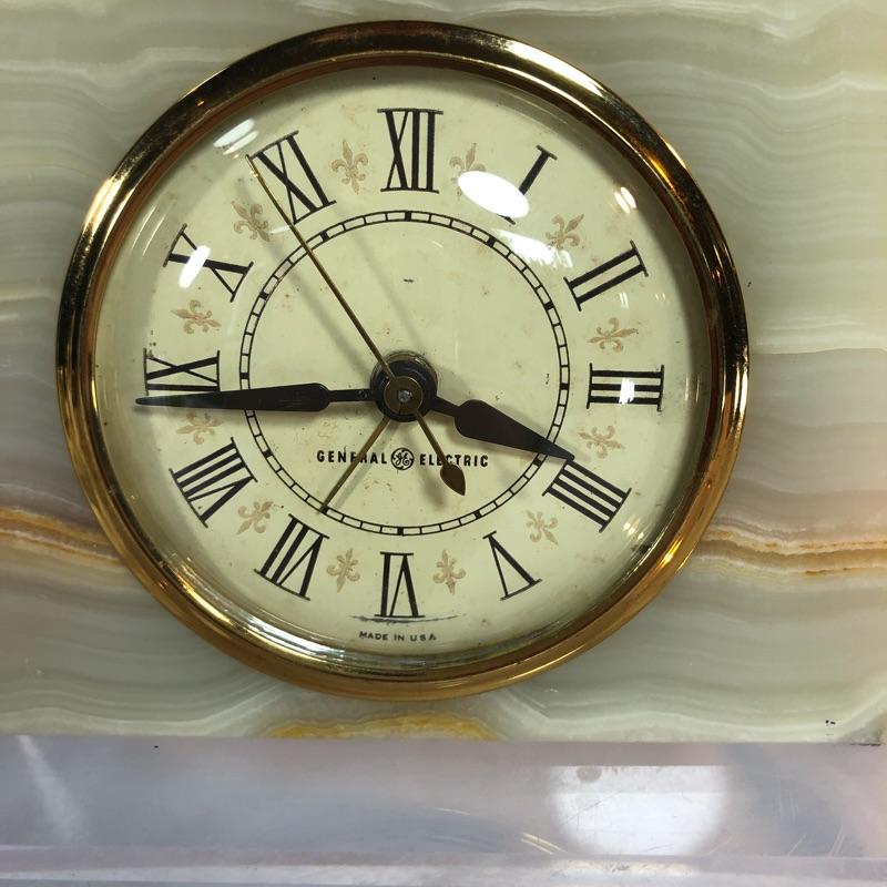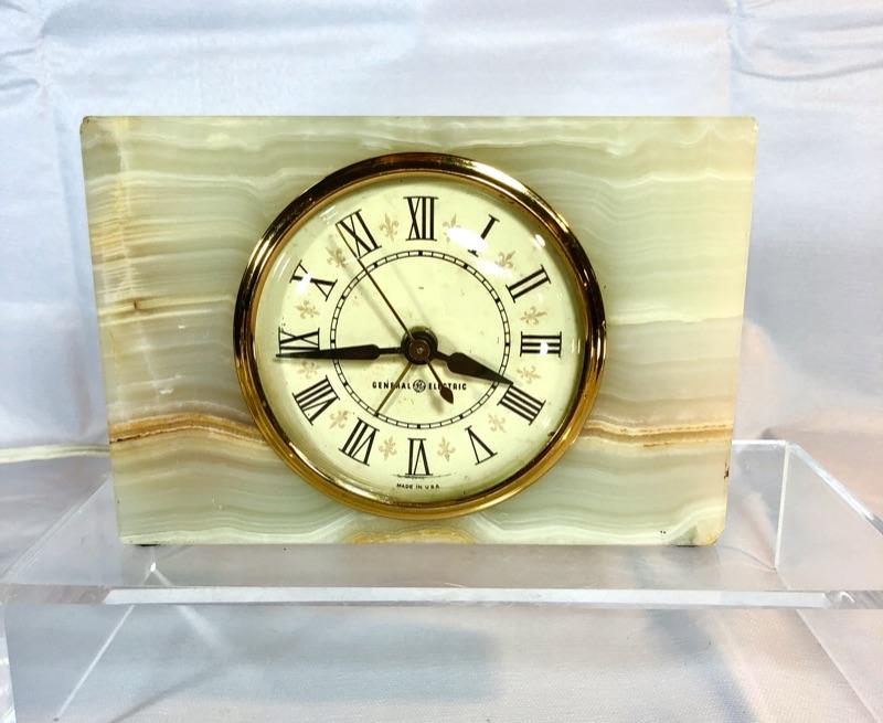 General Electric Clock Model 7266. Set in marble with high contrast veins. Electric. Cord in good condition and keeping time well when tested. One corner is rounded where marble was chipped (see photos).