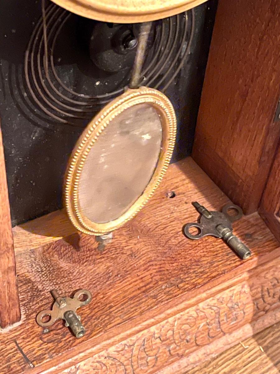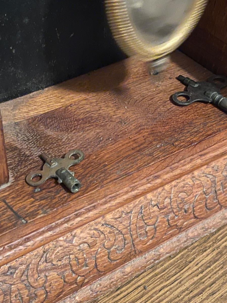 Sweet mantle clock. It has both keys. I did get it going but it only worked for about 10 minutes so this clock may need some adjusting. The chime only worked on the half hour. I believe something is lose and the chime didn’t work on the hour. Still a lovely piece and I’m sure it could be fixed by someone who knows the inner workings of clocks.