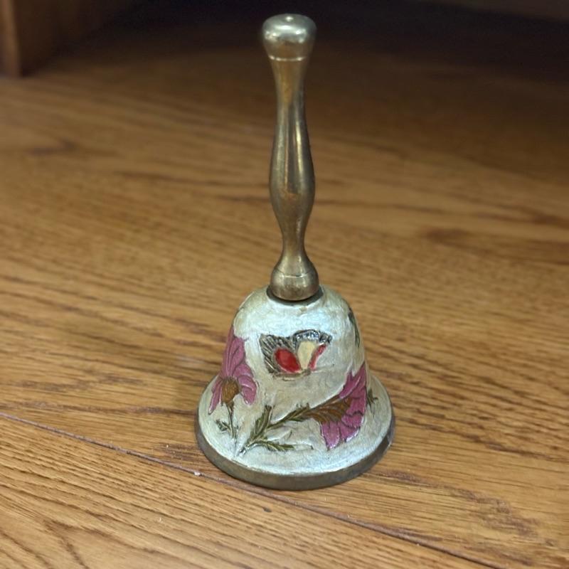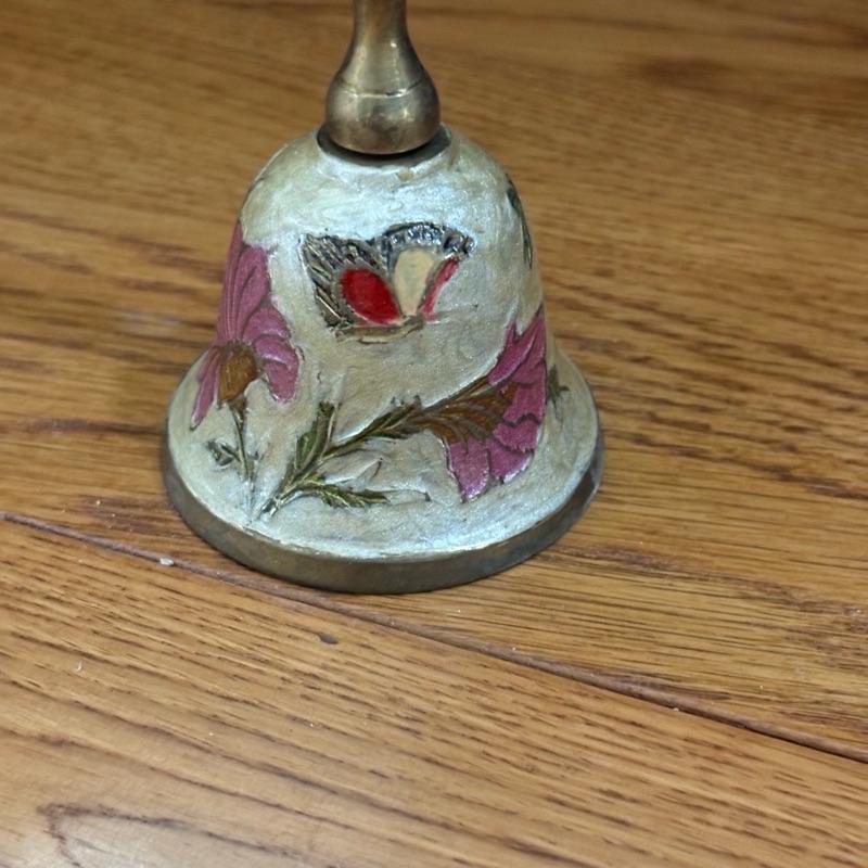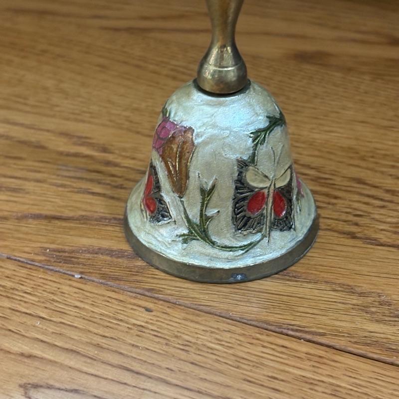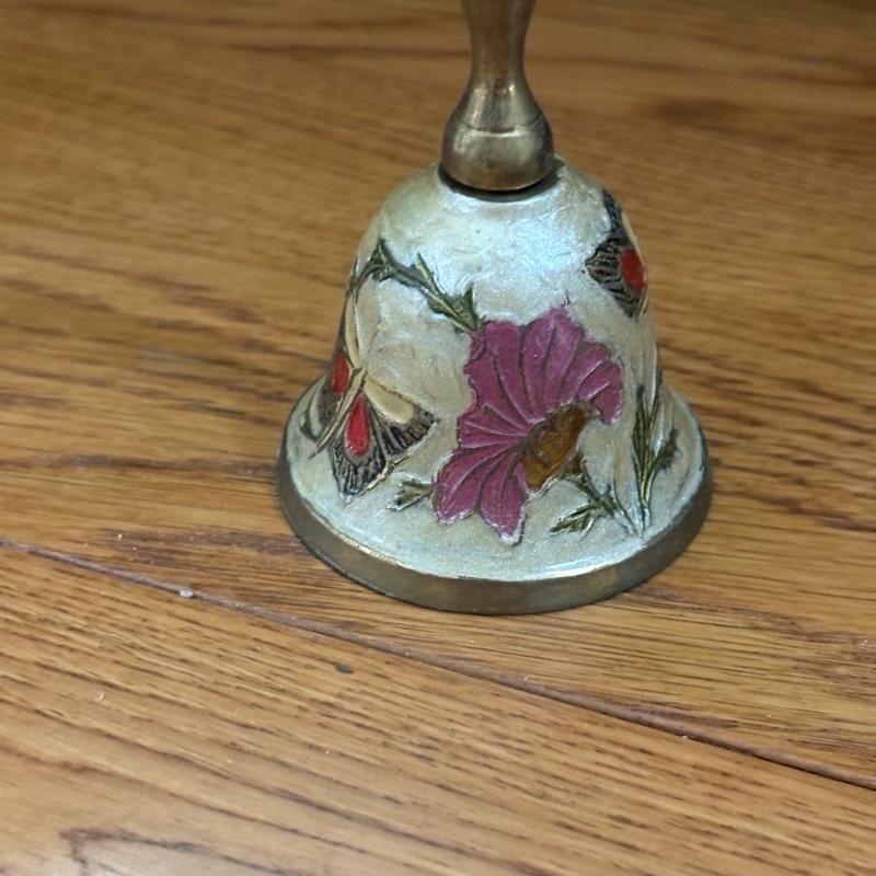 This is a vintage brass hand bell, likely made in India, featuring enameled floral and butterfly designs.