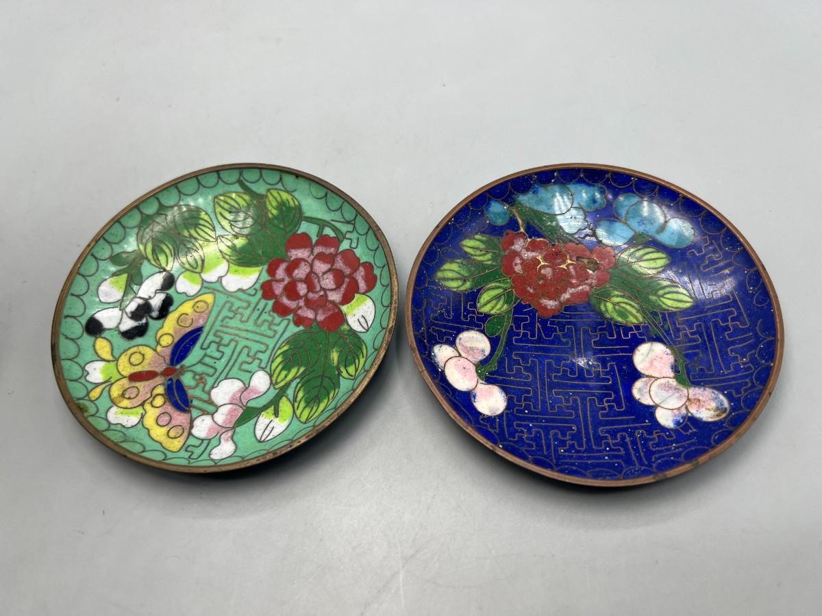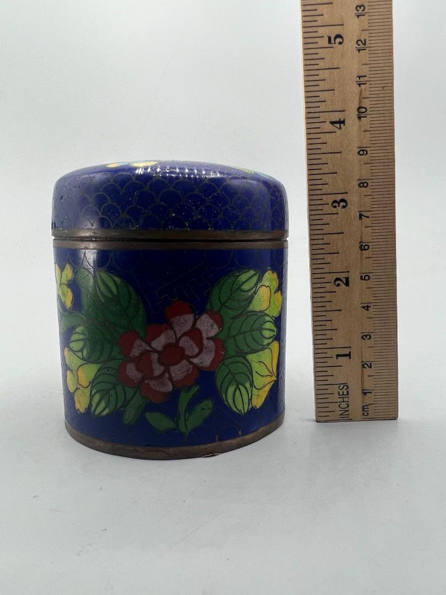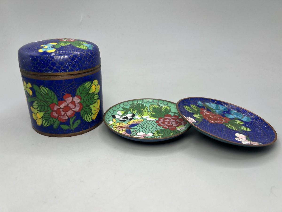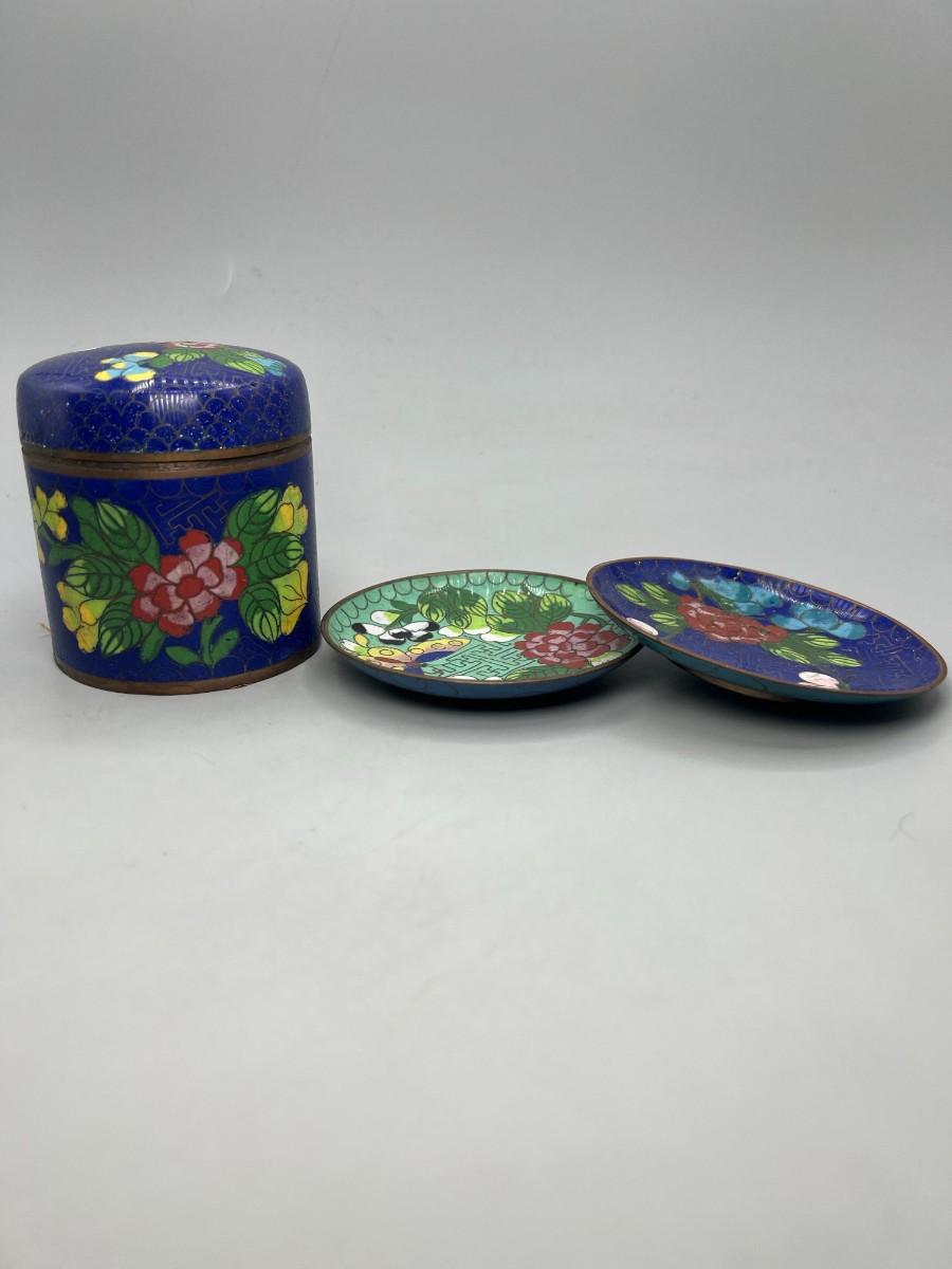 Vintage Cloisonné Metalwork Oriental Floral Designs Lidded Jar & Saucers