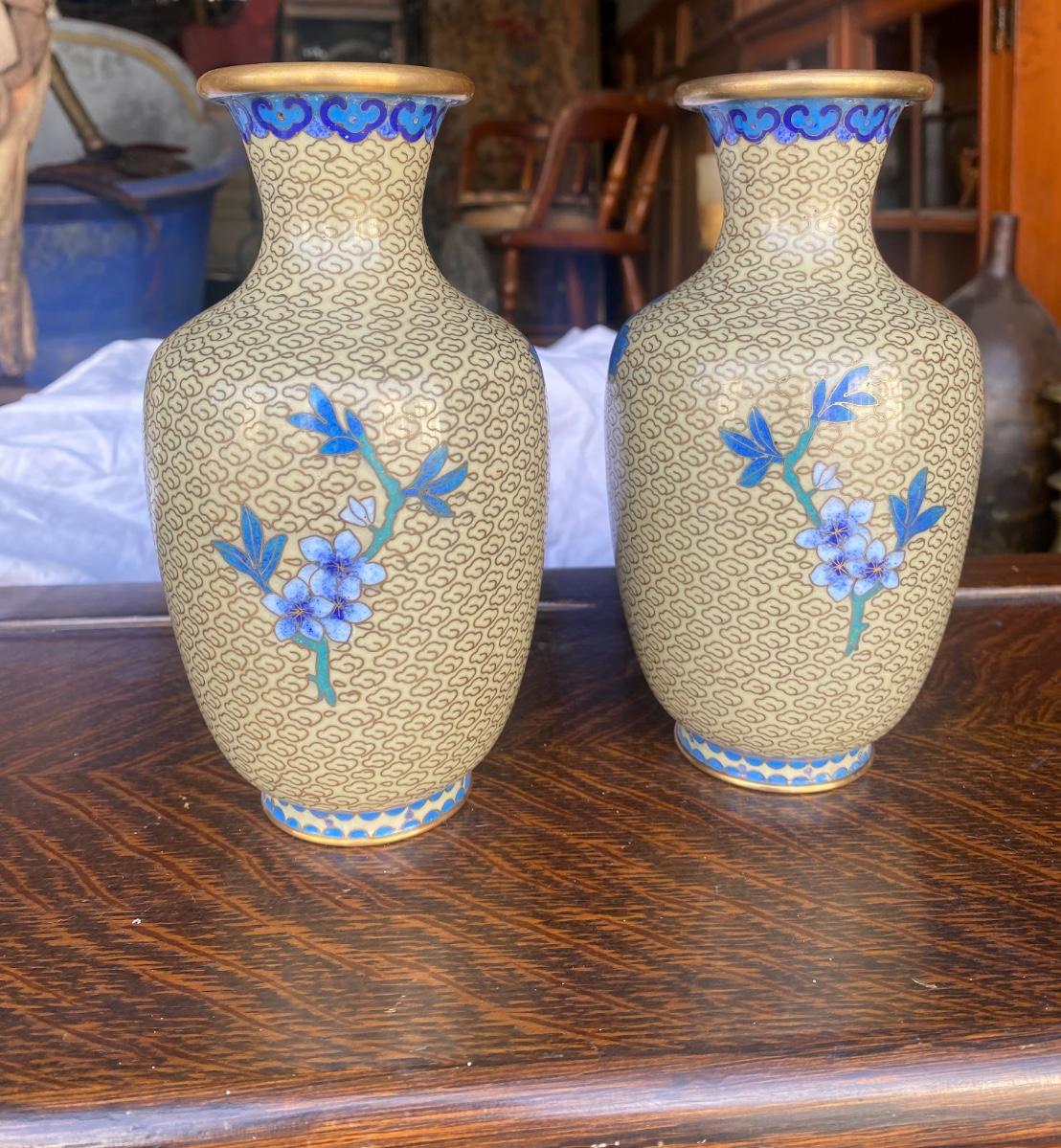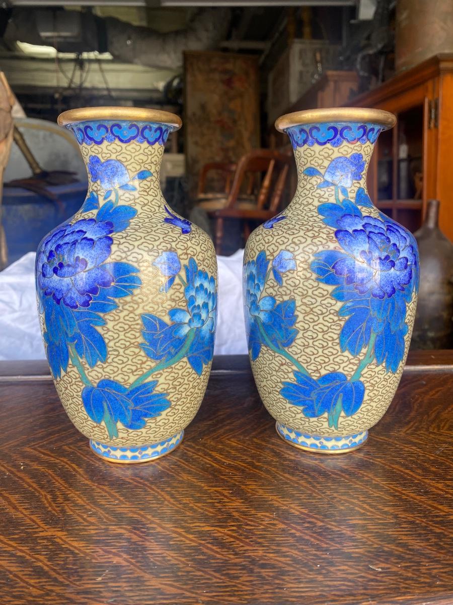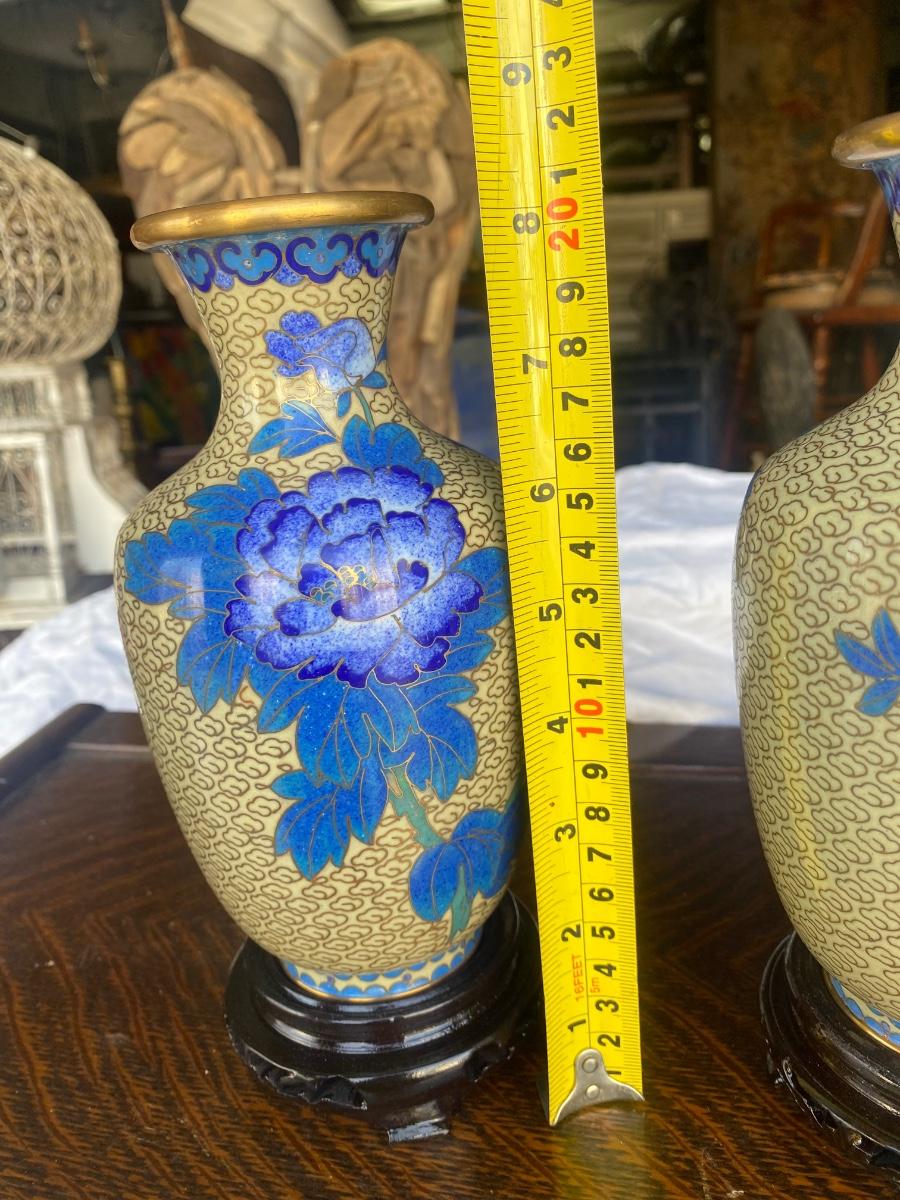 Pair of vintage cloisonne enamel brass vase, blue floral design, come with wood bases. Some small signs of wear along botton upper rim, but in overall excellent condition.