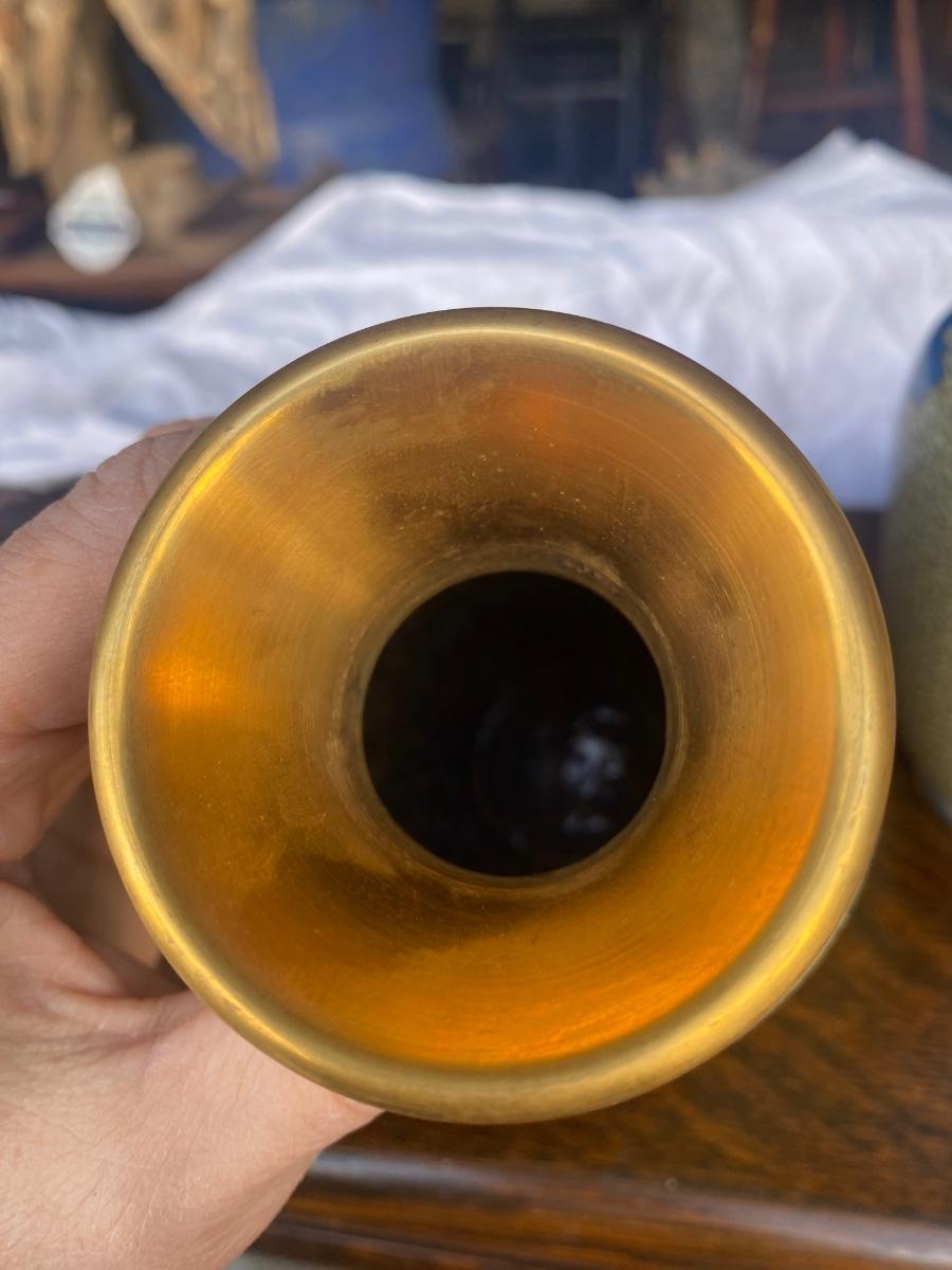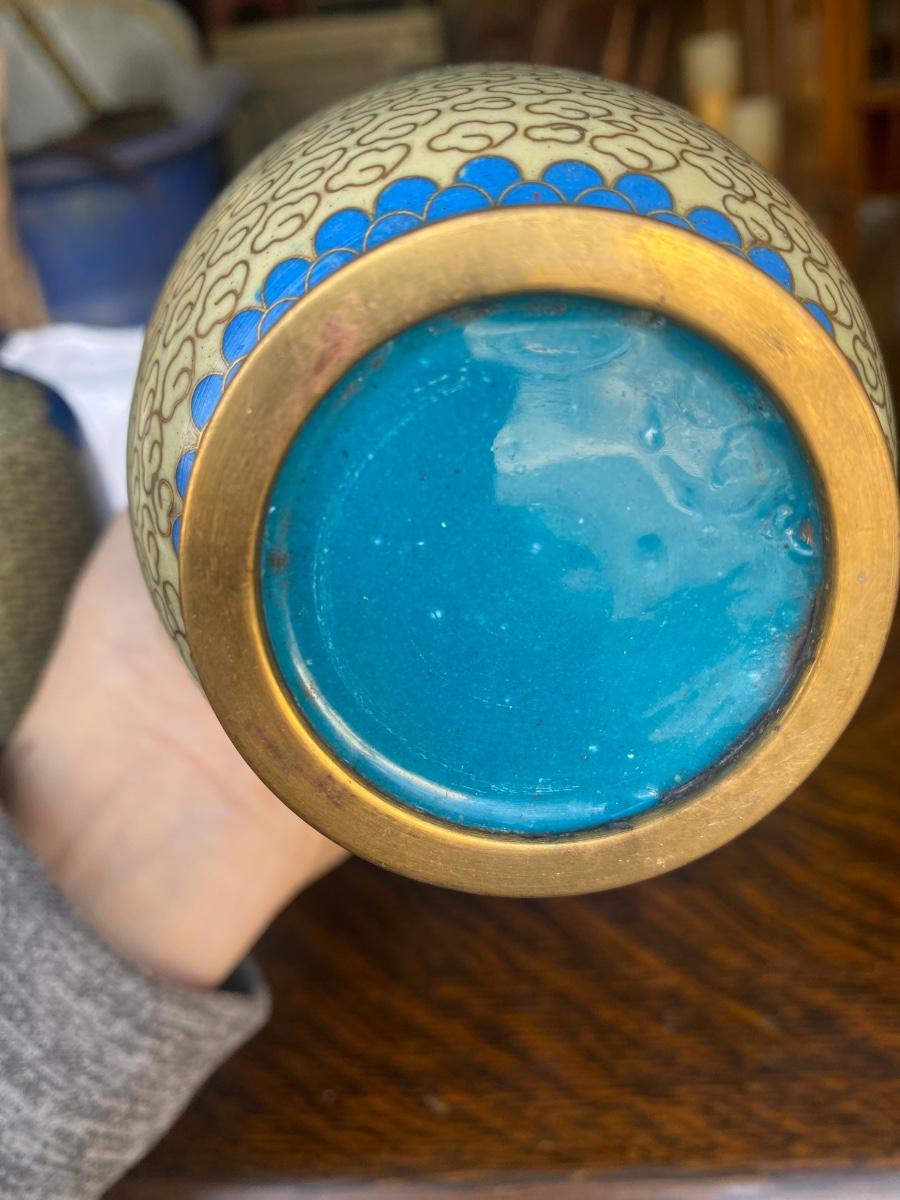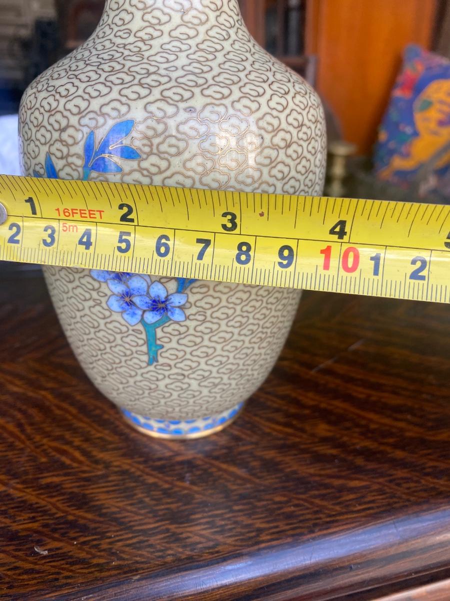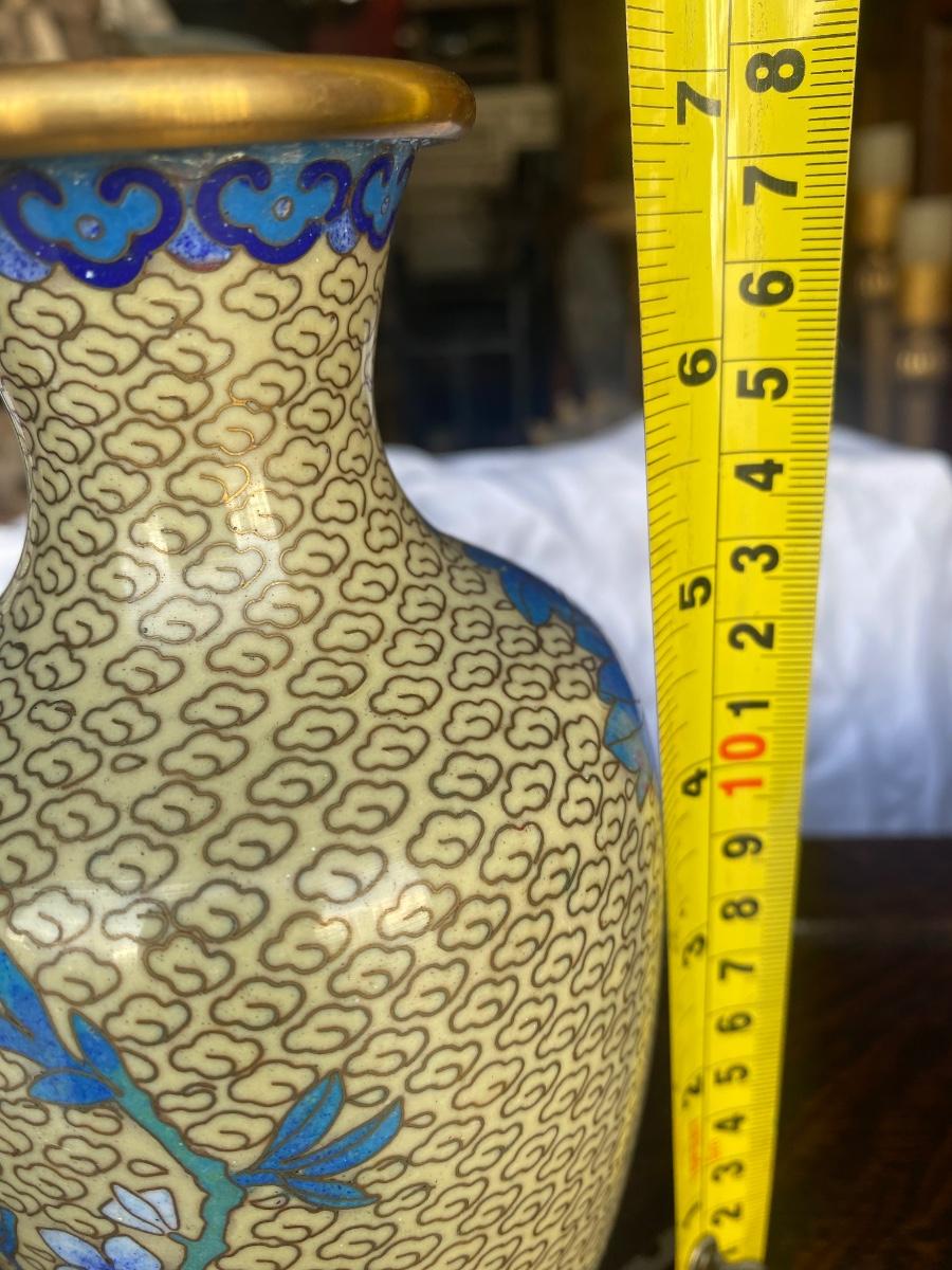 Pair of vintage cloisonne enamel brass vase, blue floral design, come with wood bases. Some small signs of wear along botton upper rim, but in overall excellent condition.