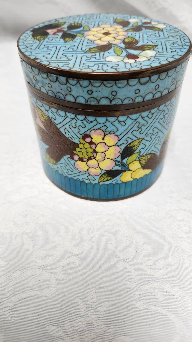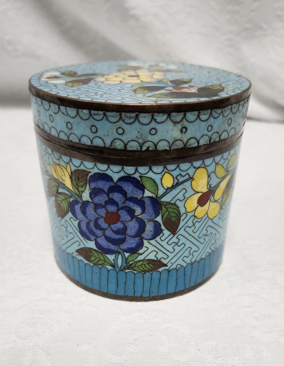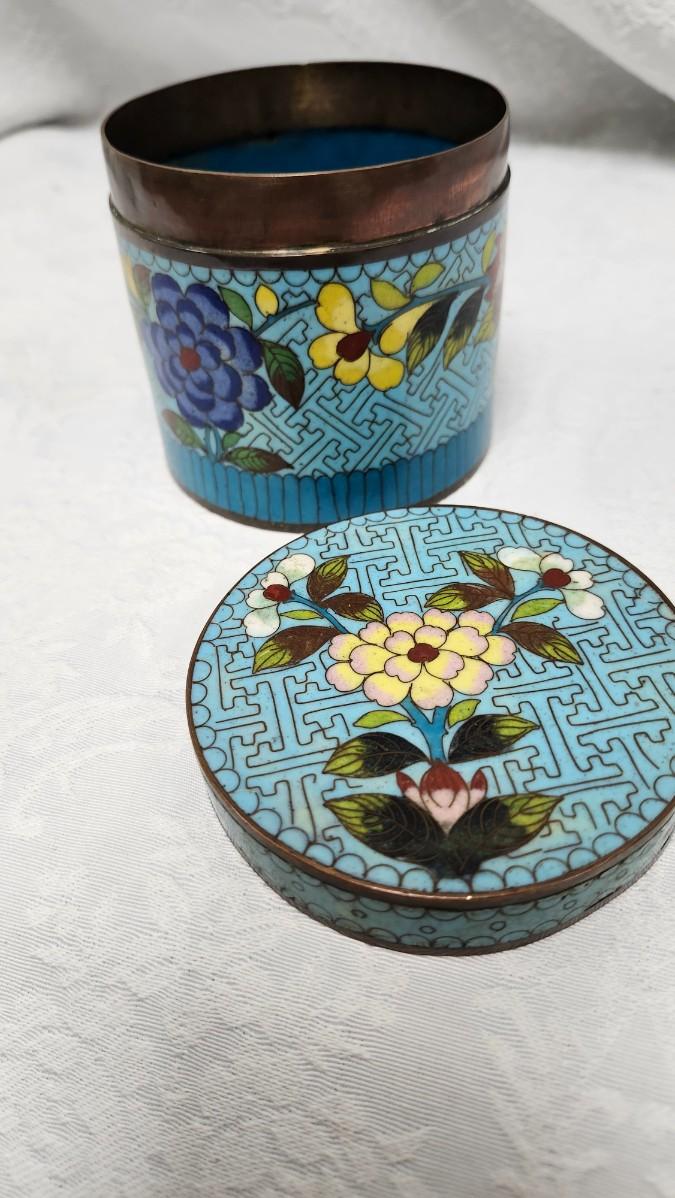3 " tall, 3.5" diameter. Turquoise enamel with flowers around the circumference, turquoise enamel lining.