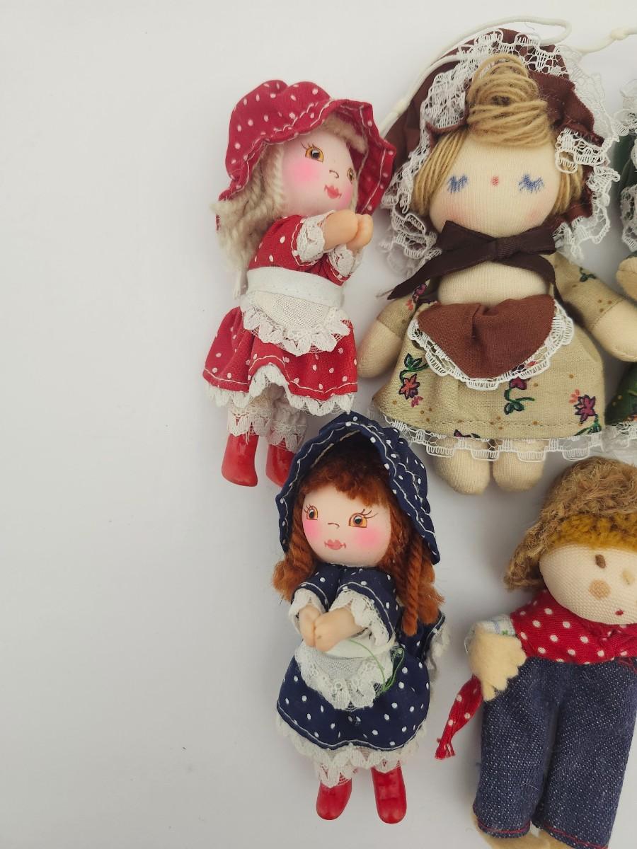 Mixed lot of mini cloth rag dolls with fabric bodies, yarn hair, and sewn clothing. Includes several girl dolls wearing bonnets, dresses, and aprons, along with one boy doll in fabric pants and scarf. Soft sculpted forms with painted or stitched facial features. Unmarked examples with handmade or craft style construction. No maker or origin indicated. Sold together as a single lot exactly as shown.