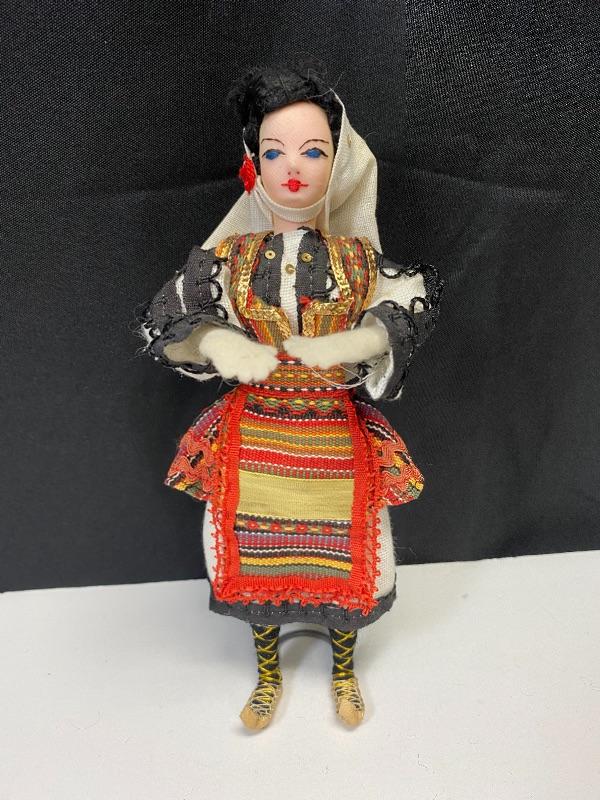 Vintage Spanish style lady doll. Cloth doll with stitched facial features. Moveable arms. About 8" tall. She has a built in stand at her feet. A few discolored speckles in cloth.