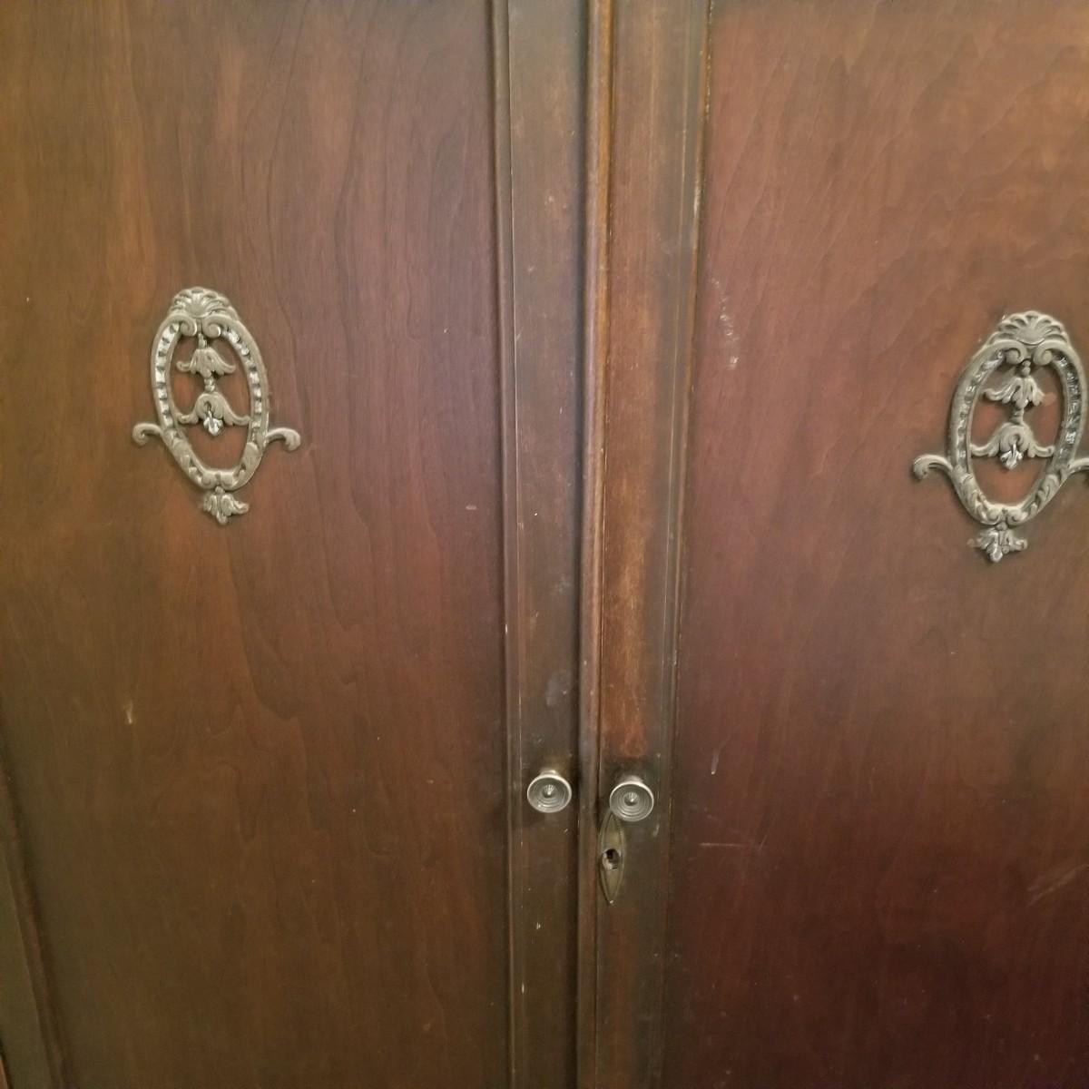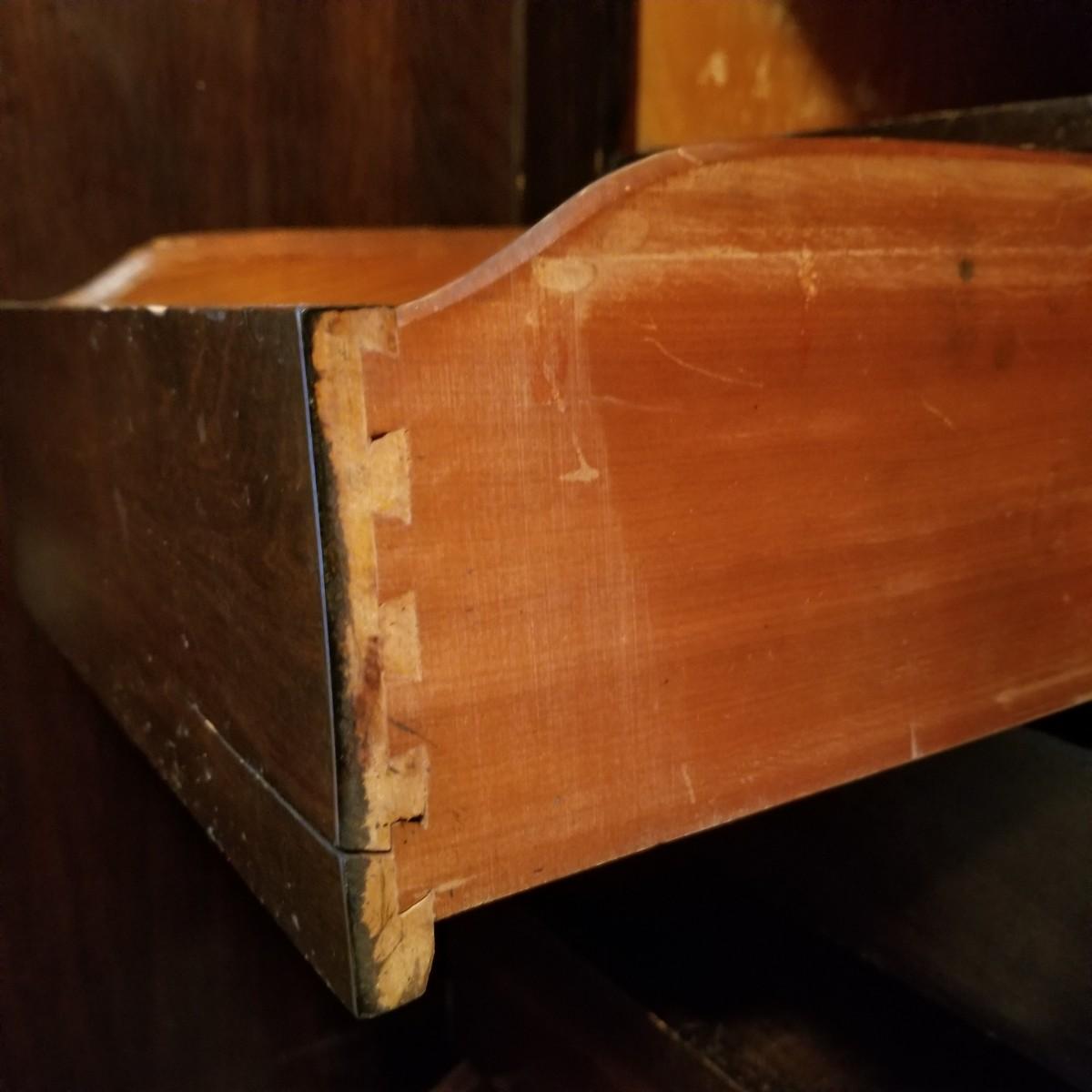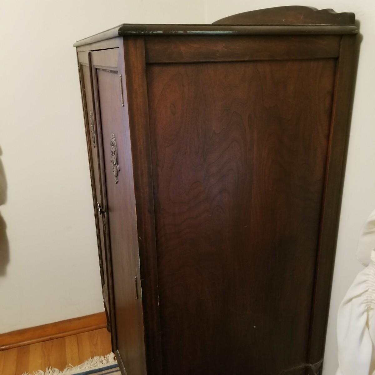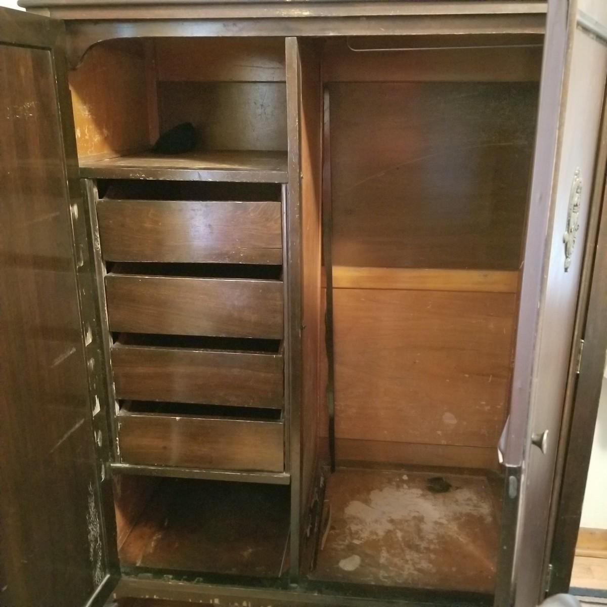 A vintage clothing storage wardrobe with a hanging bar and four pull out drawers. Double doors at front, full length hanging at right and drawers to left. Dovetail corners on drawers. Some detached pieces of trim and quite a bit of wear inside, see photos for details. 40" x 22" x 60".