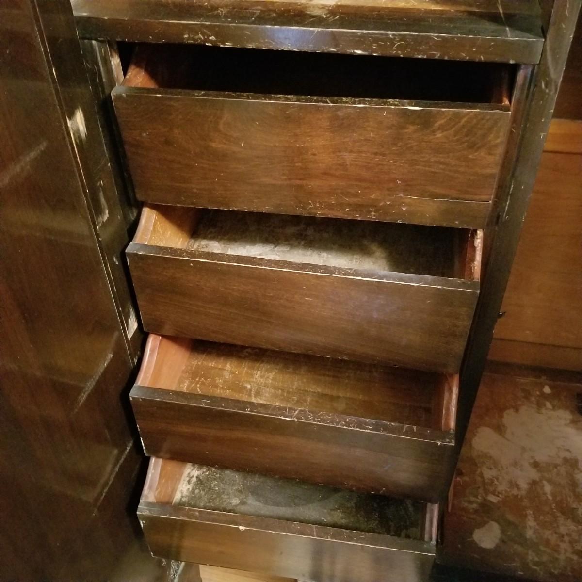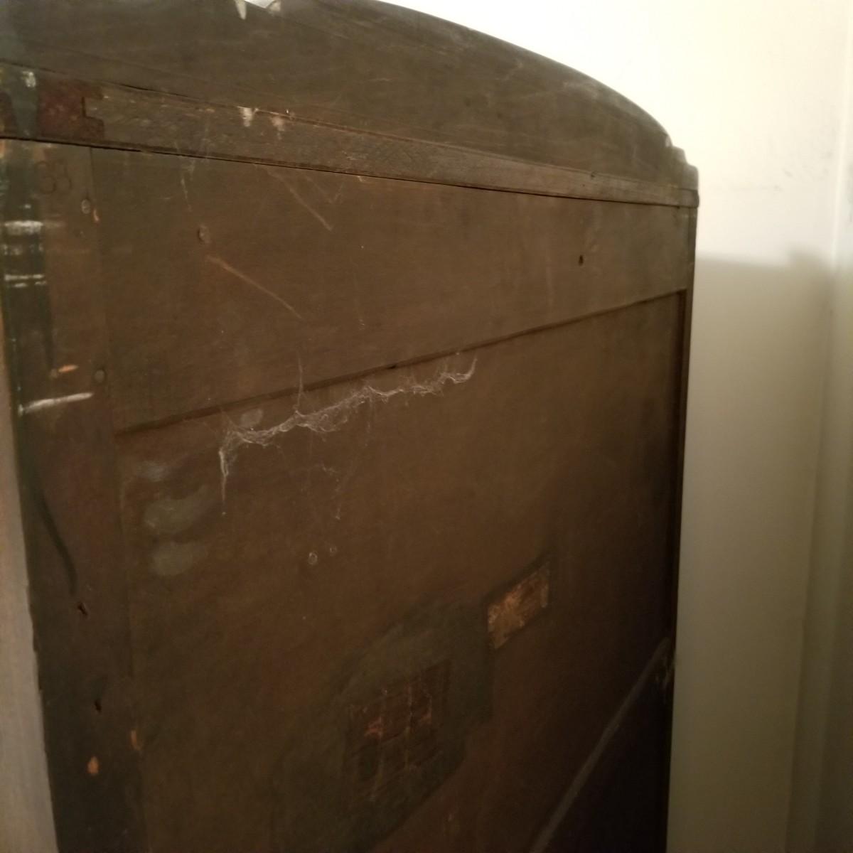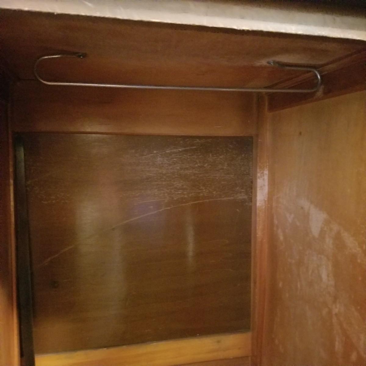 A vintage clothing storage wardrobe with a hanging bar and four pull out drawers. Double doors at front, full length hanging at right and drawers to left. Dovetail corners on drawers. Some detached pieces of trim and quite a bit of wear inside, see photos for details. 40" x 22" x 60".