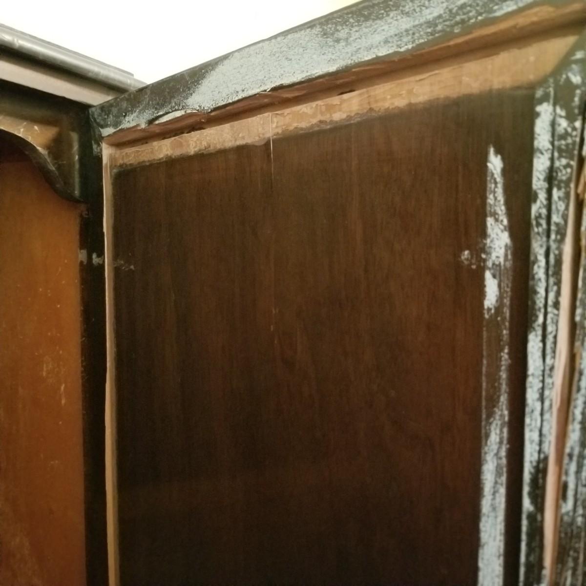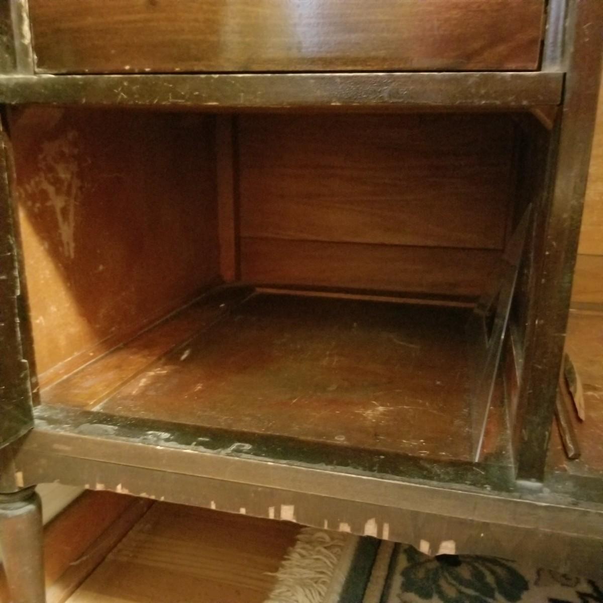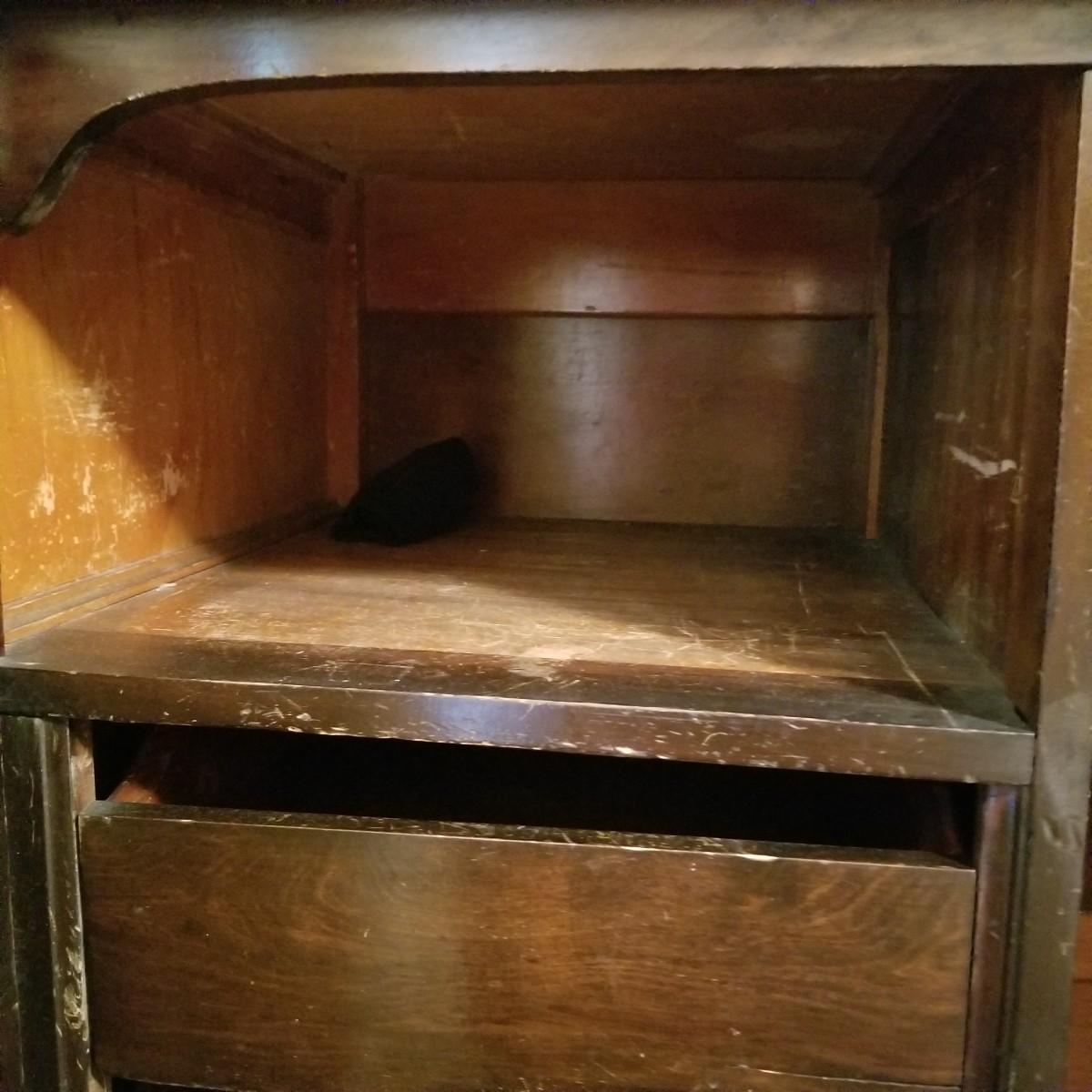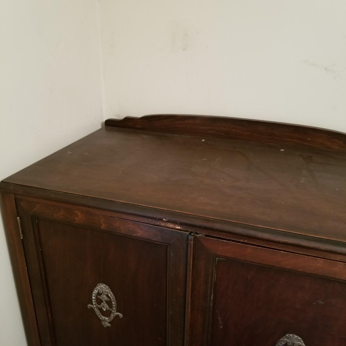 A vintage clothing storage wardrobe with a hanging bar and four pull out drawers. Double doors at front, full length hanging at right and drawers to left. Dovetail corners on drawers. Some detached pieces of trim and quite a bit of wear inside, see photos for details. 40" x 22" x 60".