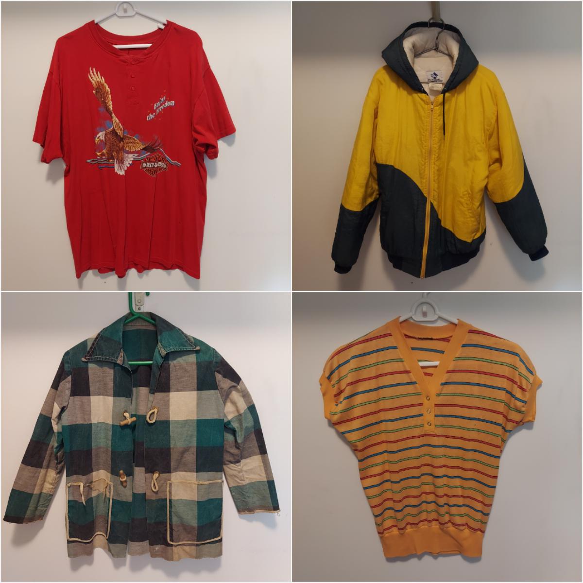 Several pieces of mixed vintage clothing. Some are true vintage, some are 80s/90s pieces. The Harley Davidson tee and the FAA tee have single stitch hems. Some items have condition issues due to age and wear. Sizes vary. Please see photos for details. Shipping available