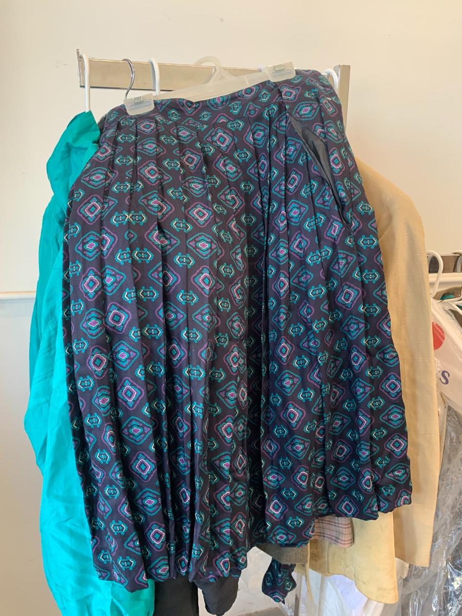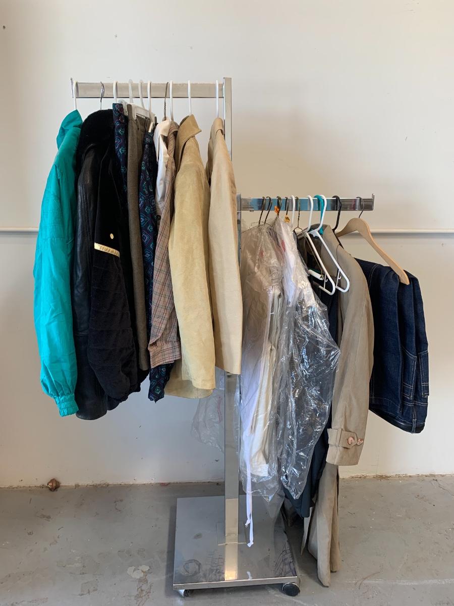 An assortment of vintage clothing including coats, blazers, jeans and more! All in good to great condition. *Metal rack NOT included